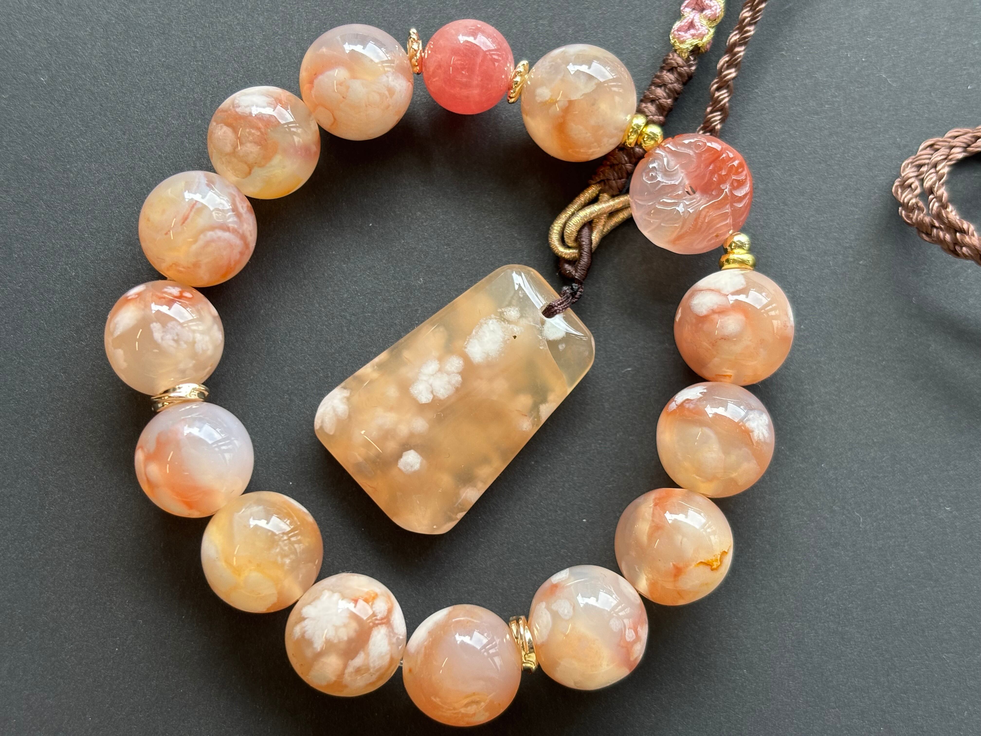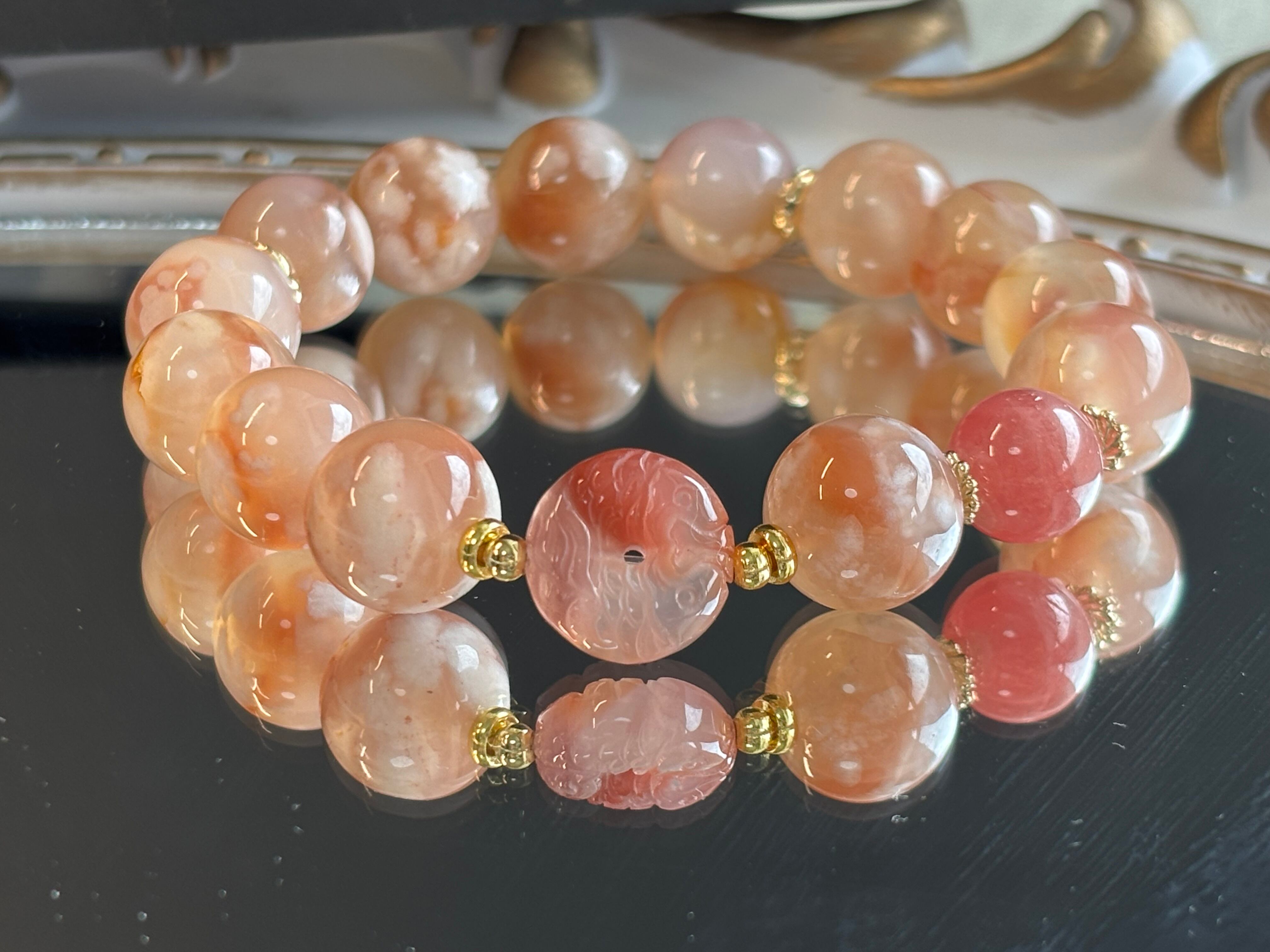 高品質の透け感が美しく内包物の桜も沢山入った桜瑪瑙のブレスレットに高品質のインカローズをポイントにトップは南紅瑪瑙の夫婦鯉でグラデーションの色合いがとっても可愛く 春が香って来るような優しい色合いのブレスレットになりました(*´▽`*)