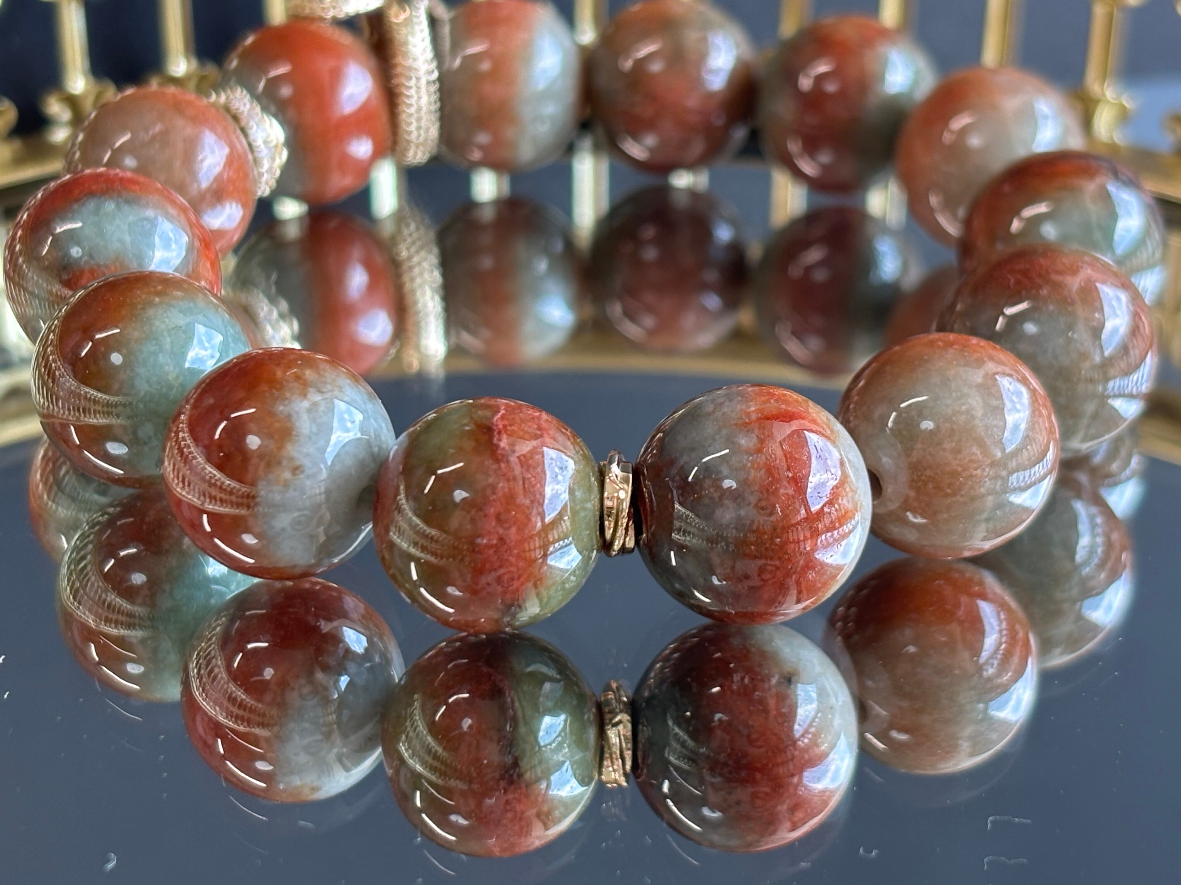 鑑別書では詳しい共生鉱物までは分からないのですが、石の色合いや仕入れの情報から見て、翡翠にシナバー(辰砂)が共生しているんじゃないかなと思っています。深みのある赤とグリーンの混ざり方がとっても魅力的で、見れば見るほど味わいがあります。