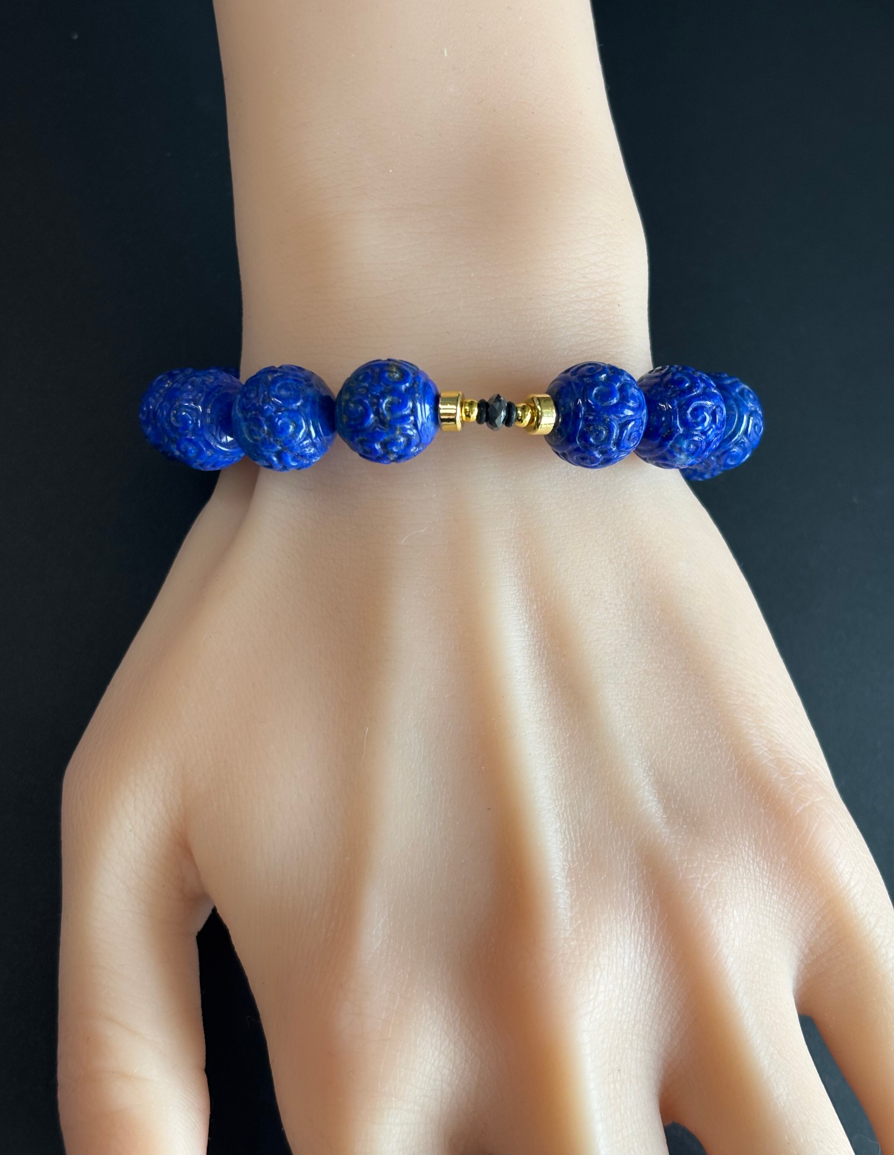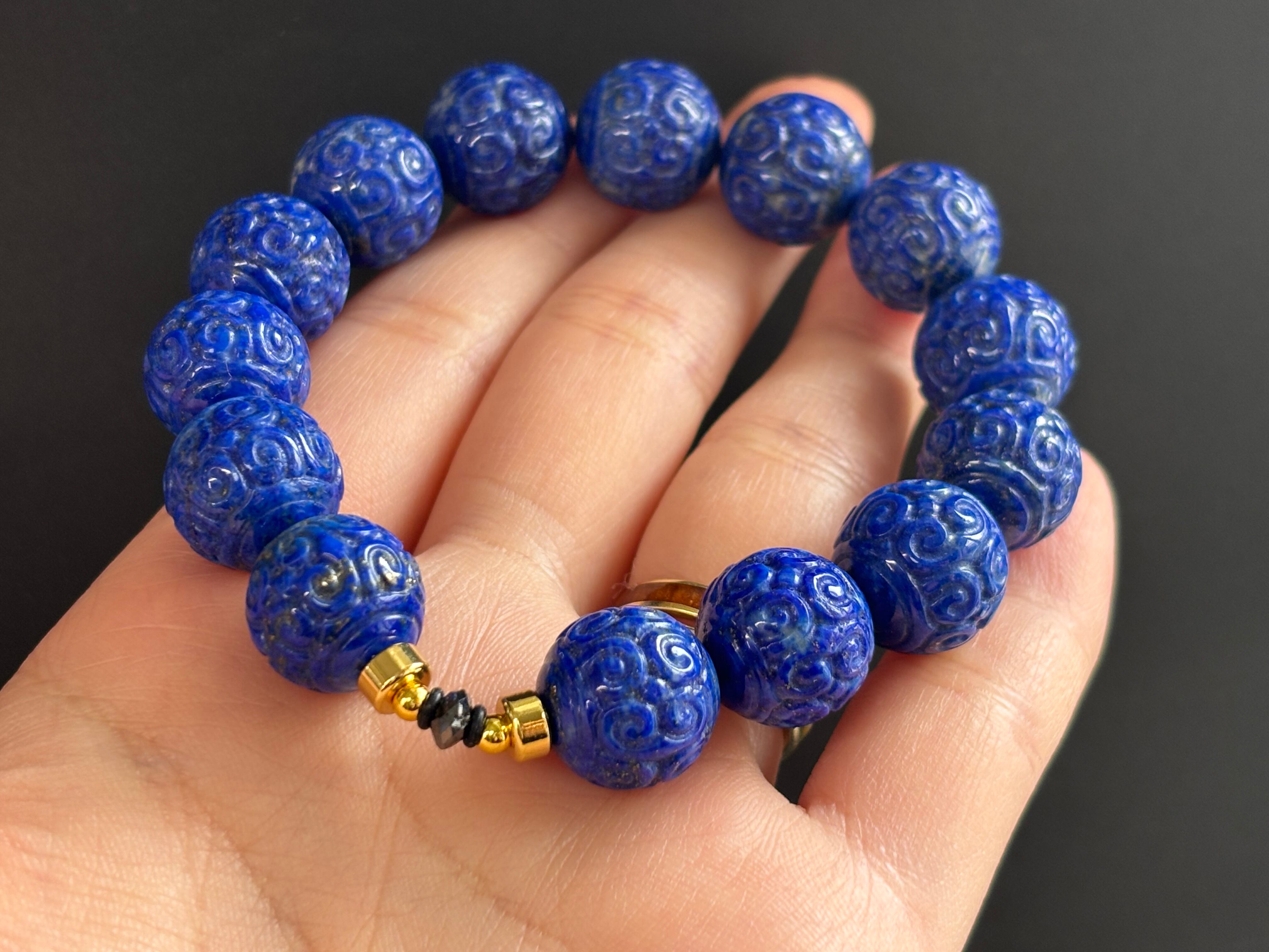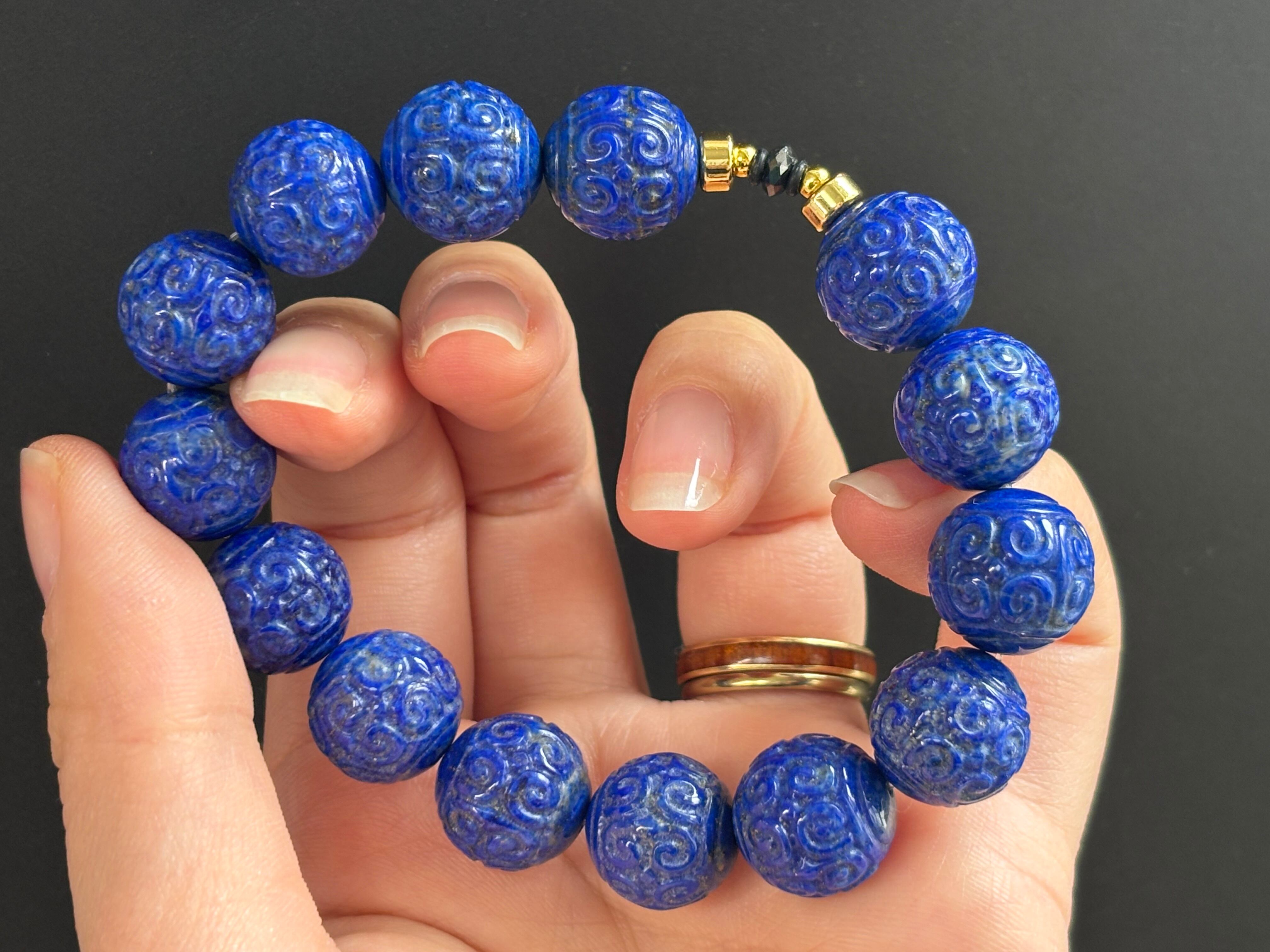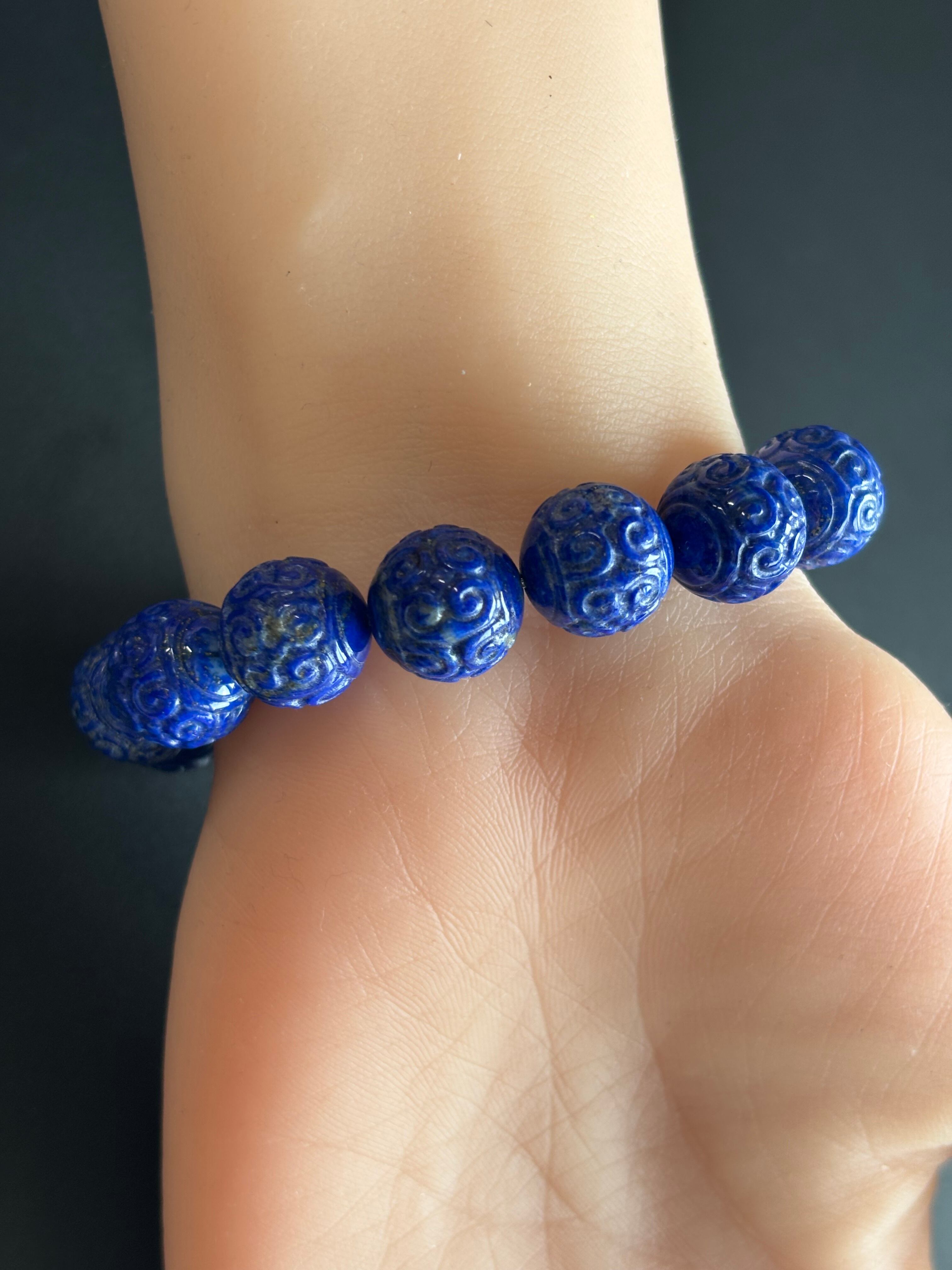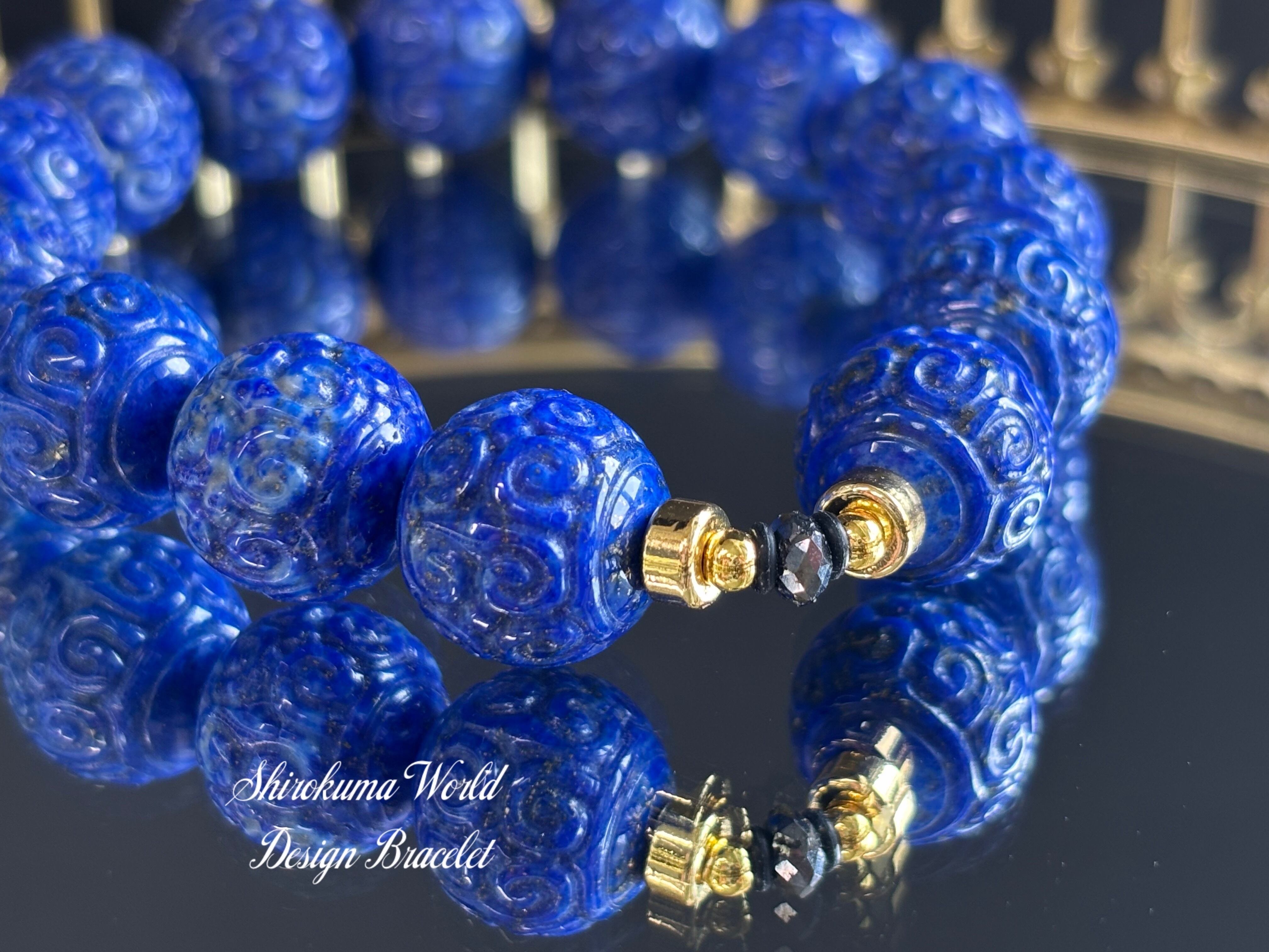 深い瑠璃色と繊細な彫刻が美しいラピスラズリの回文殊ブレスレット。
