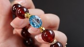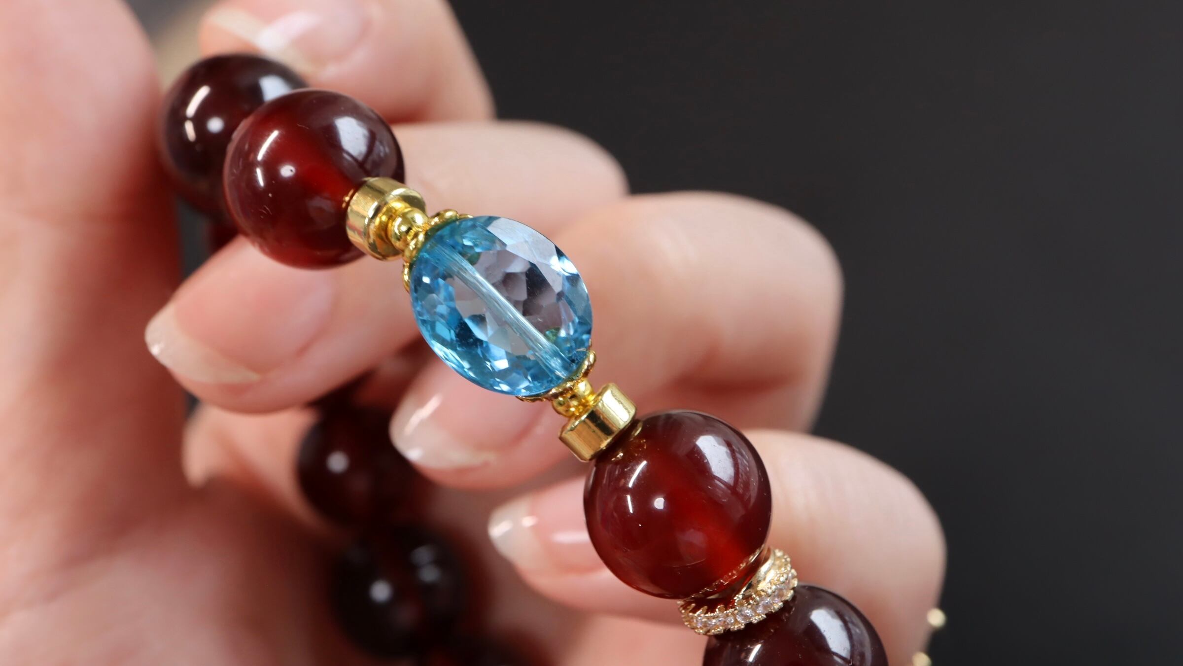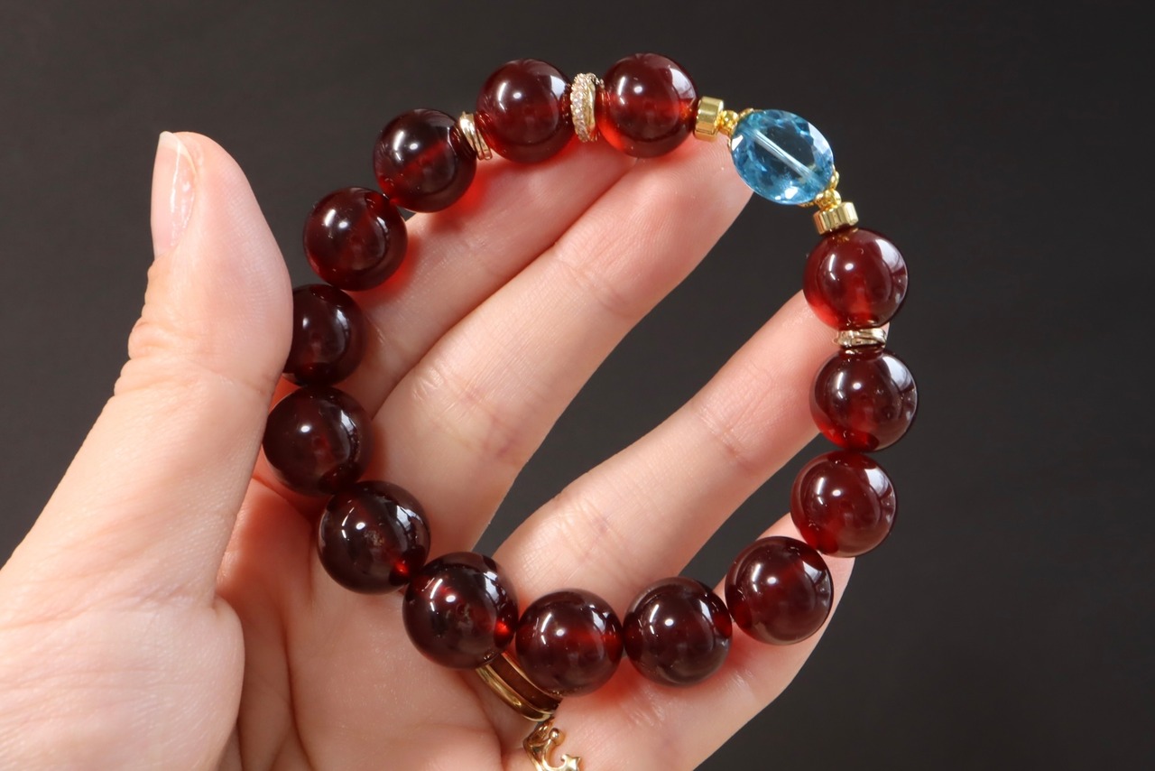 透明度の高いスイスブルートパーズのルースに貫通穴を空けトップにあしらい深い赤が美しい希少な大粒のガーネットを使用したラグジュアリーなブレスレットになりました(* ˊ꒳ˋ*)