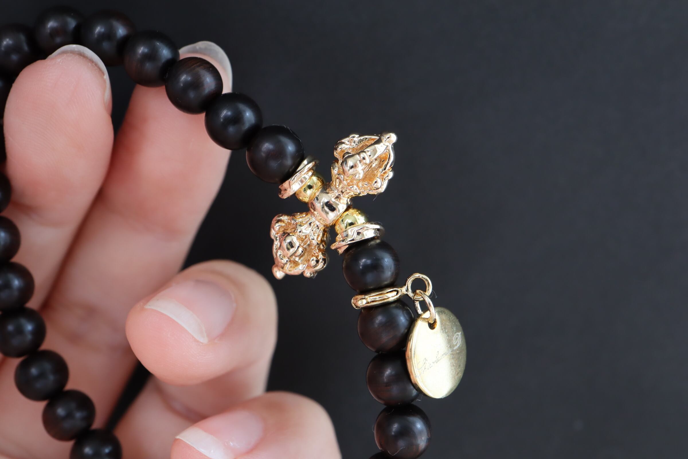 中央にはチベット密教の法具である「バジュラ(ヴァジュラ)」パーツを使用。バジュラは、煩悩や邪気を打ち砕き、揺るがない心や強さを象徴するとされています。崖柏とバジュラの組み合わせは、心身の浄化や守護のお守りとしておすすめです。