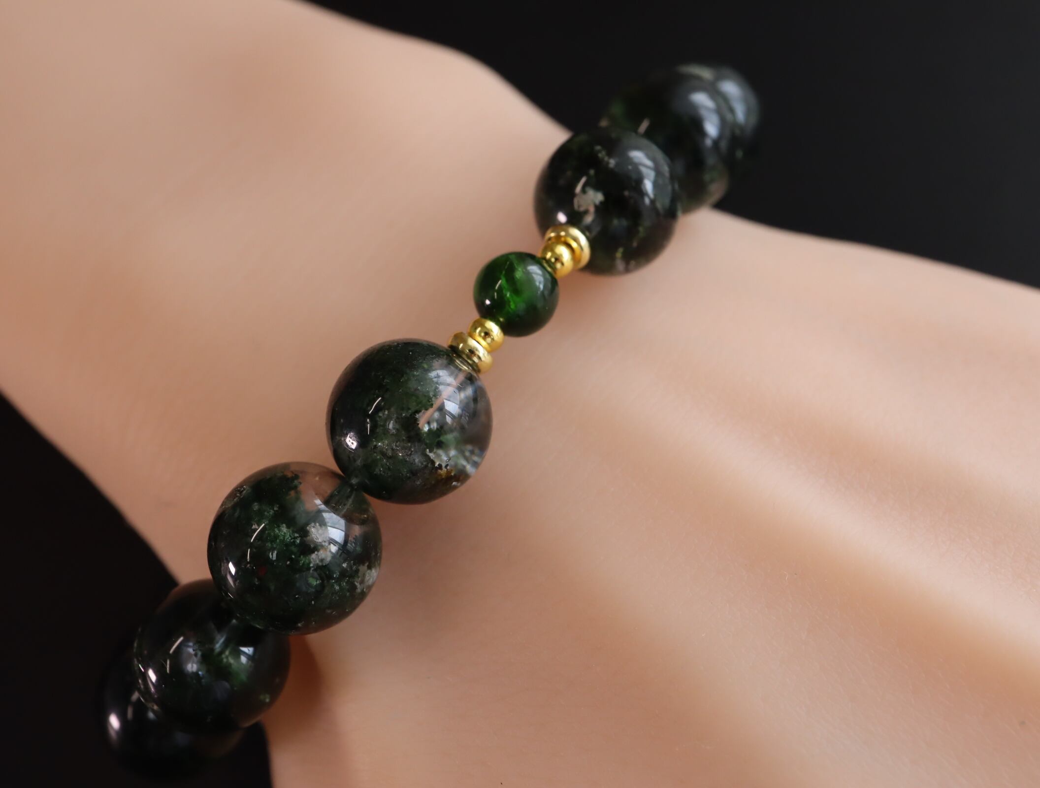 深みのあるグリーンのガーデンクォーツに、鮮やかなクロムダイオプサイトをポイントに添えたデザインブレスレット。