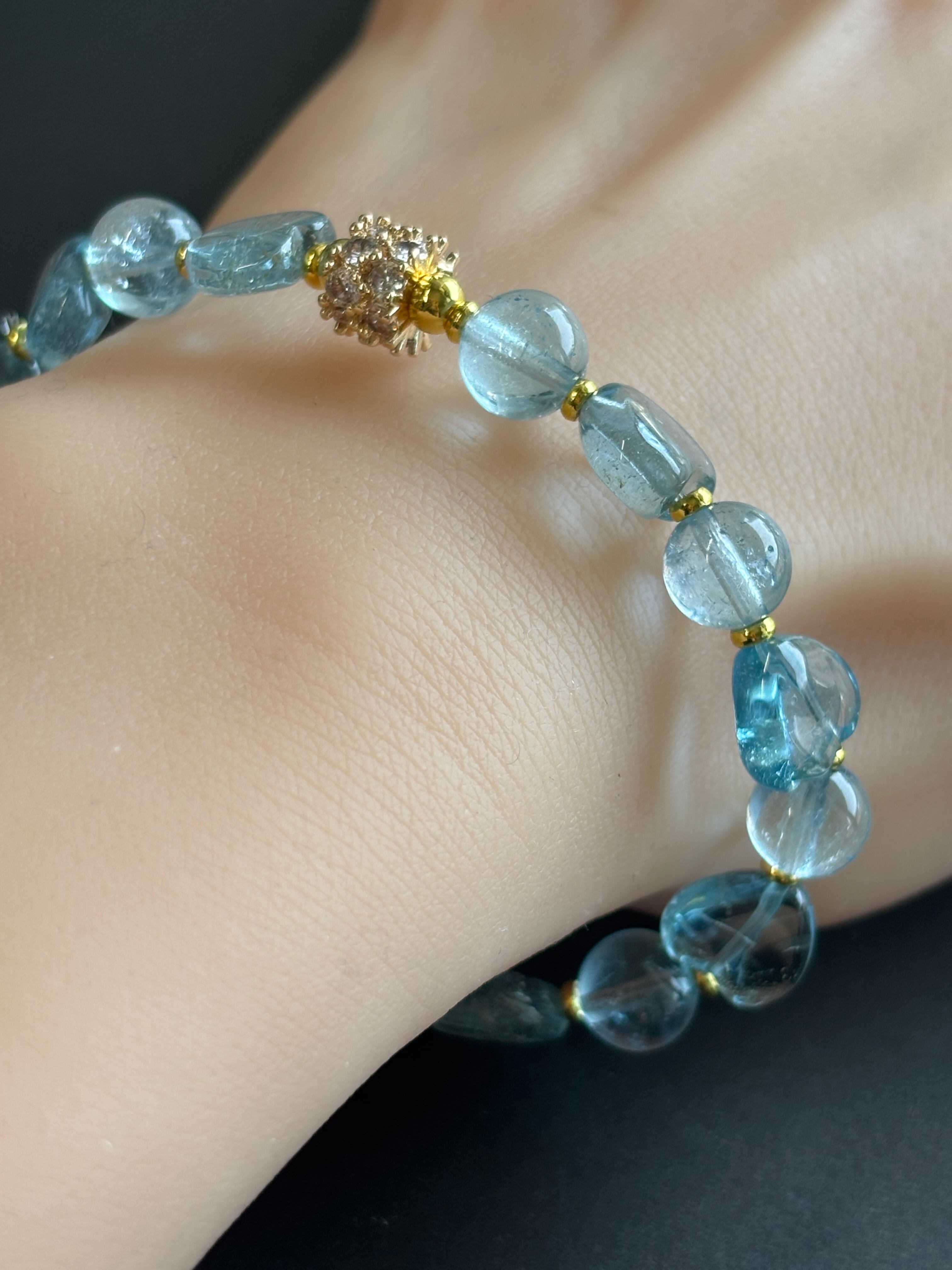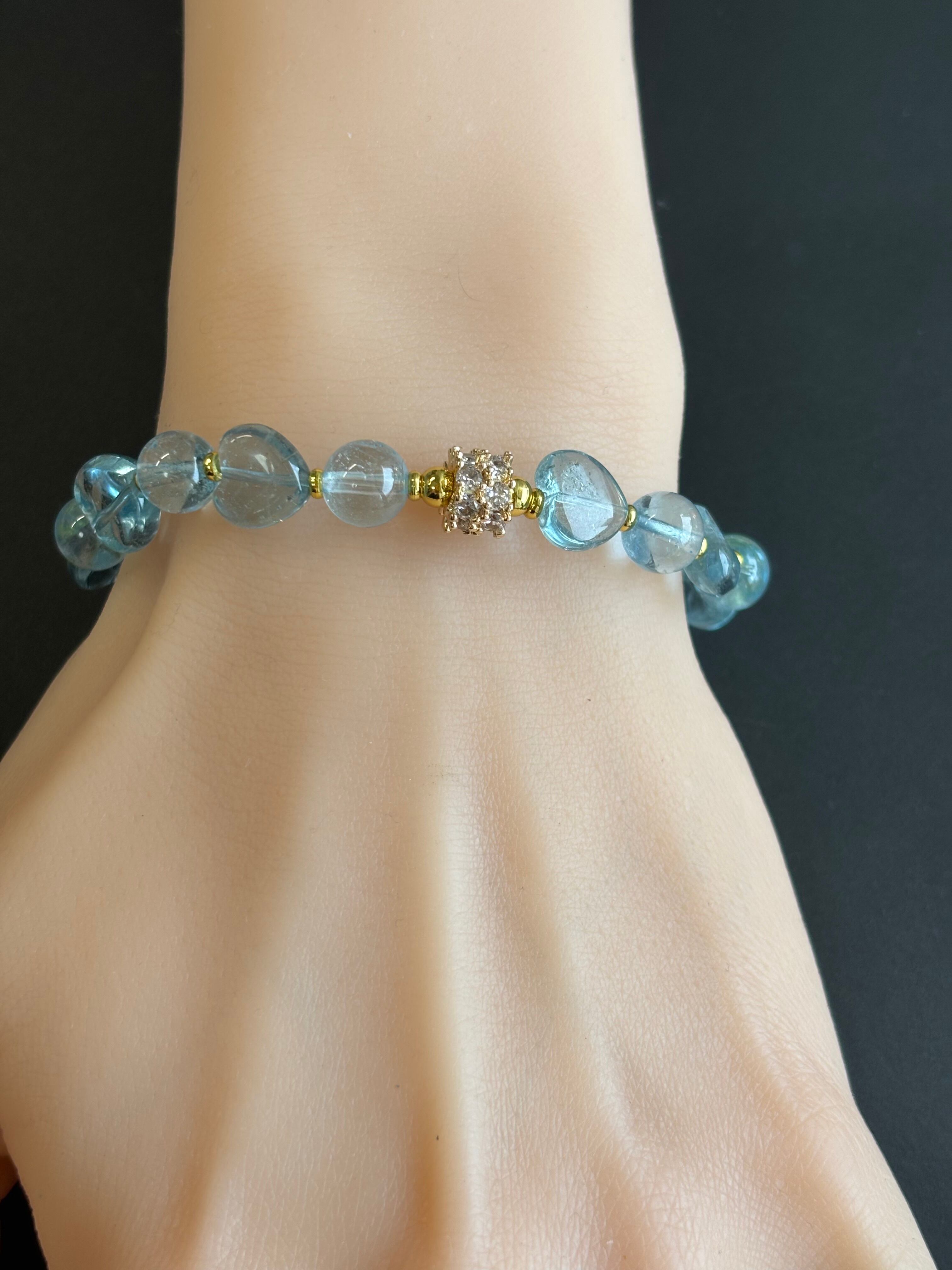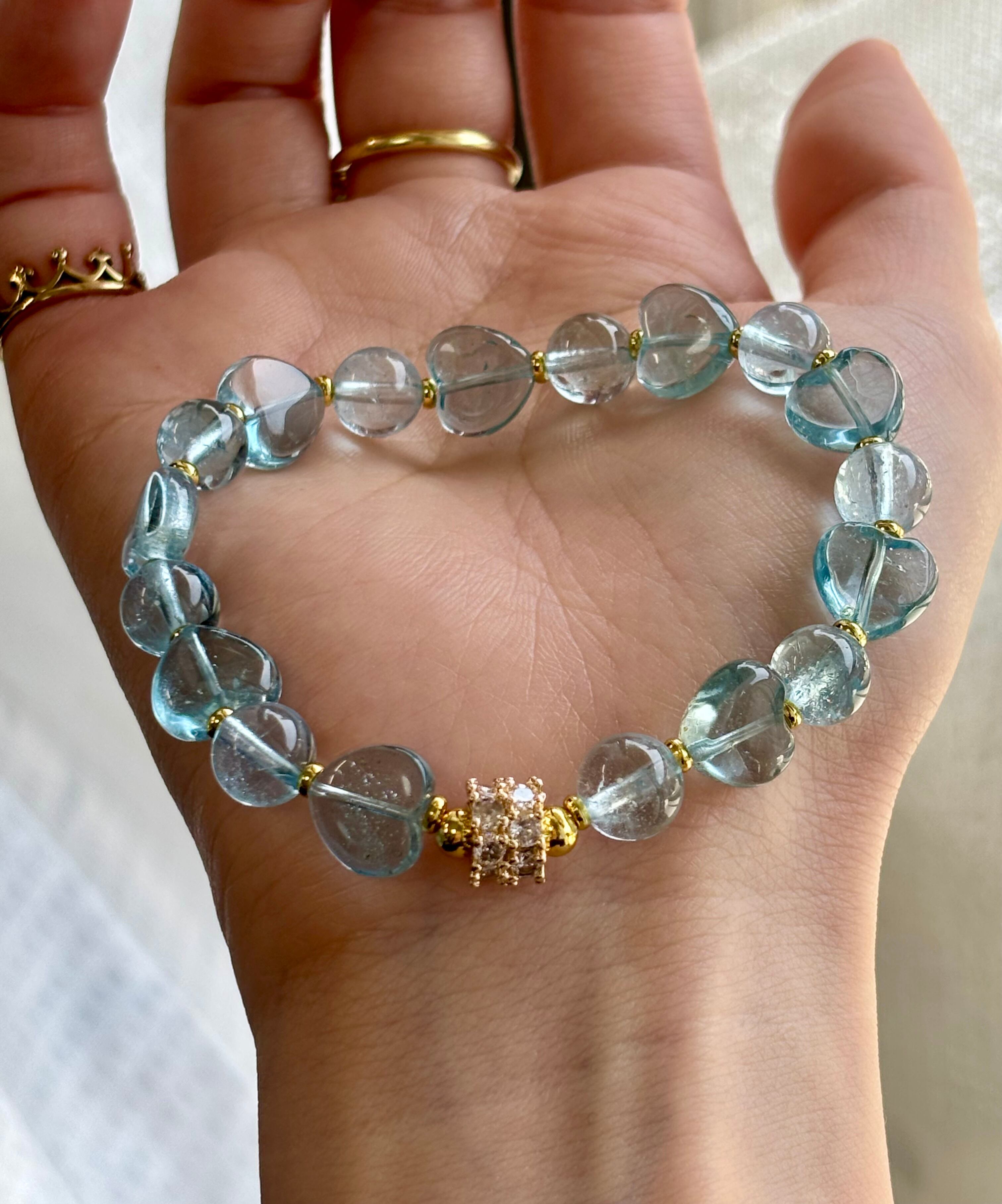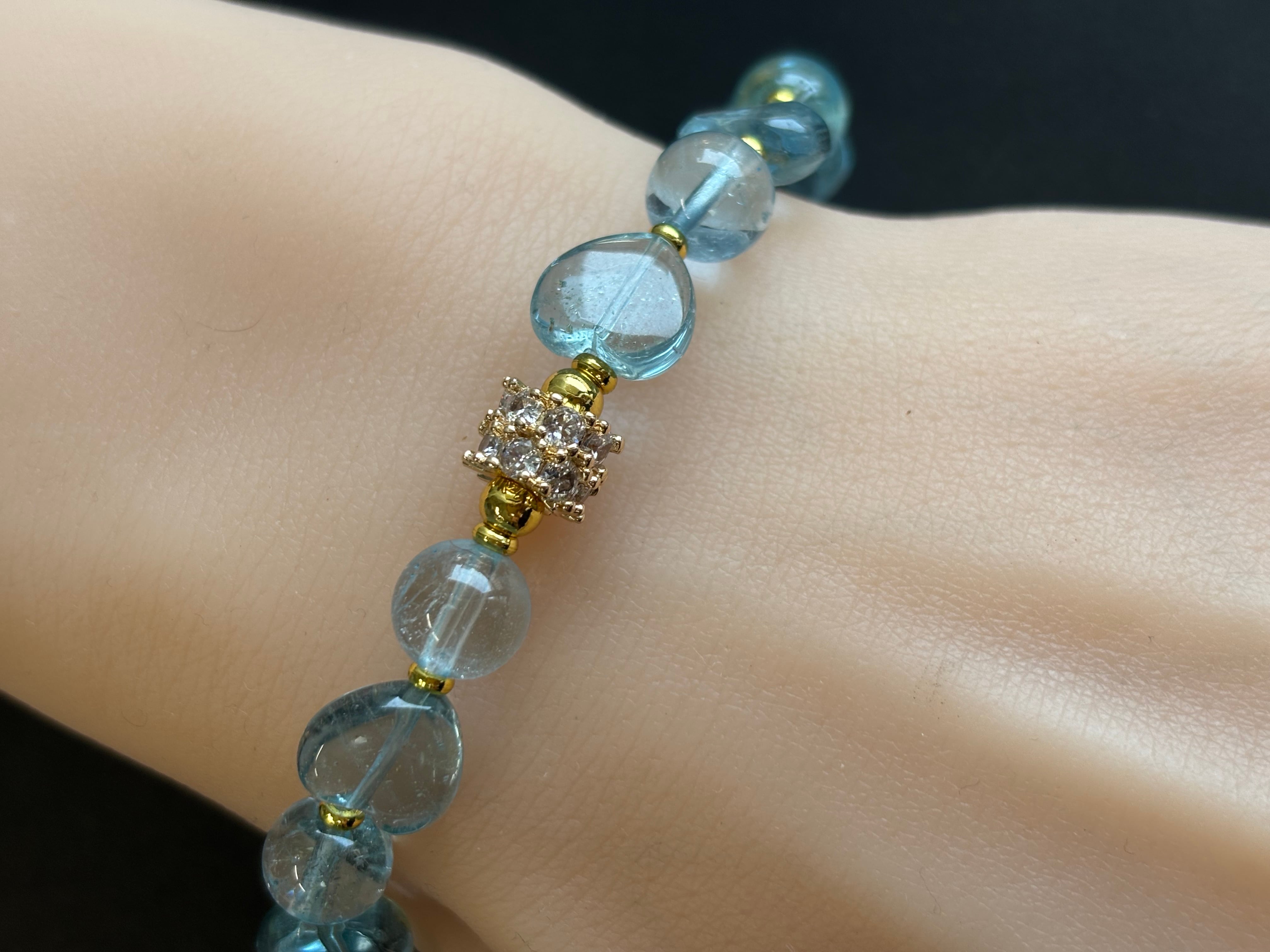 淡く澄んだブルートパーズを、ハートカットとラウンド(丸玉)で組み合わせたデザインブレスレット。