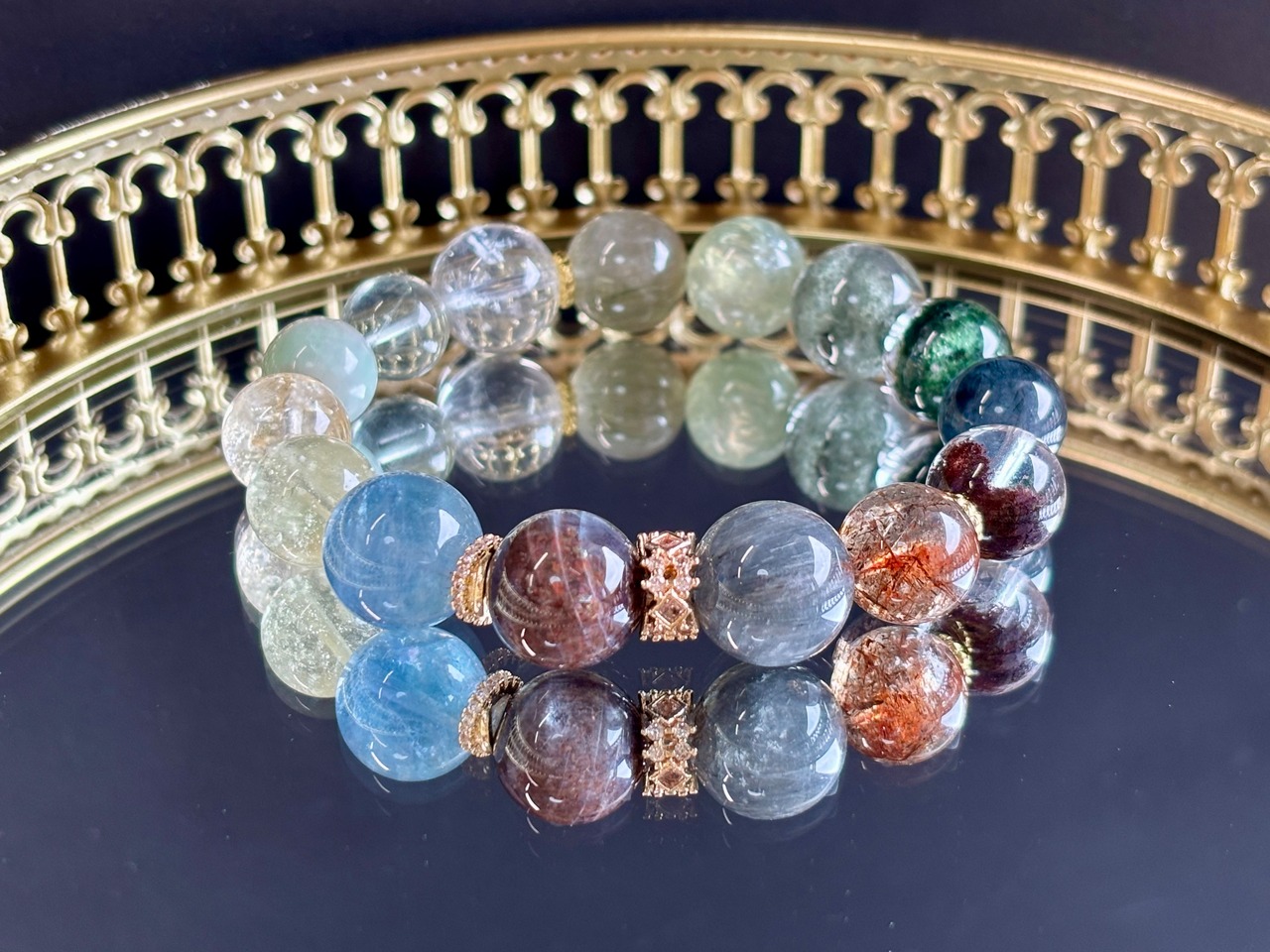 透明感、彩り、輝き——ひとつのブレスレットにさまざまな天然石の美しさを詰め込んだ、特別価格の高品質レインボーブレスレットです。