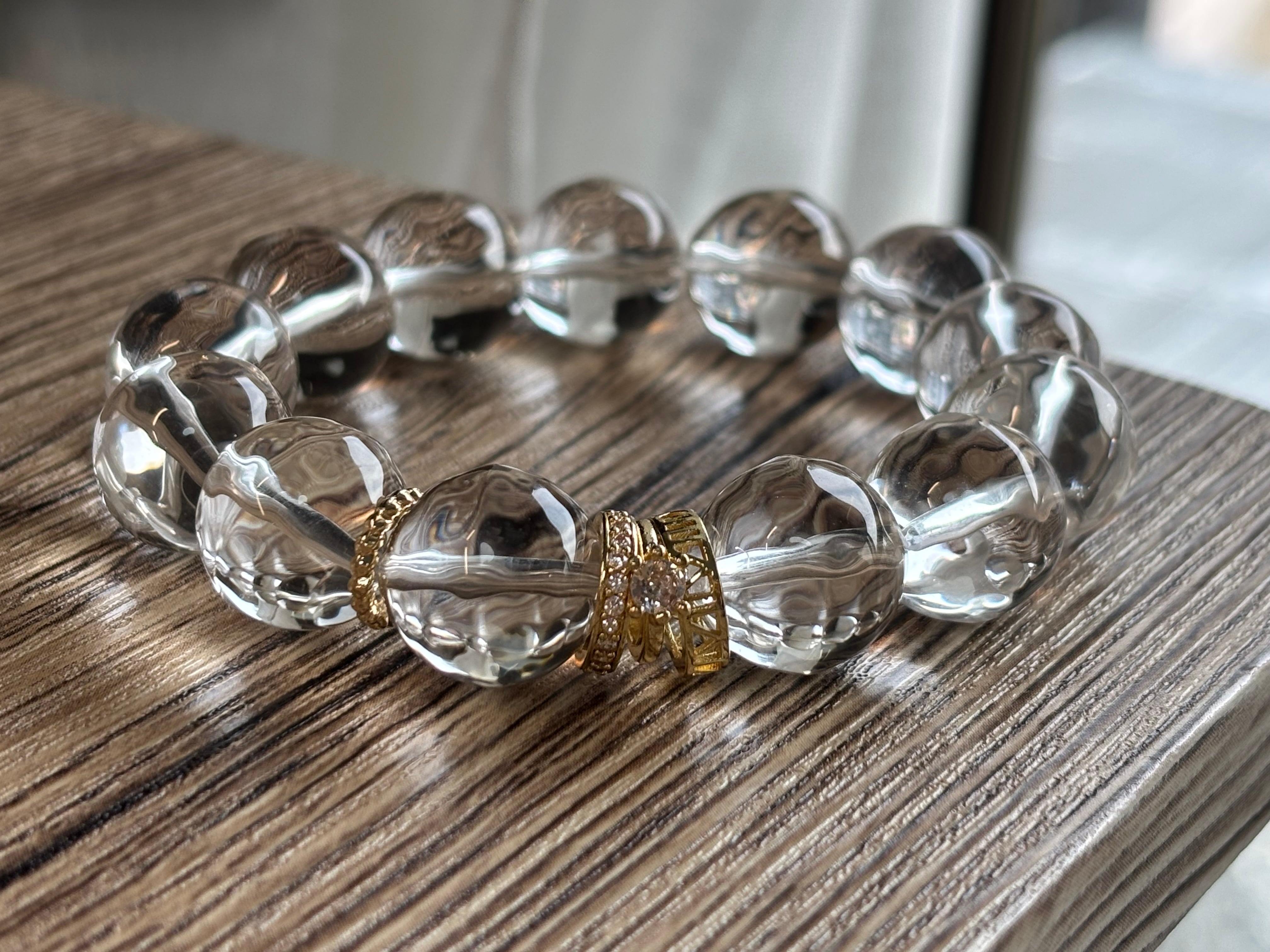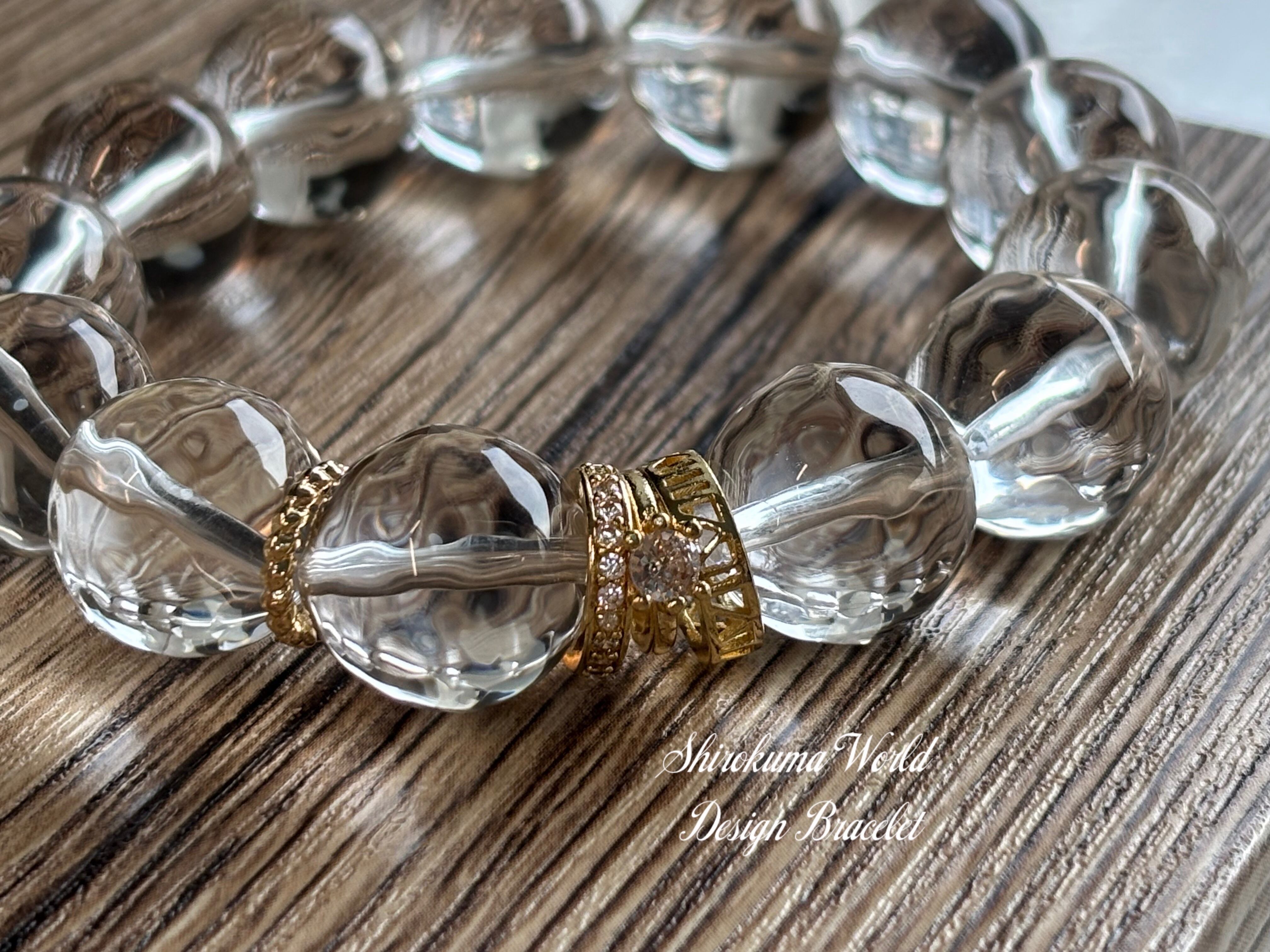 透明感のある水晶に、独特な立体カットが施され、角度によってさまざまな輝きを見せてくれます。水面のような反射が美しいブレスレットです( *´꒳`*)
