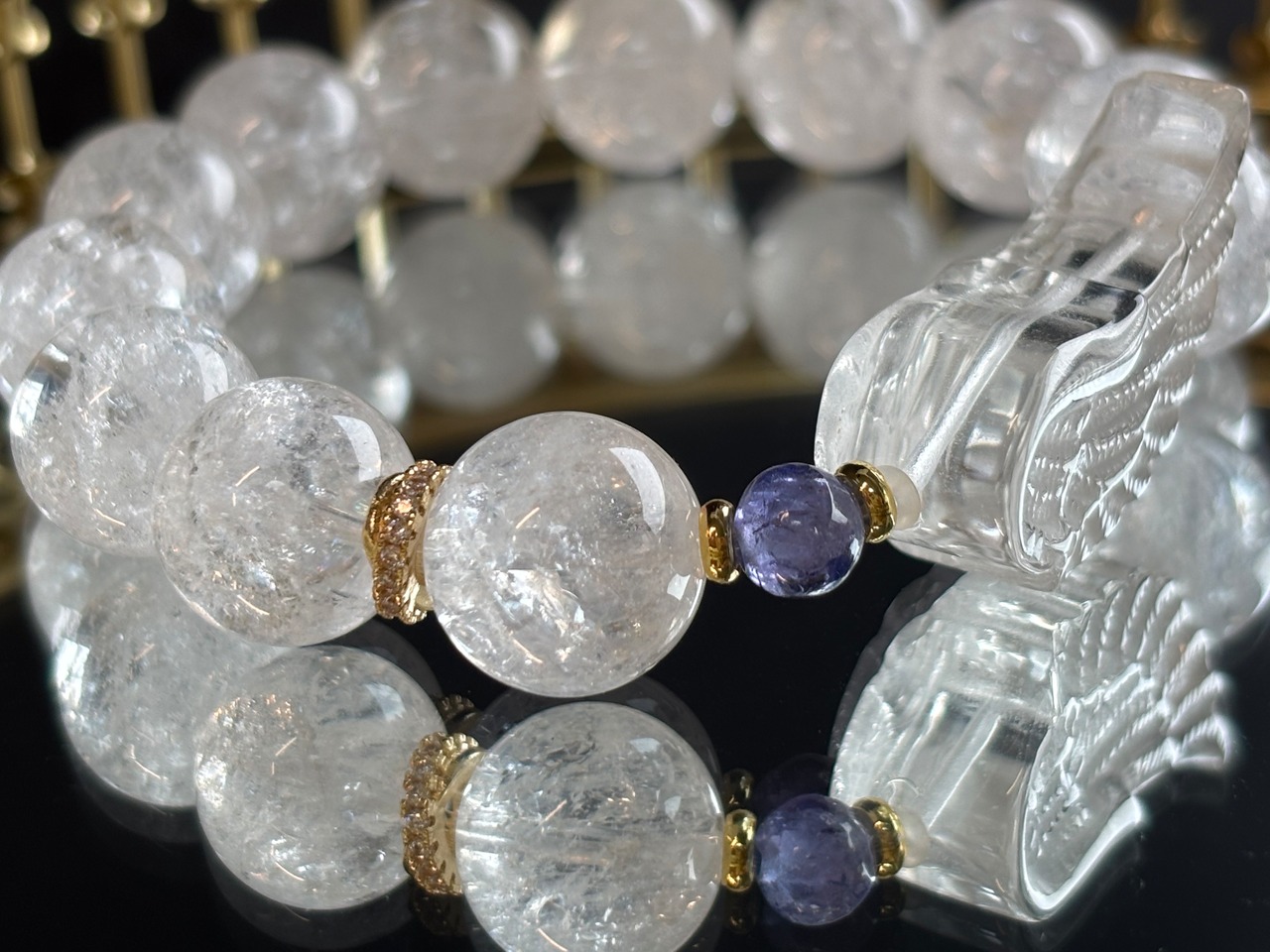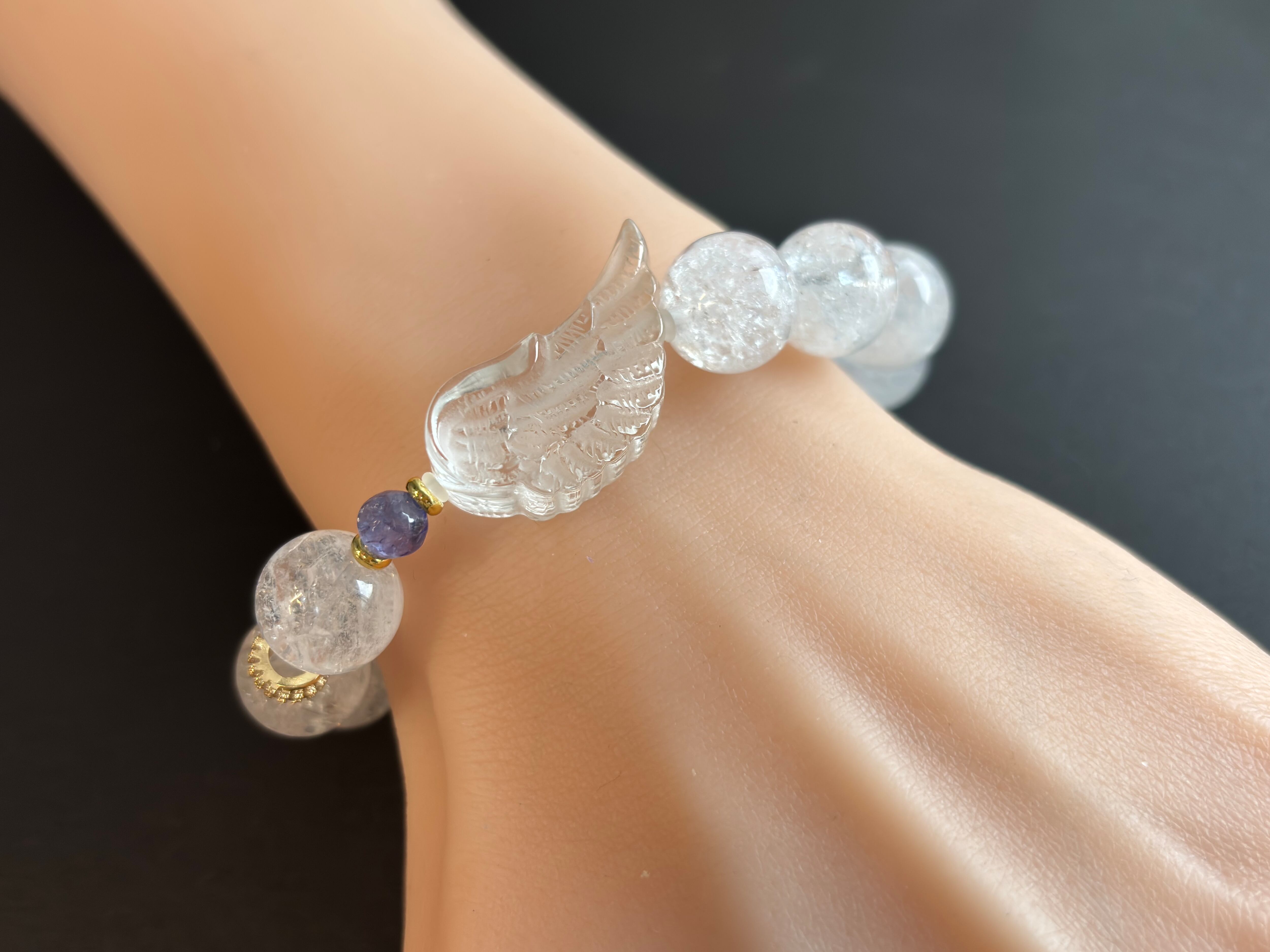 繊細な羽根彫刻が美しい、高品質水晶を使用したブレスレット&ネックレスセット。