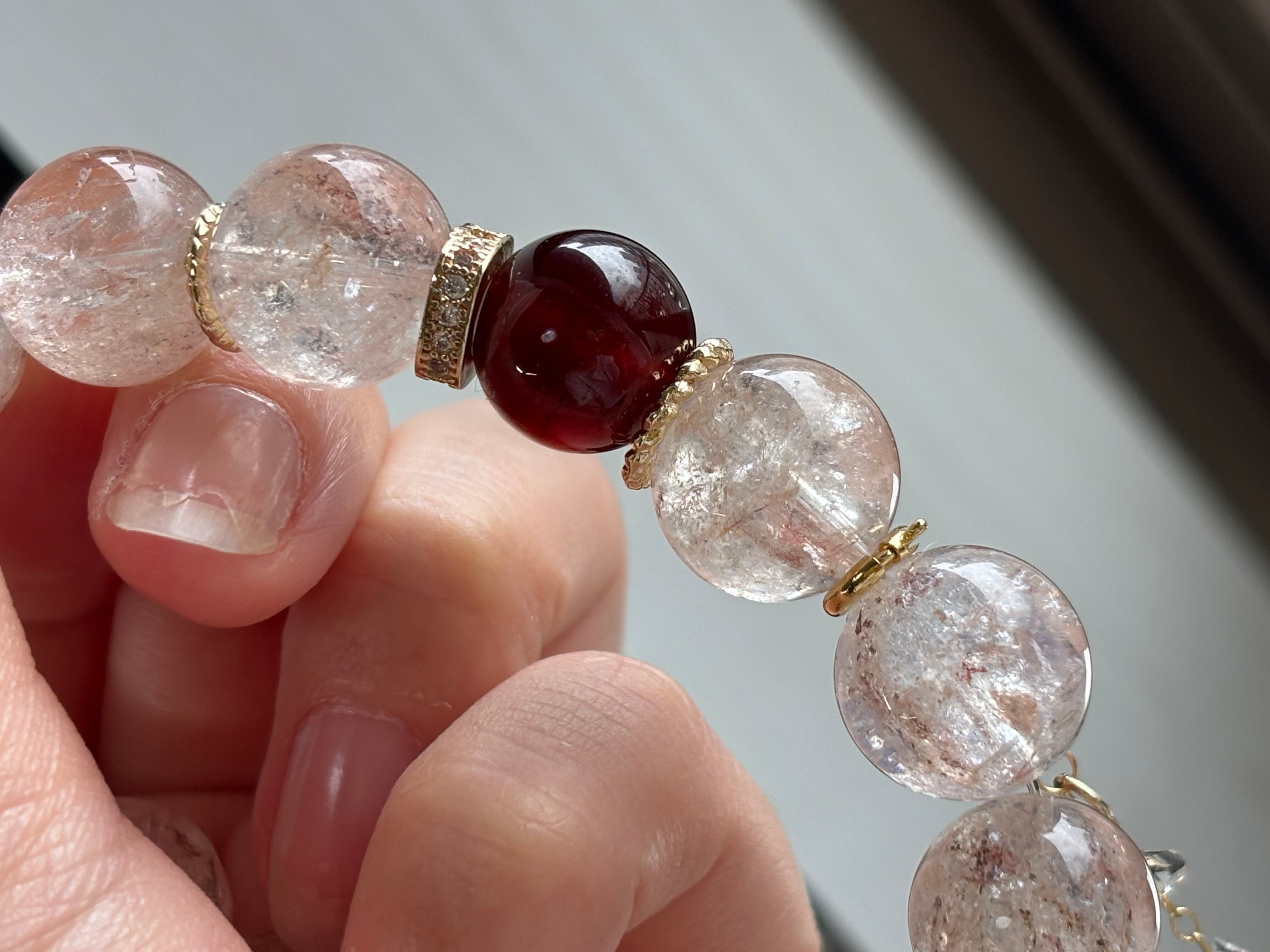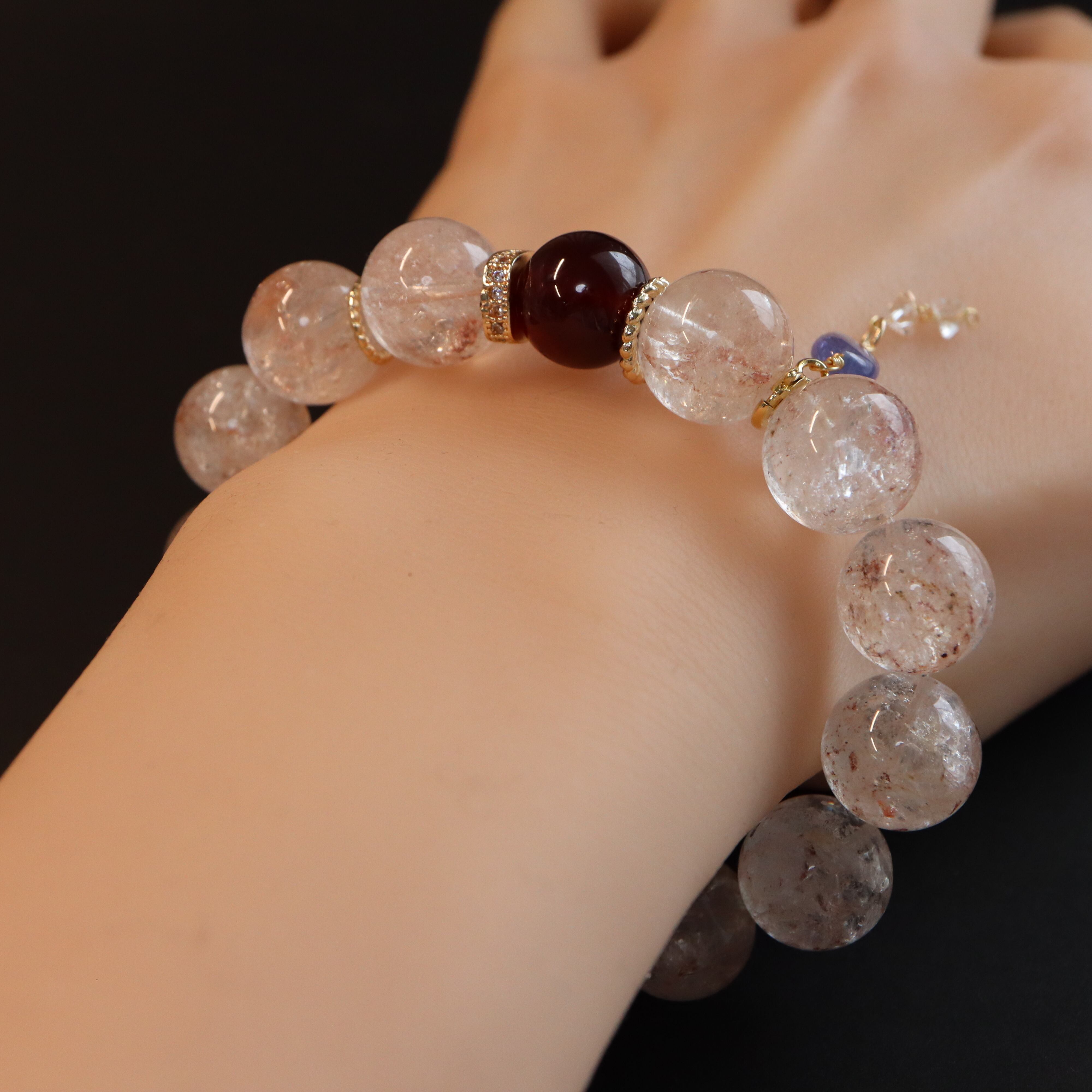ブレスレット部分のアイリスピンクゲーサイトインクォーツは、赤やピンクの内包物が舞う個性ある表情が魅力。