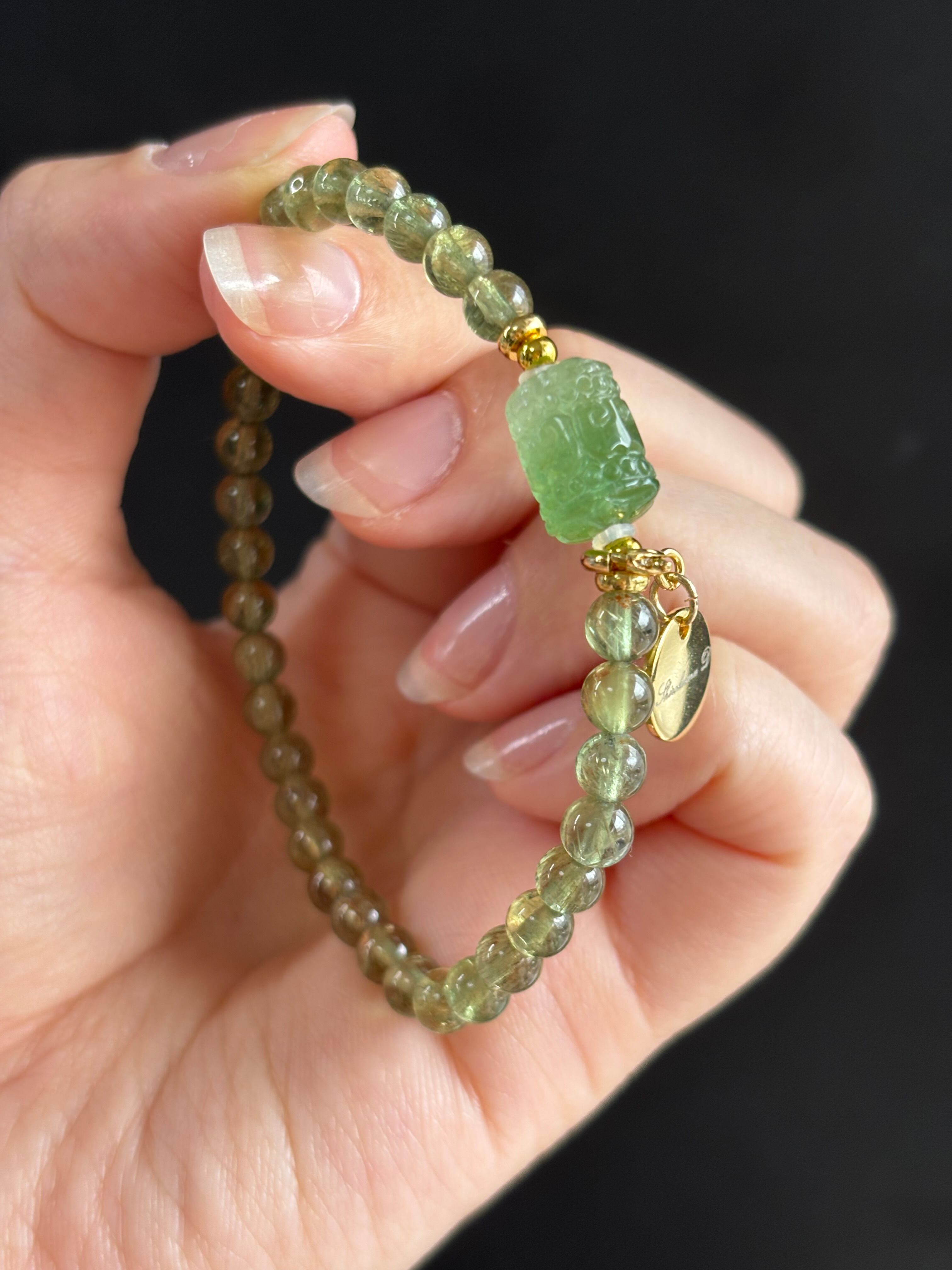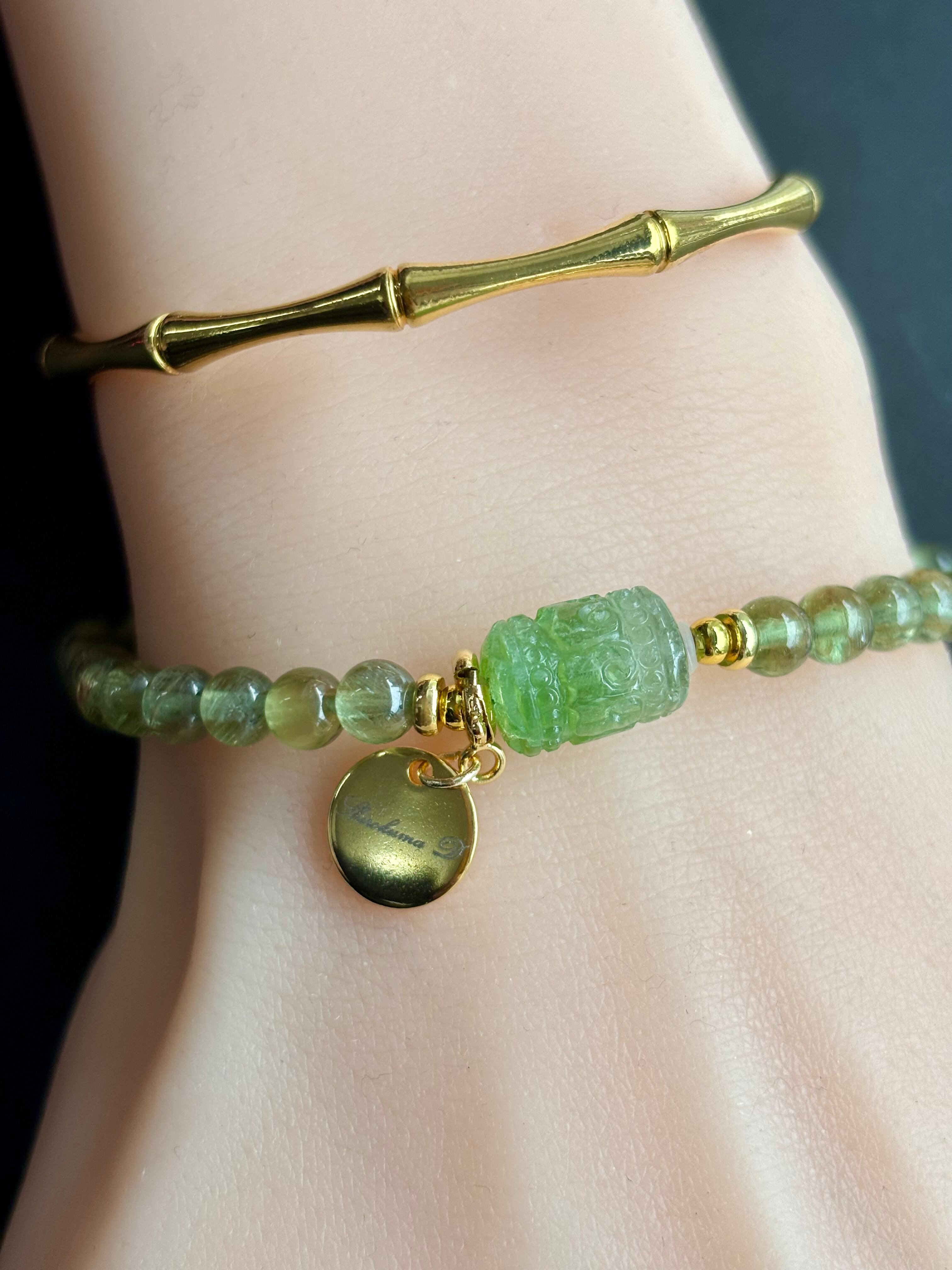 グミのようにぷるんとした質感のグリーントルマリンの彫刻入りの回文殊型(かいもんじゅ)で仕立てた、爽やかな印象の細身ブレスレット( *´꒳`*)