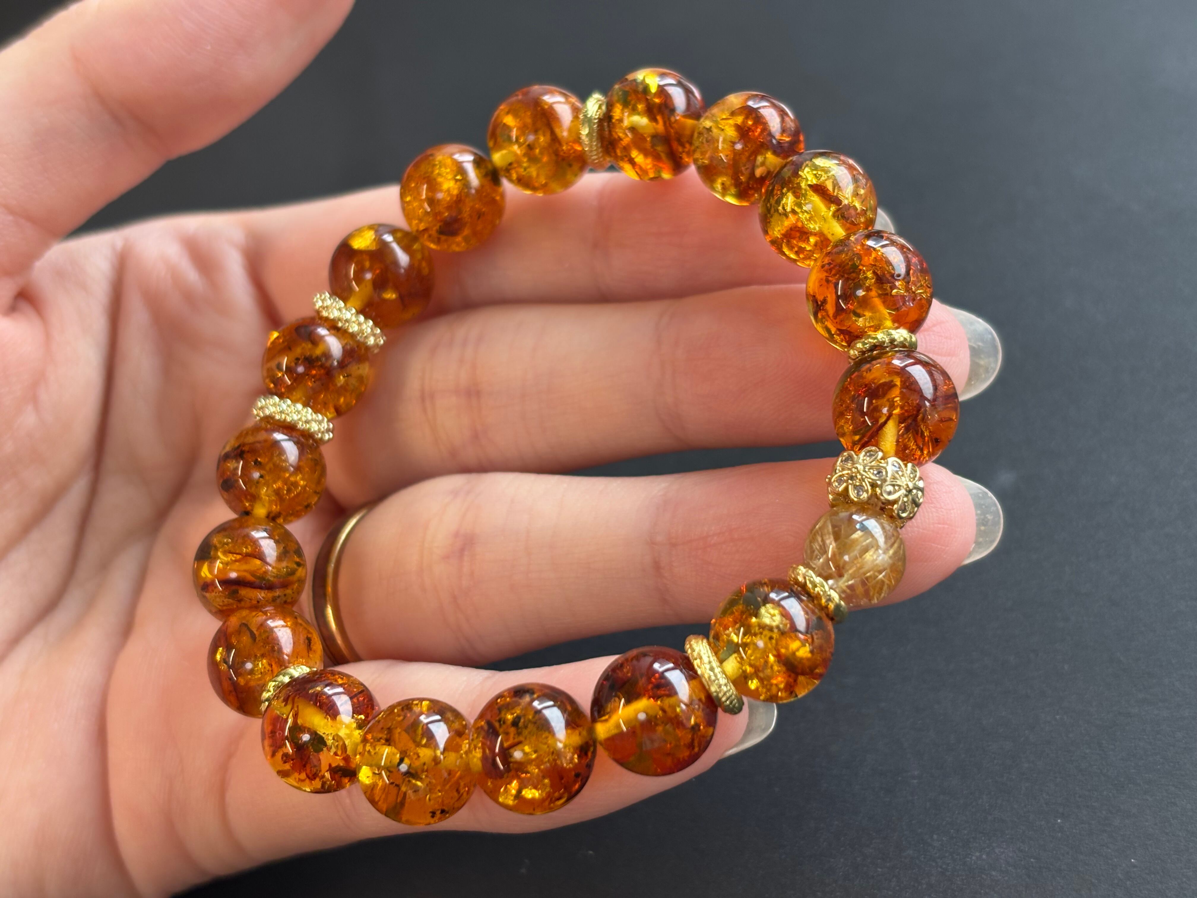 ルチルクォーツ 花アンバー 琥珀 デザインブレスレット