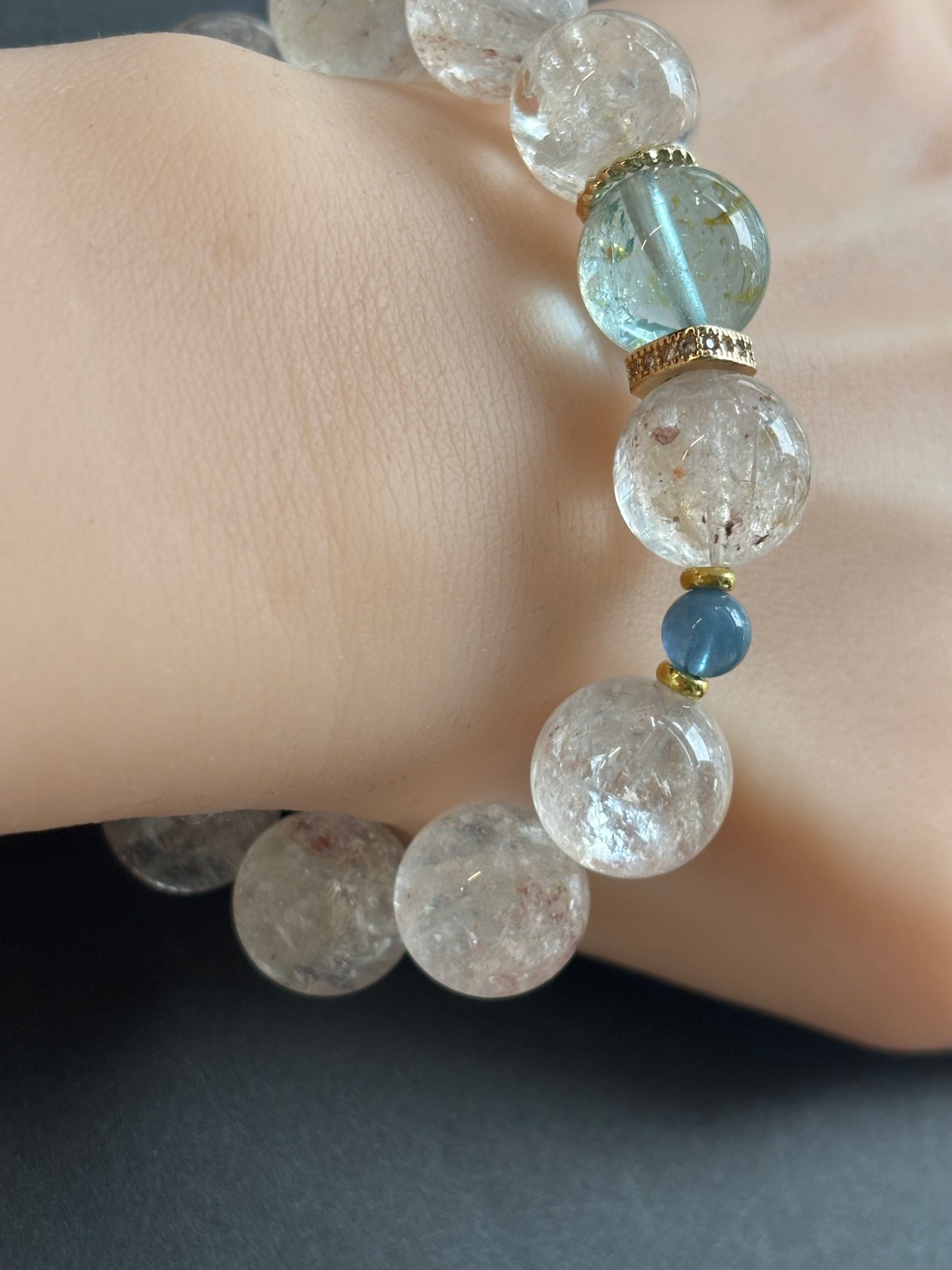 澄んだブルーが美しいブルートパーズとアクアマリン、そして繊細な虹の煌めきを閉じ込めたピンクアイリスクォーツ。