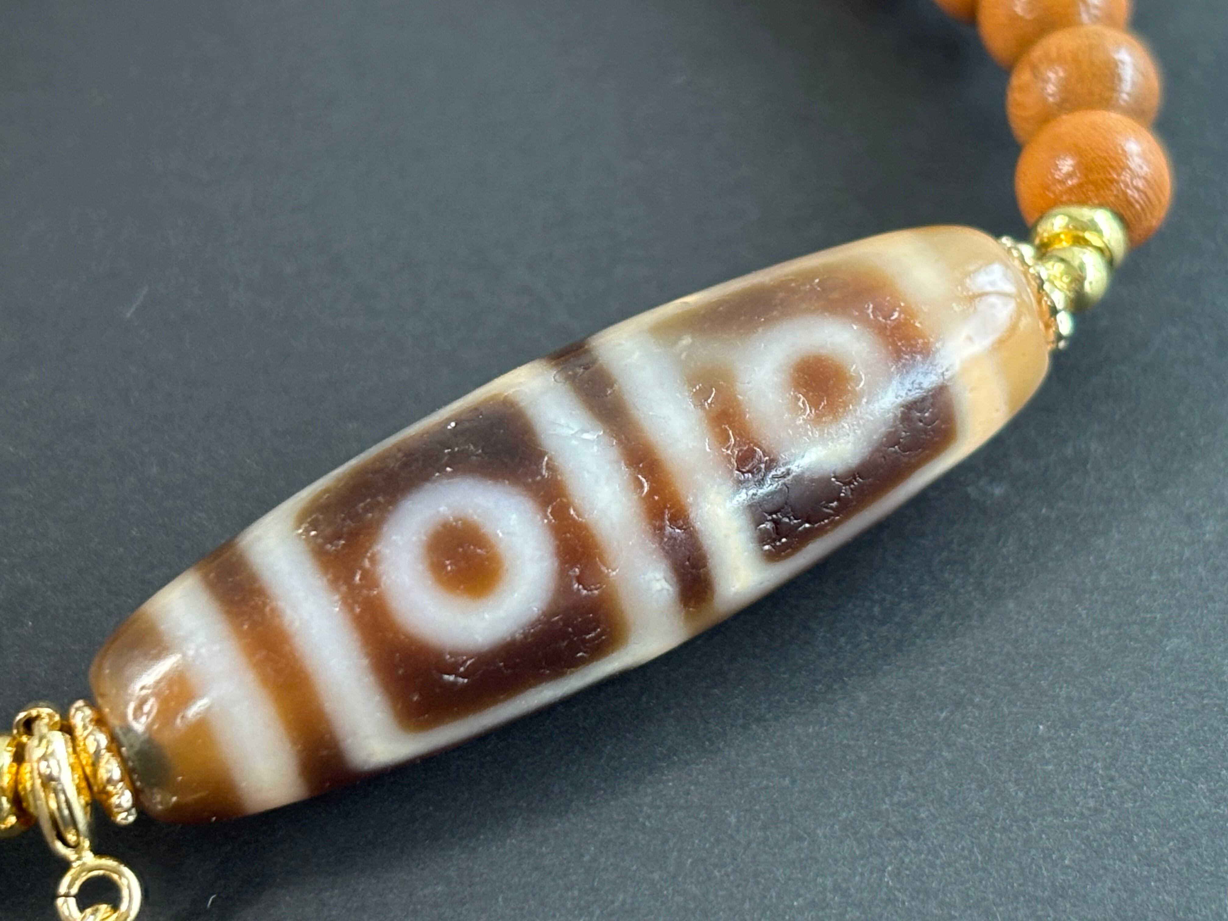 四眼天珠は、観音、文殊、普賢、地蔵の四大菩薩の威徳を象徴し、人間関係の円滑、事業の成功、財運向上、安定した生活などを招くとされています。また、第三の眼(知恵の眼)を表し、トラブル回避や成功への導きを期待できるとされています。