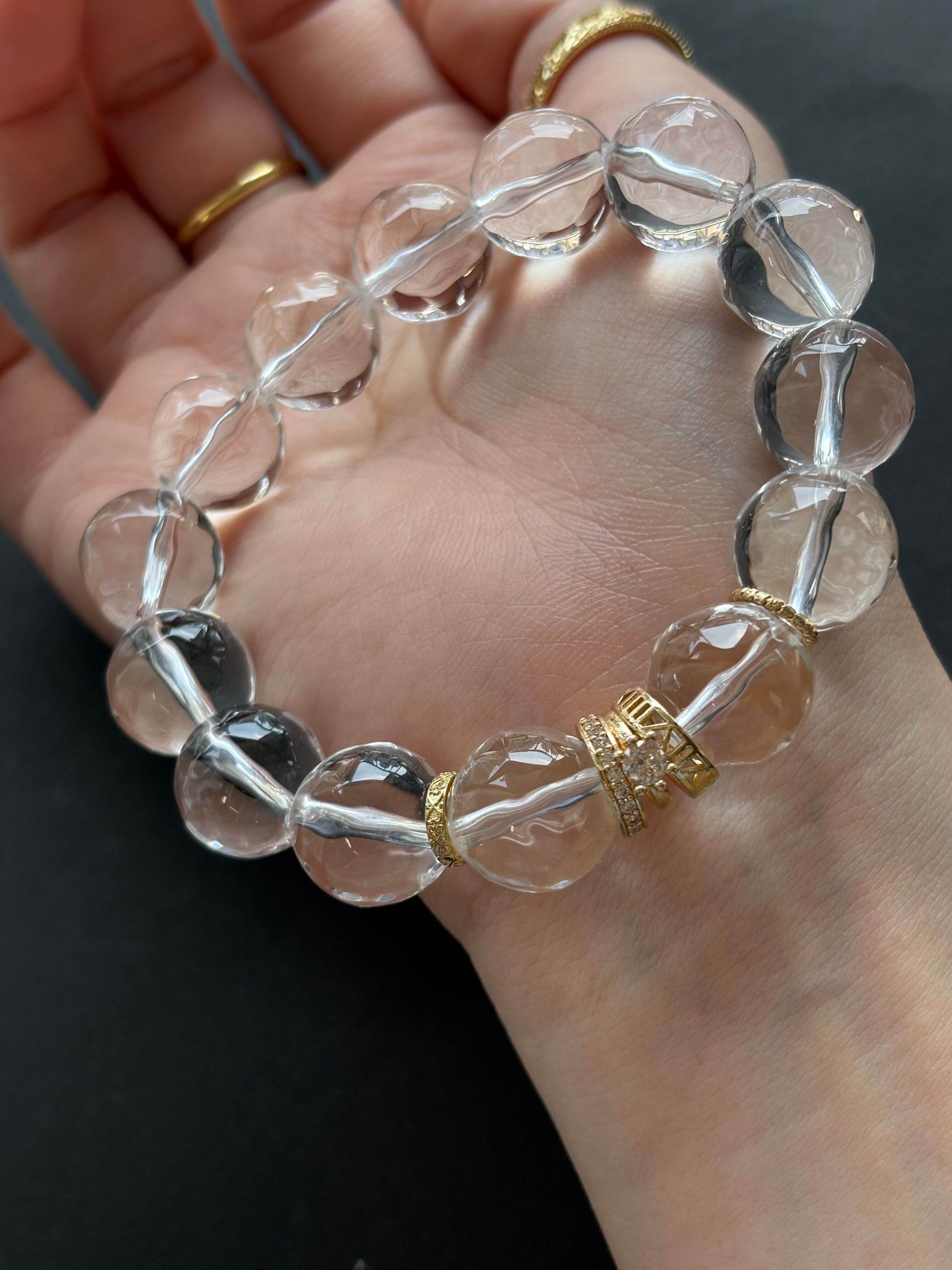 透明感のある水晶に、独特な立体カットが施され、角度によってさまざまな輝きを見せてくれます。水面のような反射が美しいブレスレットです( *´꒳`*)