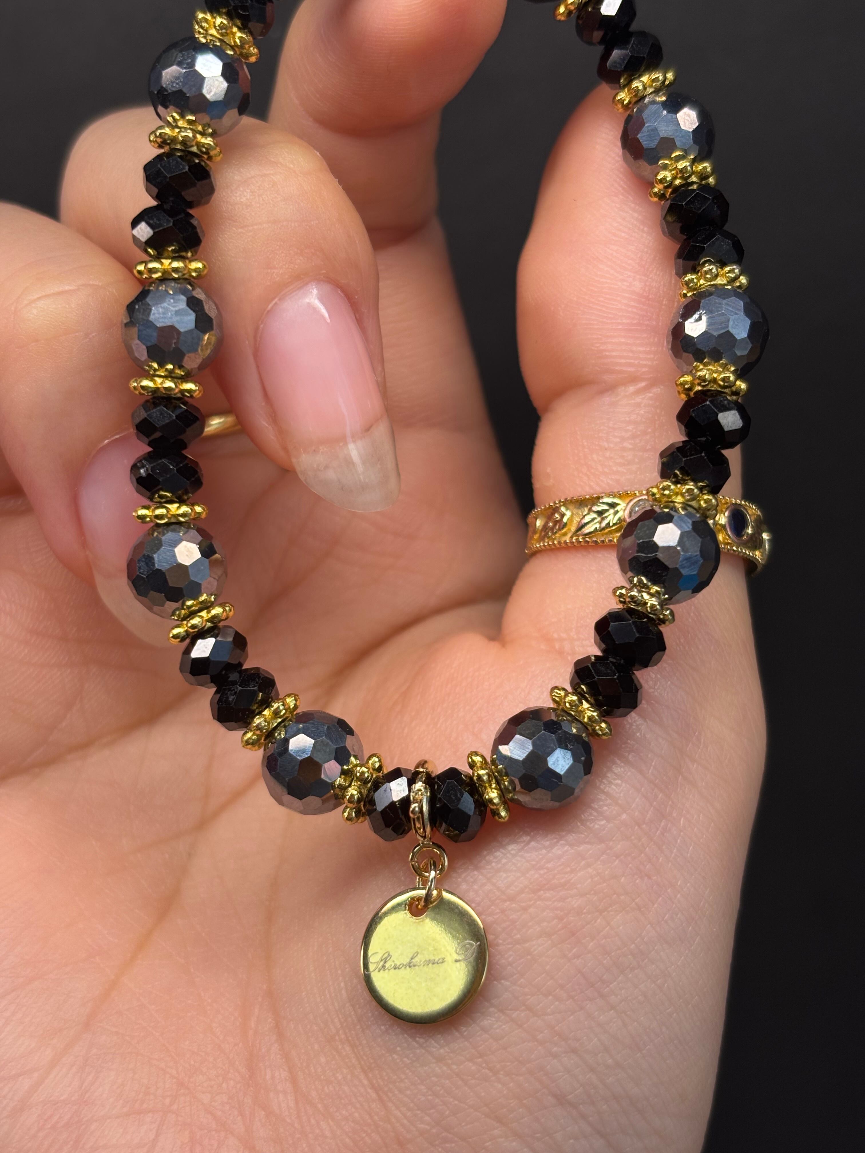 キラキラと輝くミラーボールカットのテラヘルツと、カットが細かく美しいブラックスピネルを組み合わせたブレスレットです。