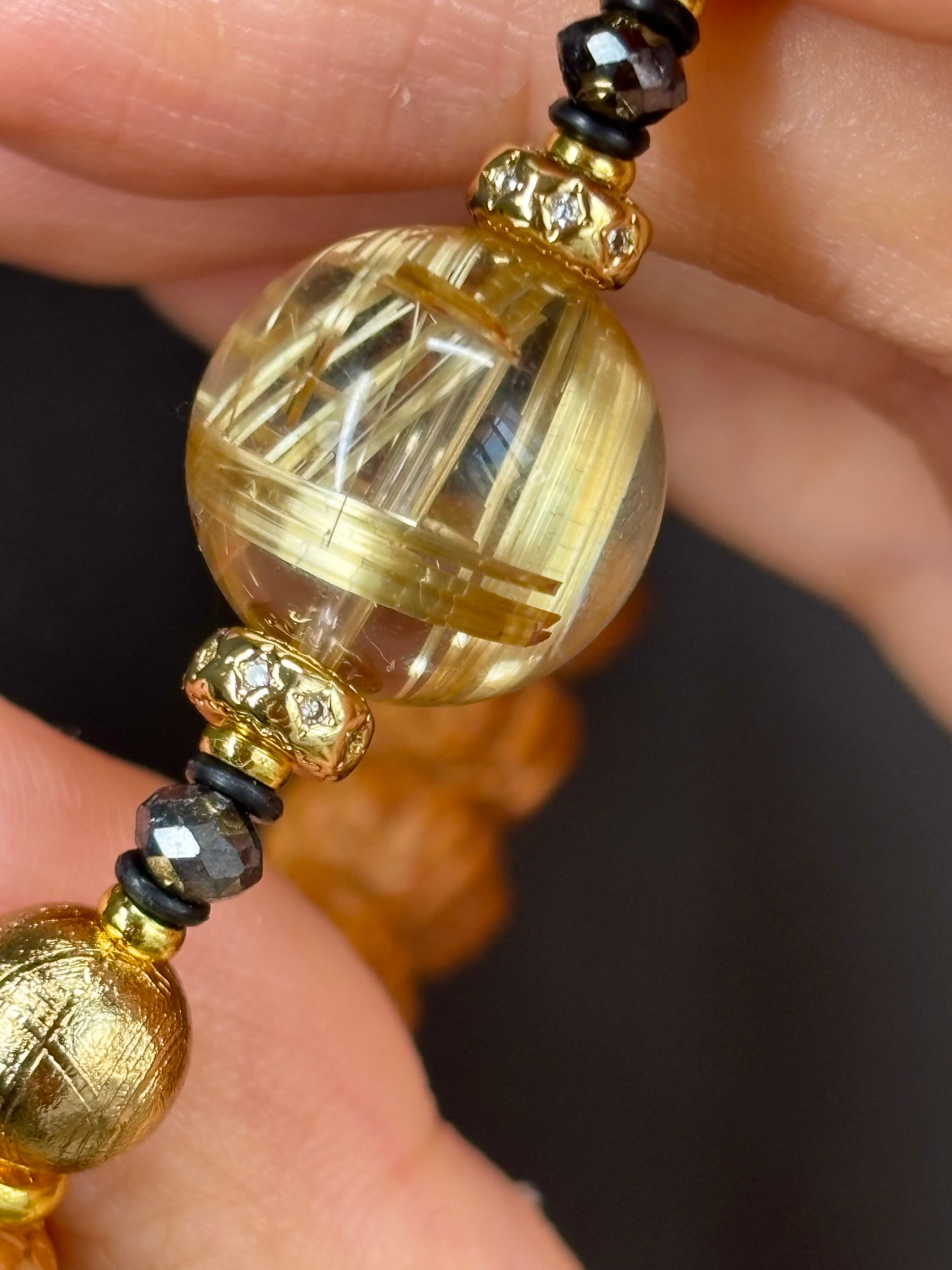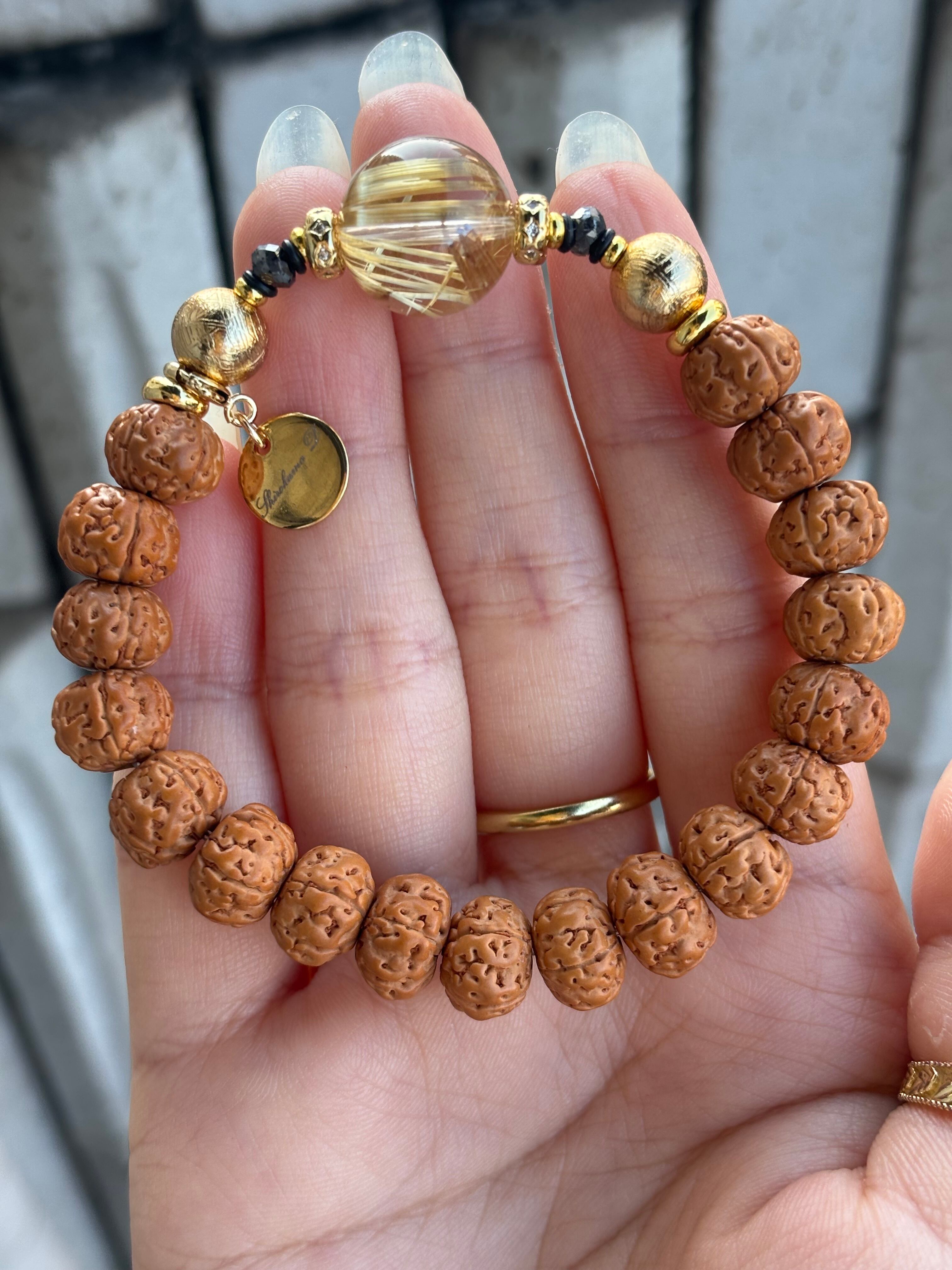 トップグレードの透明感のタイチンルチルクォーツをトップに、ブラックダイヤモンド・ギベオン・ルドラクシャを組み合わせた、縁起物としてもおすすめのお守りブレスレットです。
