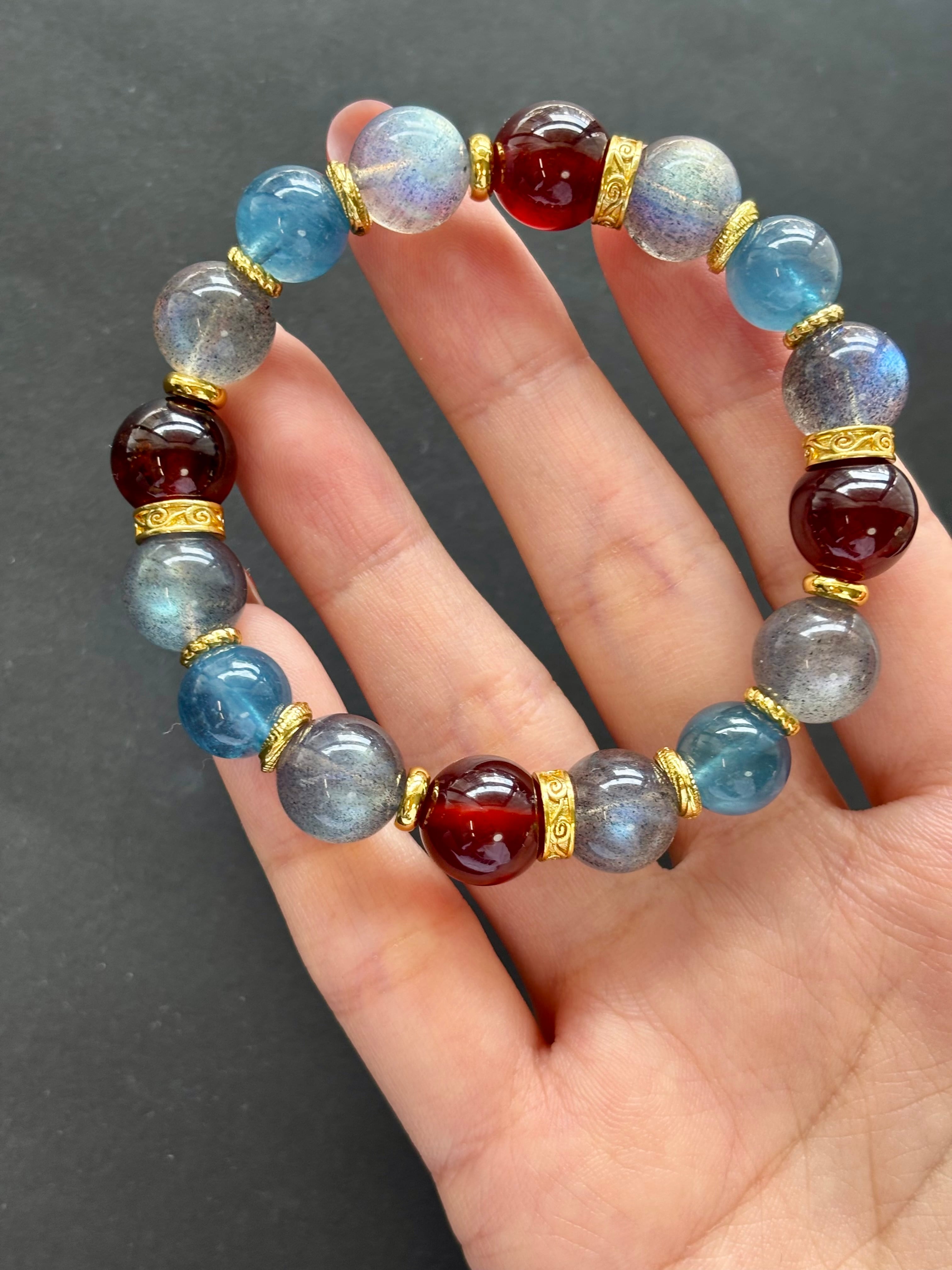 高品質ラブラドライト、アクアマリン、ガーネットを組み合わせた存在感あるデザインブレスレット。