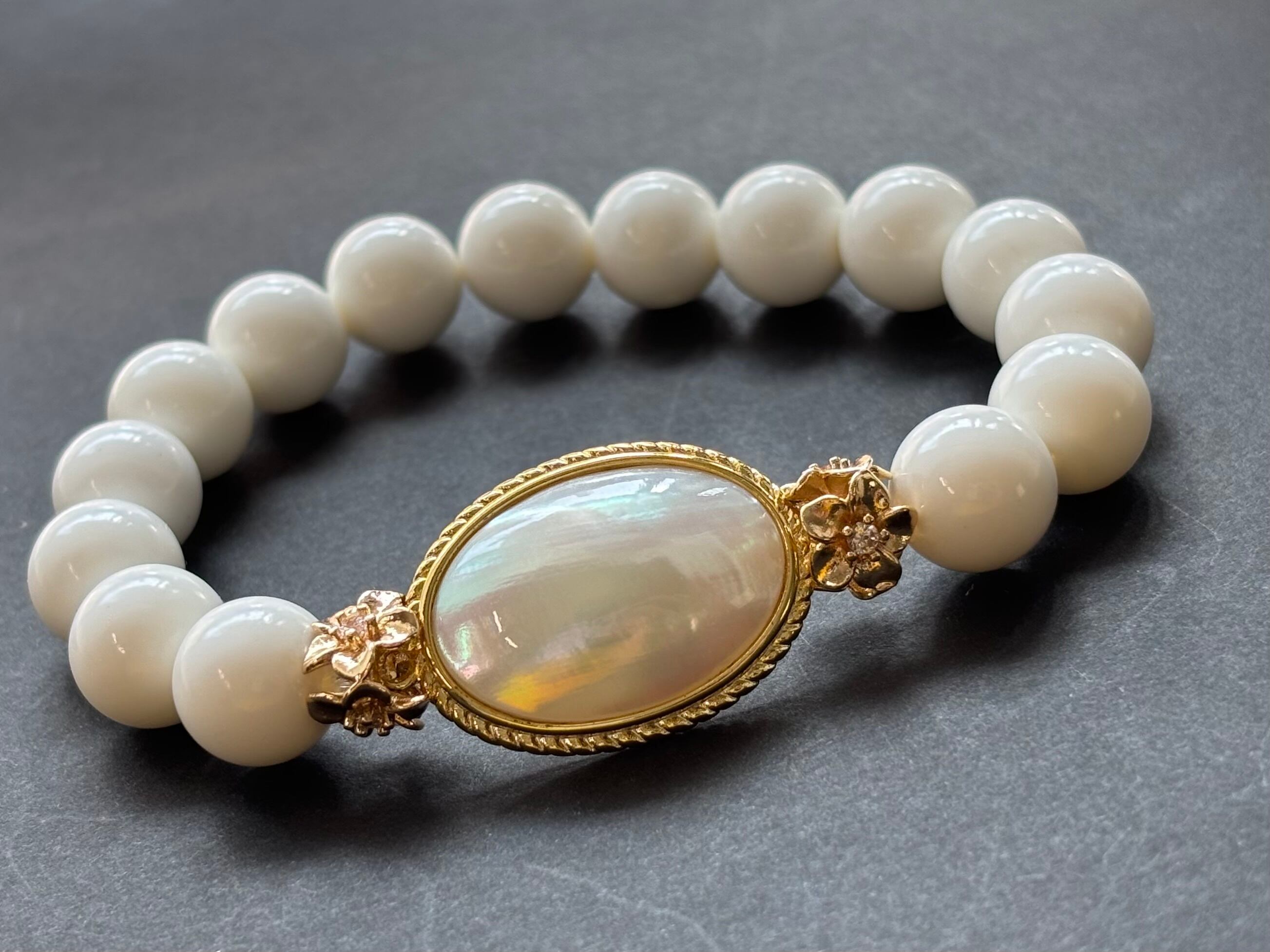 乳白色の優しい色合いと、つるんとした光沢が清らかな印象を与え、パールとの相性もとても良いとされています。