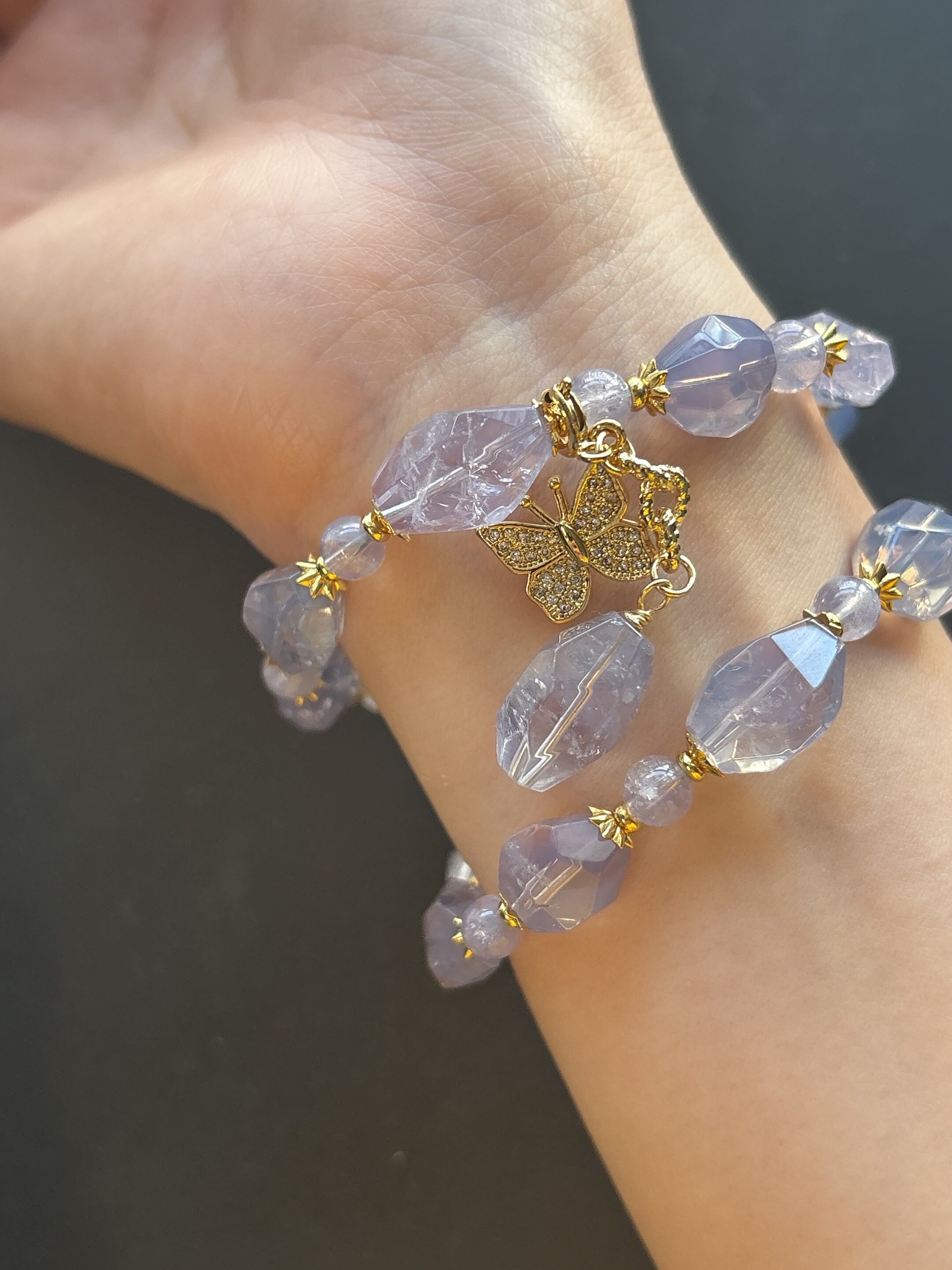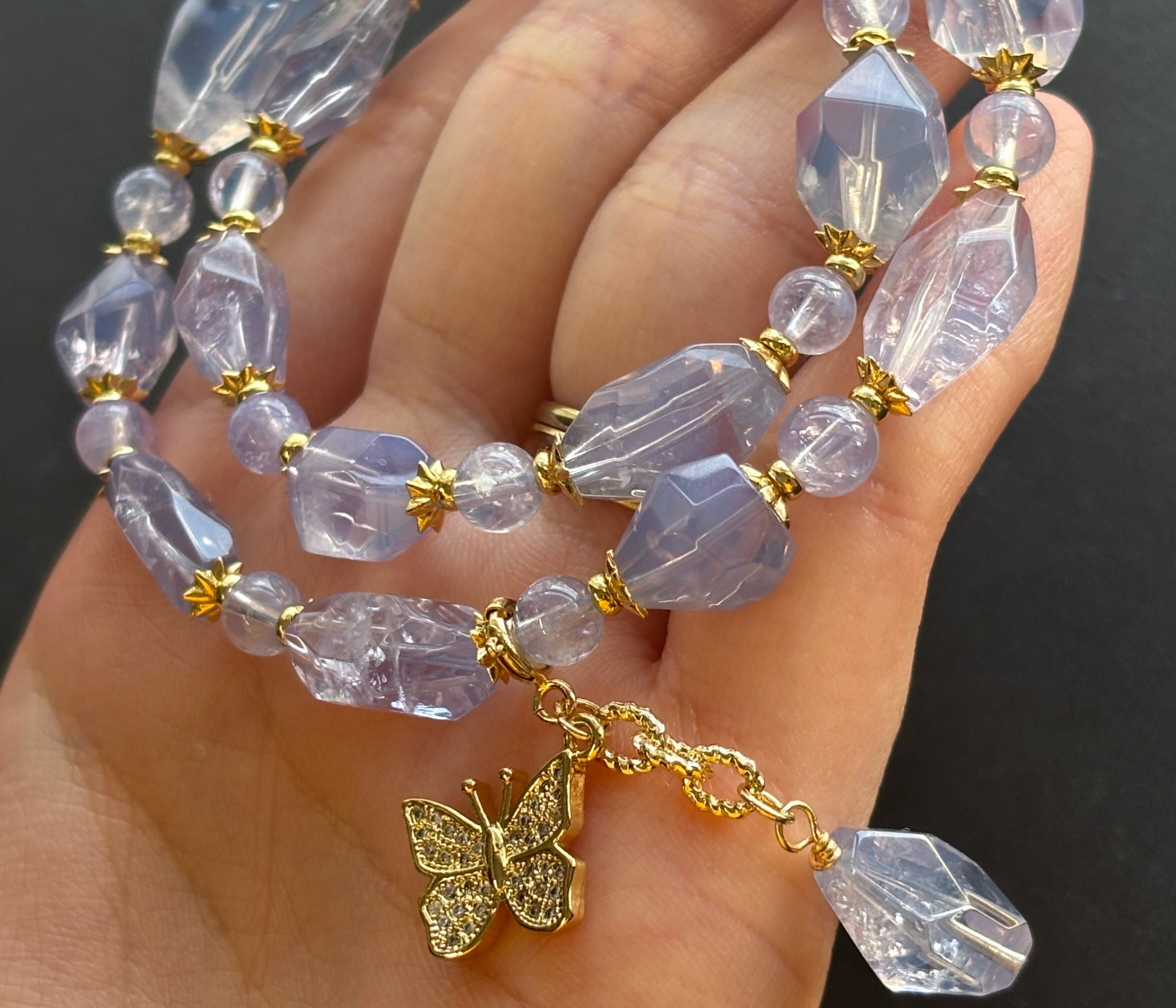 スコロライトは「癒しの石」とも呼ばれ、心を落ち着け穏やかにすると言われています。蝶モチーフのチャームが華やかさを添え、取り外し可能なため気分やシーンに合わせて楽しめます。