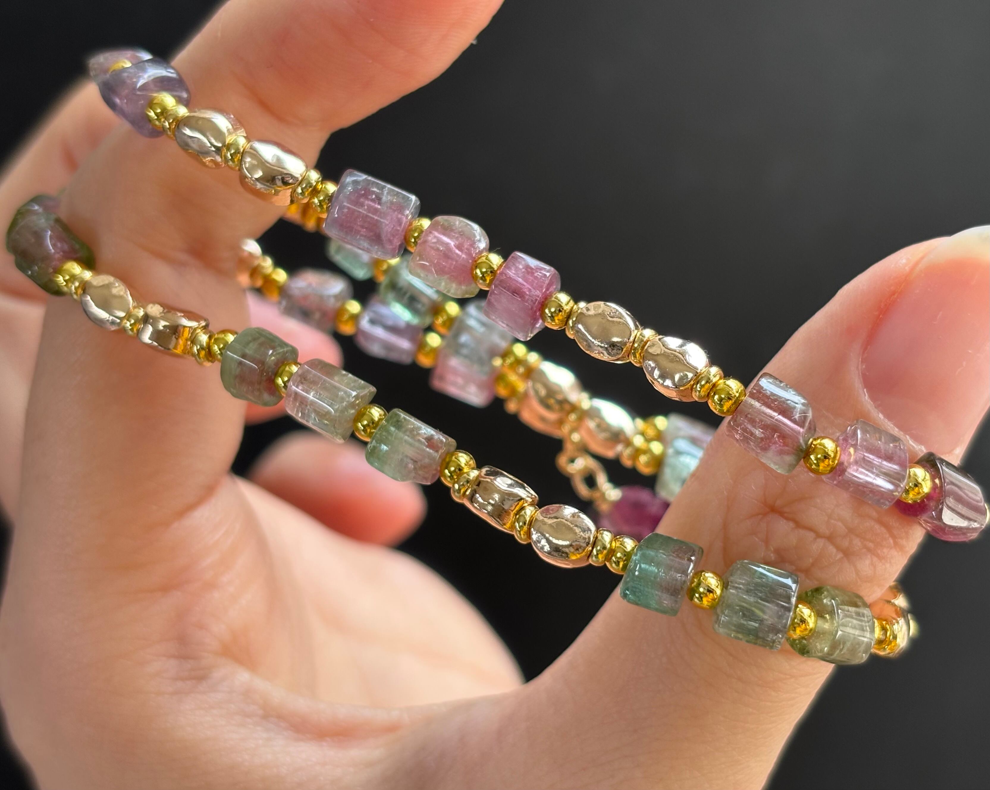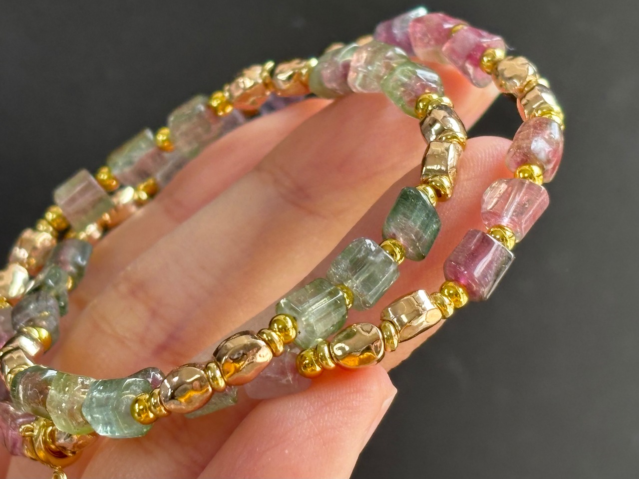 高品質 ウォーターメロントルマリン ルベライト薔薇 二連デザインブレスレット