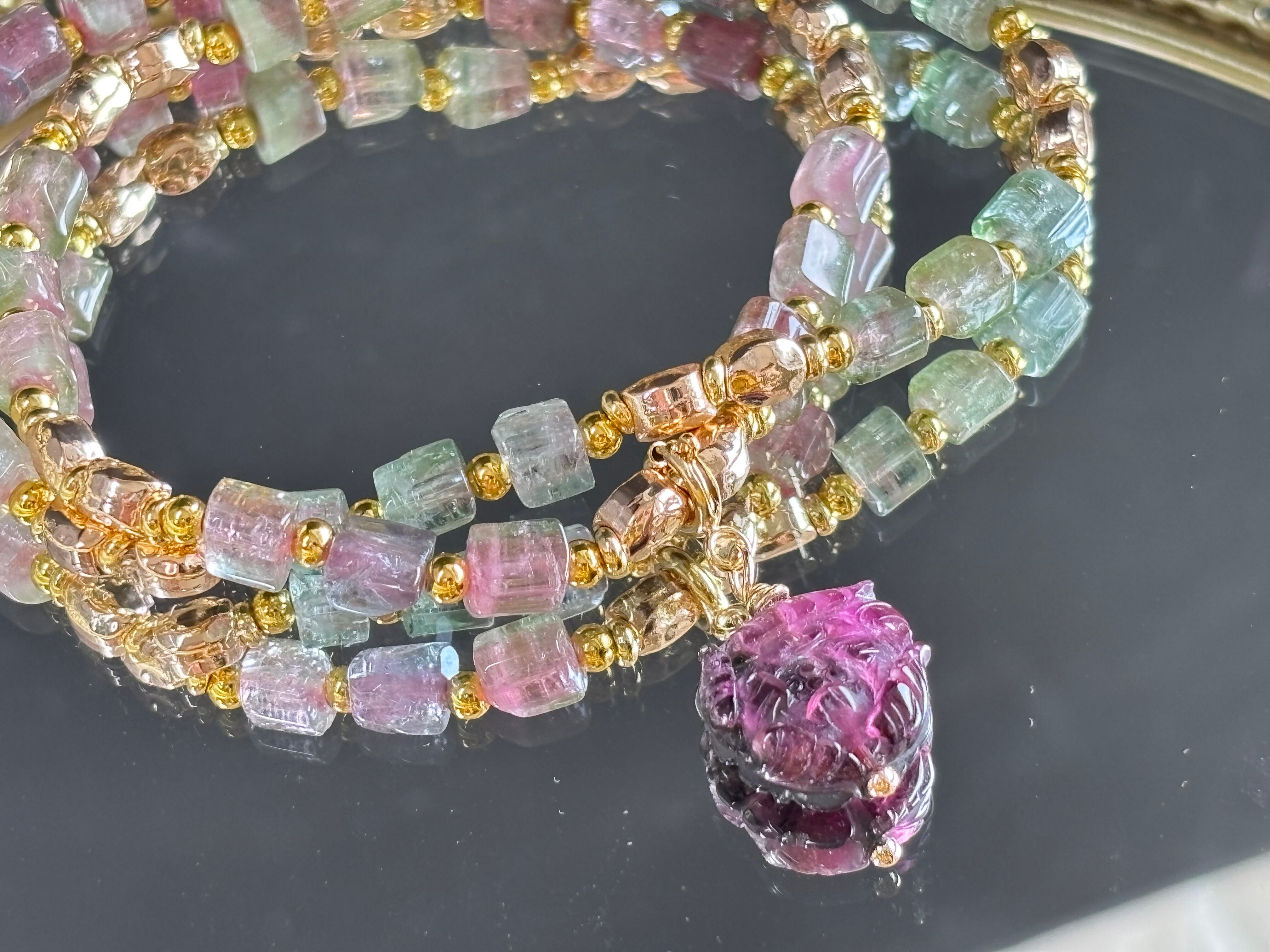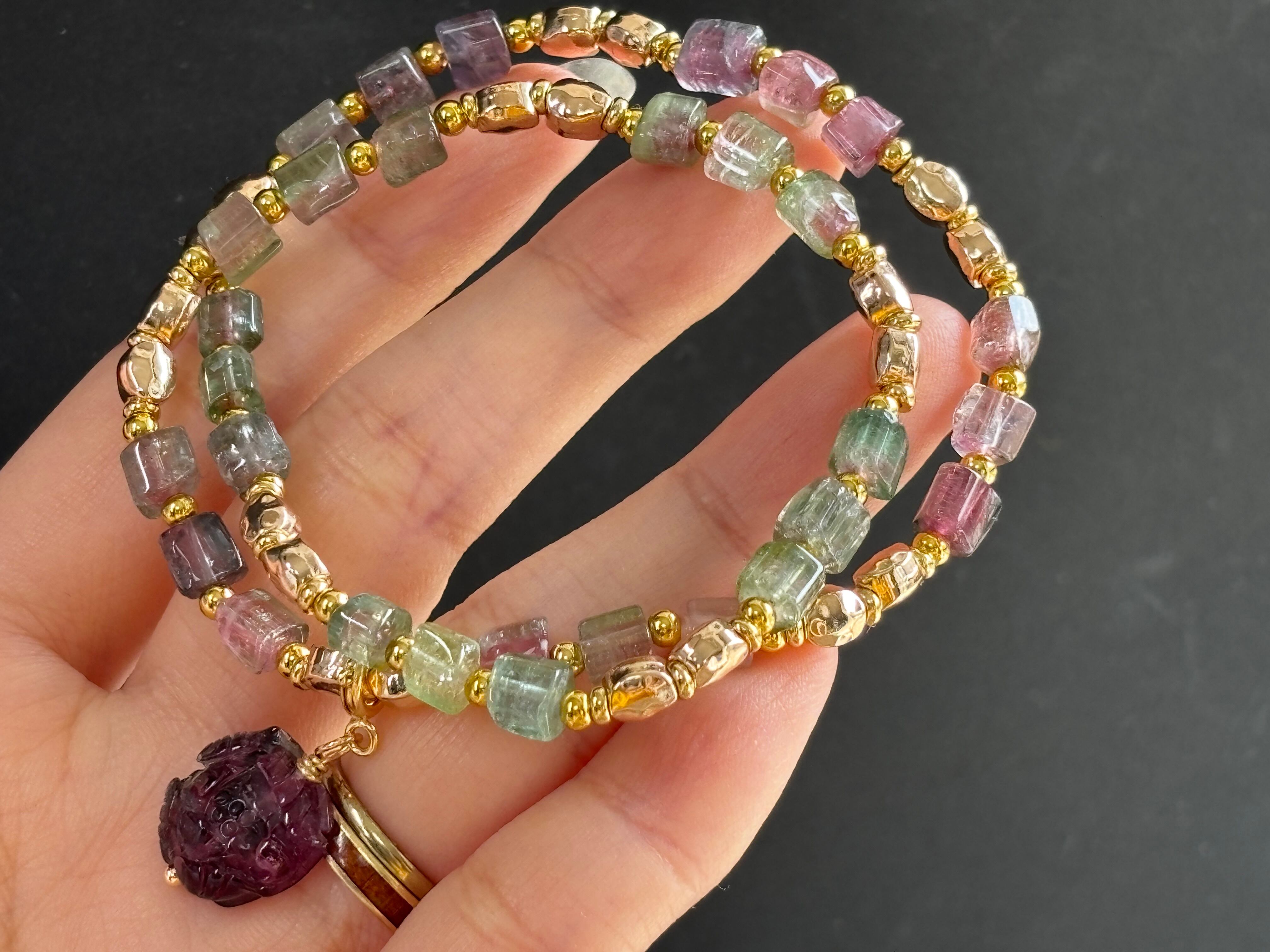 高品質ウォーターメロントルマリンを贅沢に使用し、ポイントにルベライトの薔薇のチャームをあしらった二連デザインブレスレット。