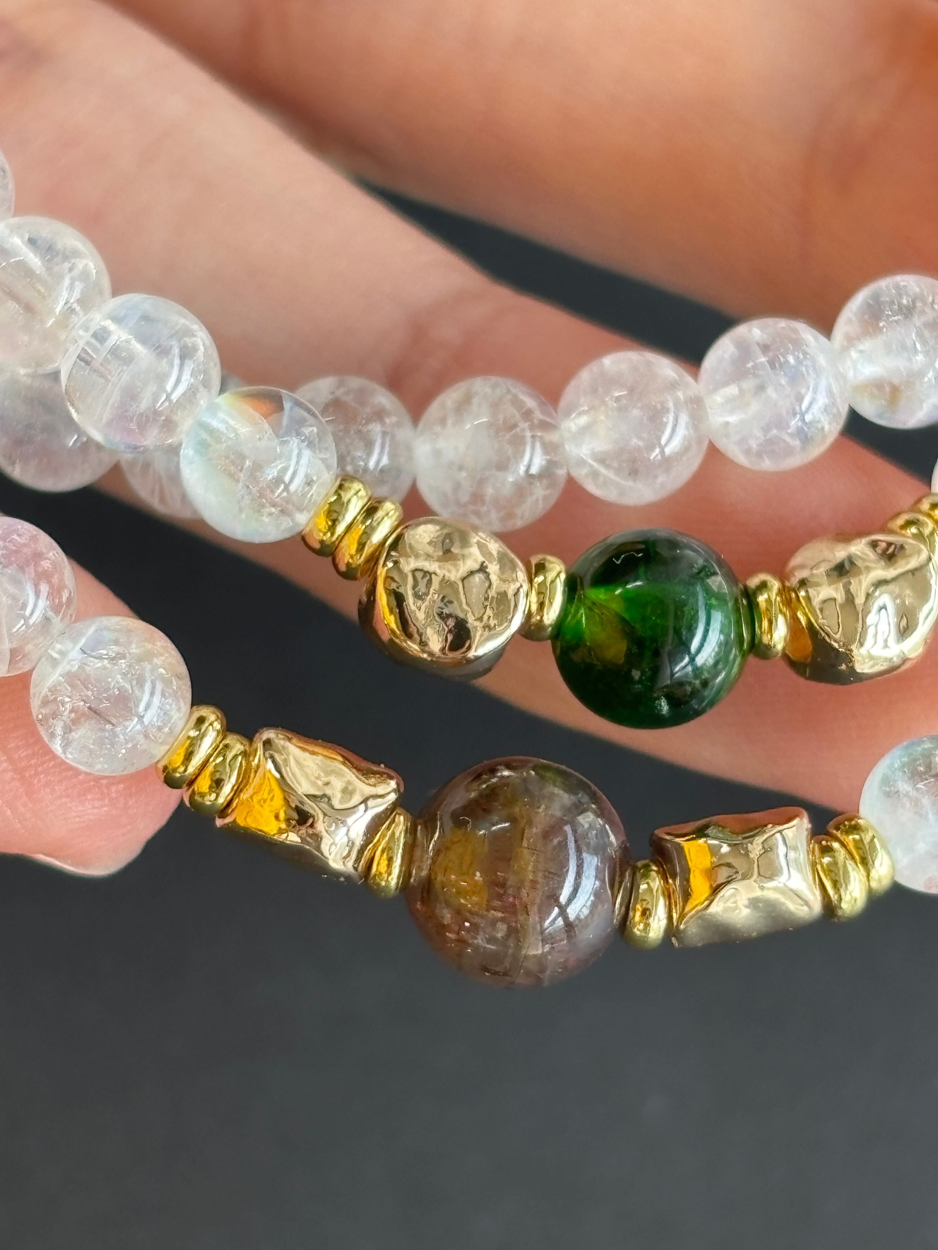 高品質マダガスカル産レインボームーンストーンをベースに、贅沢に多彩な天然石を組み合わせた三連デザインブレスレット。