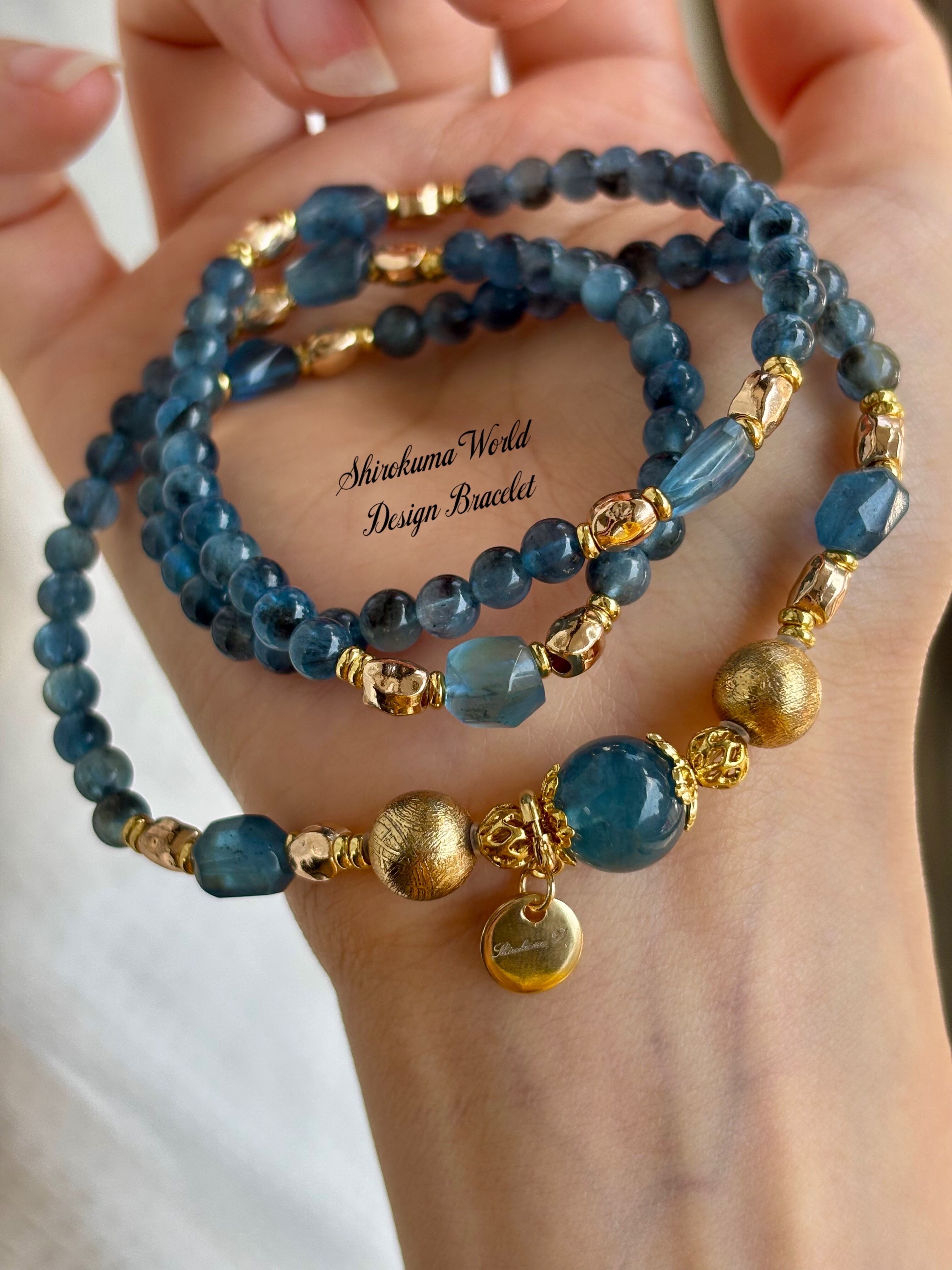 透明感のあるアクアマリンに、落ち着いた色味のブラックアクアマリンやフリーカットの個性的なアクアマリンを組み合わせた三連ブレスレット。