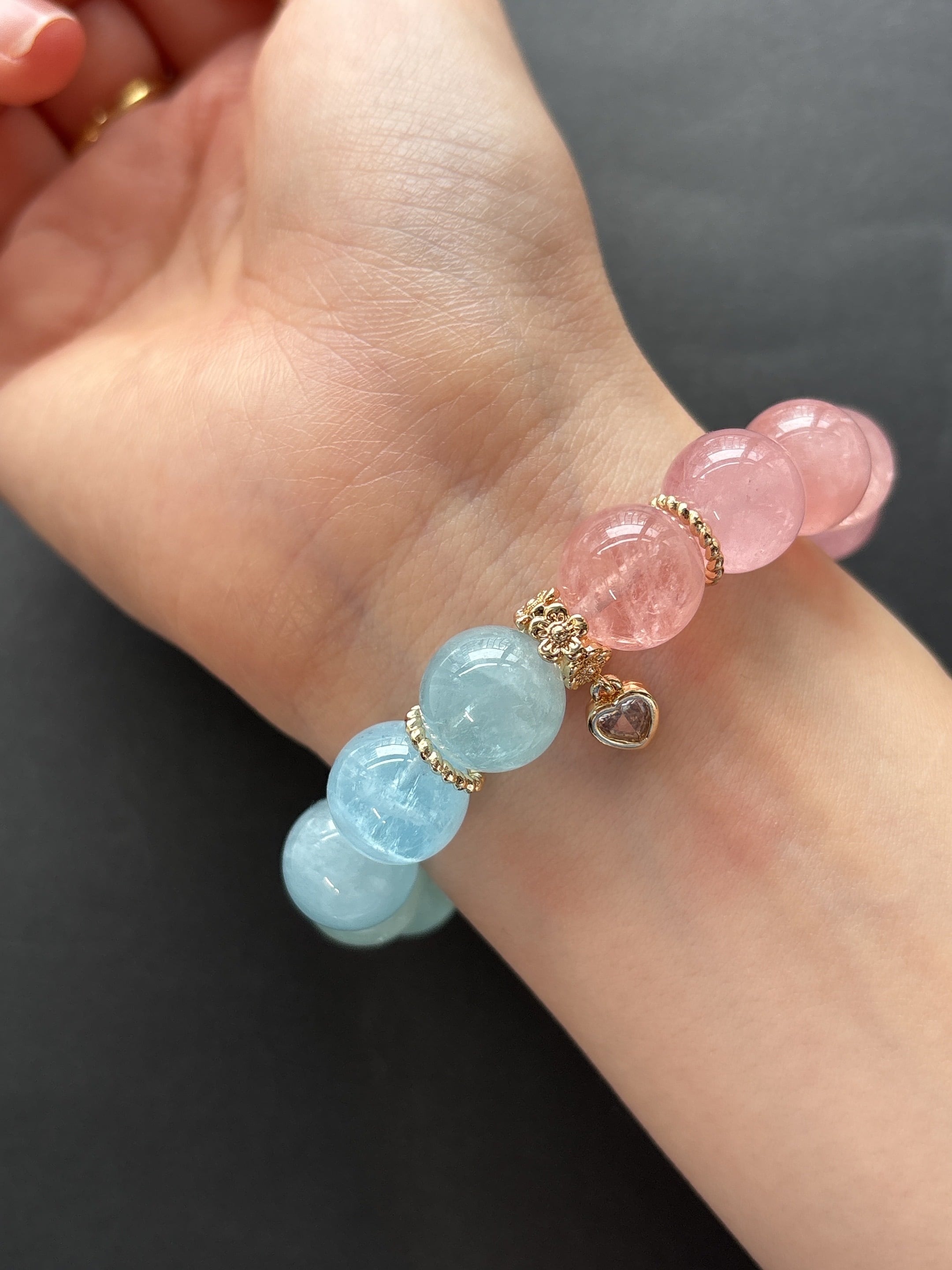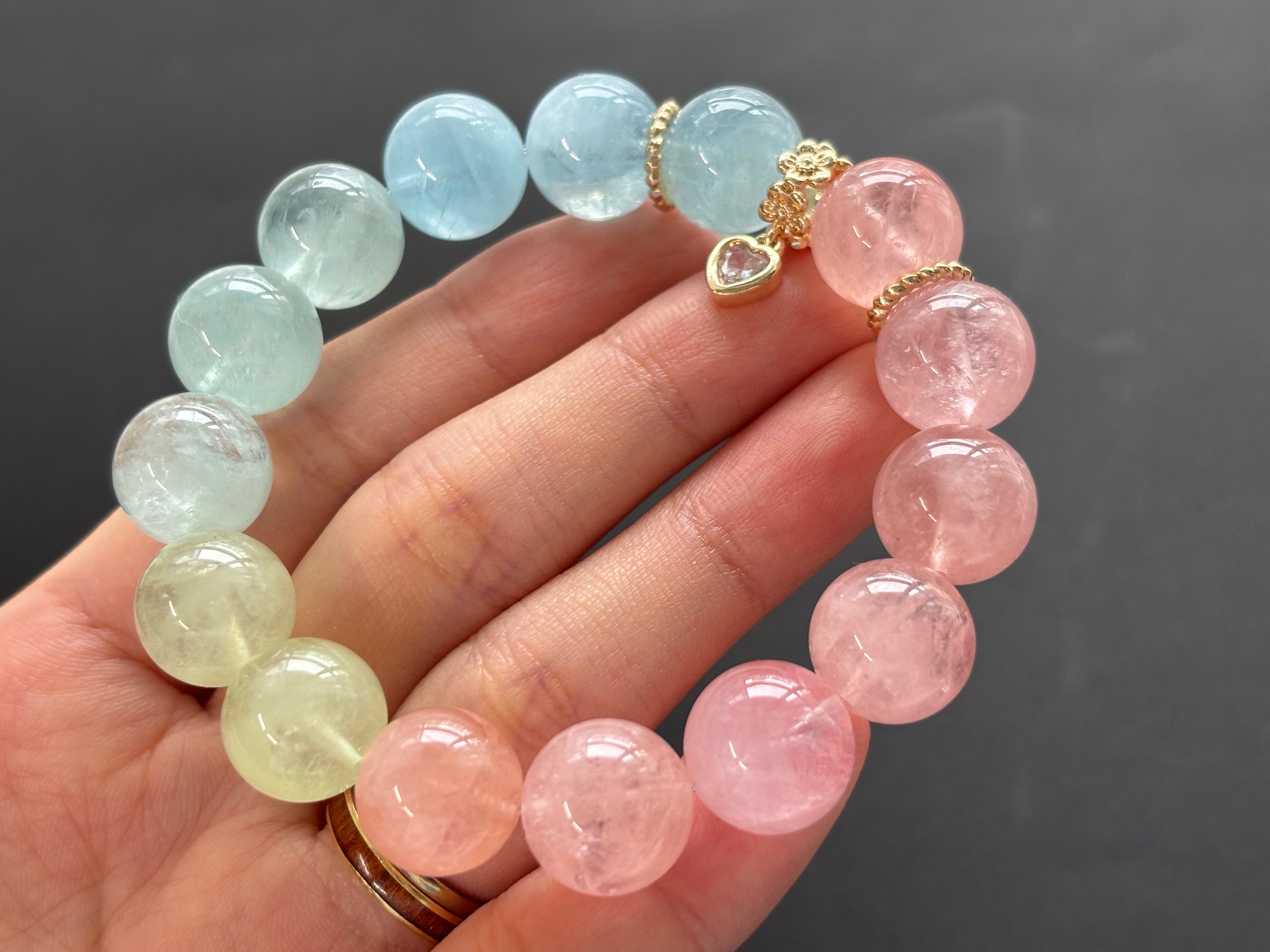 アクアマリンの爽やかなブルー、モルガナイトの優しいピンク、そしてヘリオドールの淡いイエローがバランス良く組み合わさり、透明感もありとても綺麗な仕上がりになっています。ゴールドパーツと小さなハートチャームがアクセントになり、可愛らしさと上品さを兼ね備えています。