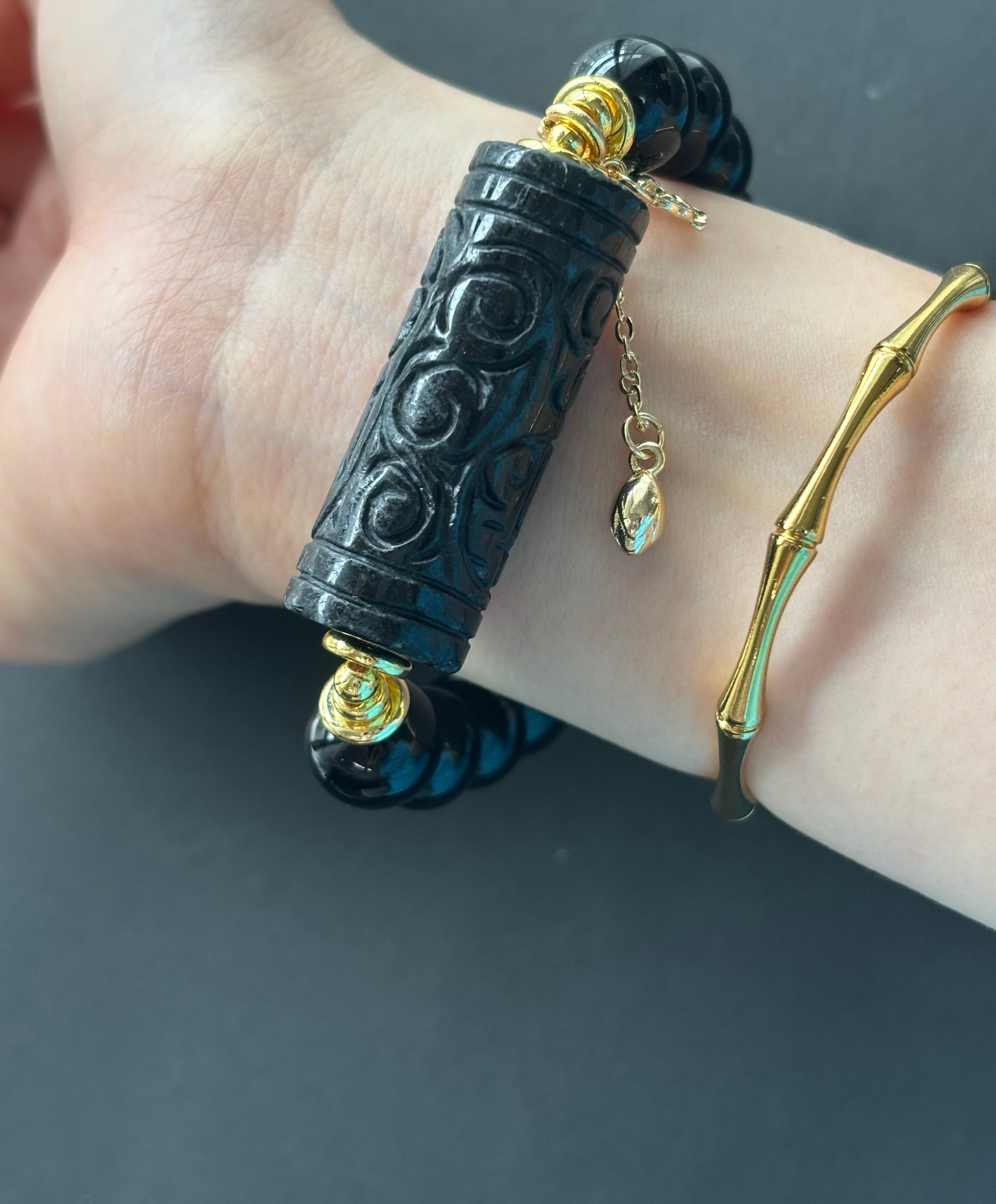 ミャンマー産地の黒翡翠を使用した天珠をメインに、艶やかなモリオンを組み合わせたデザインブレスレット。