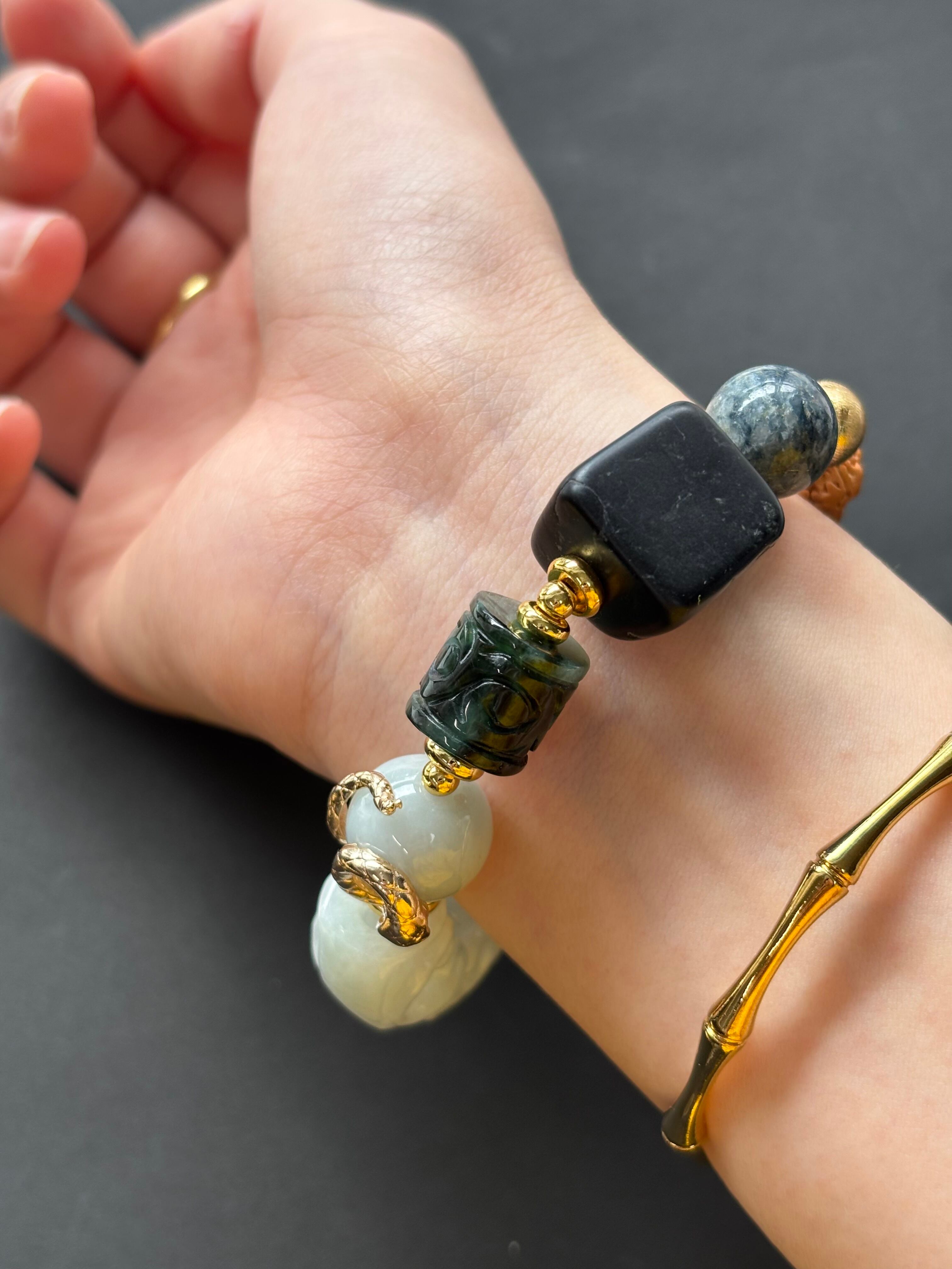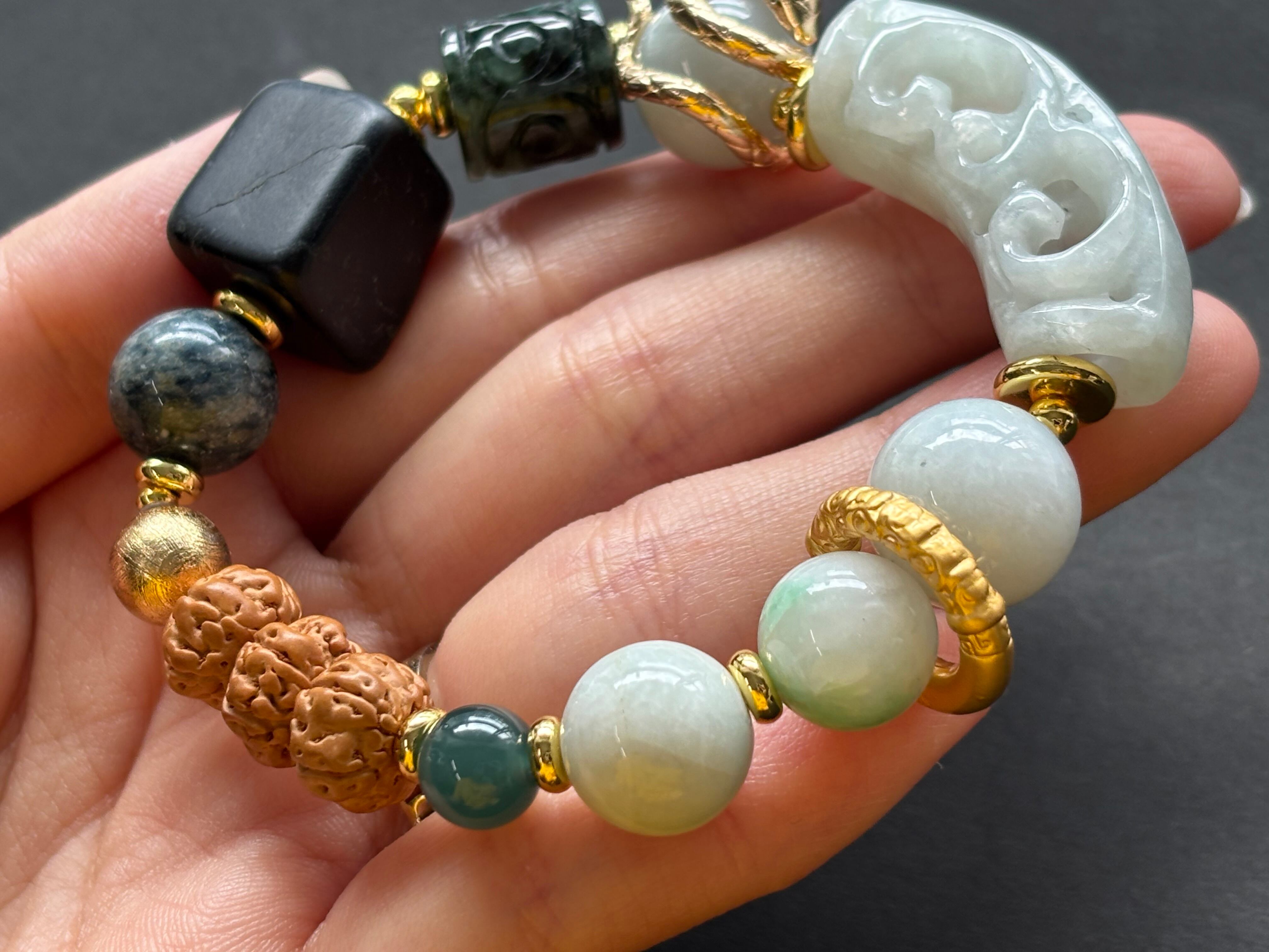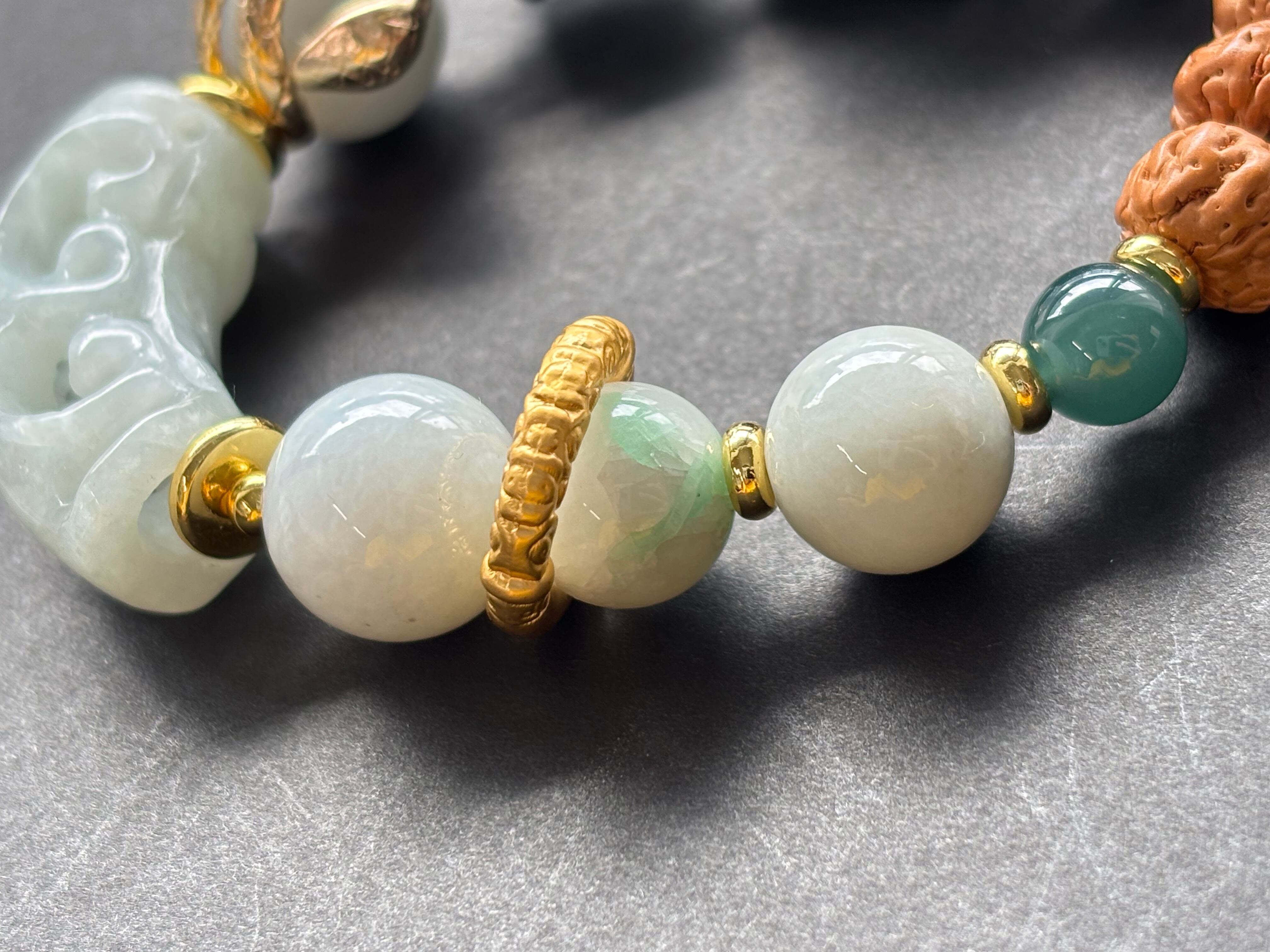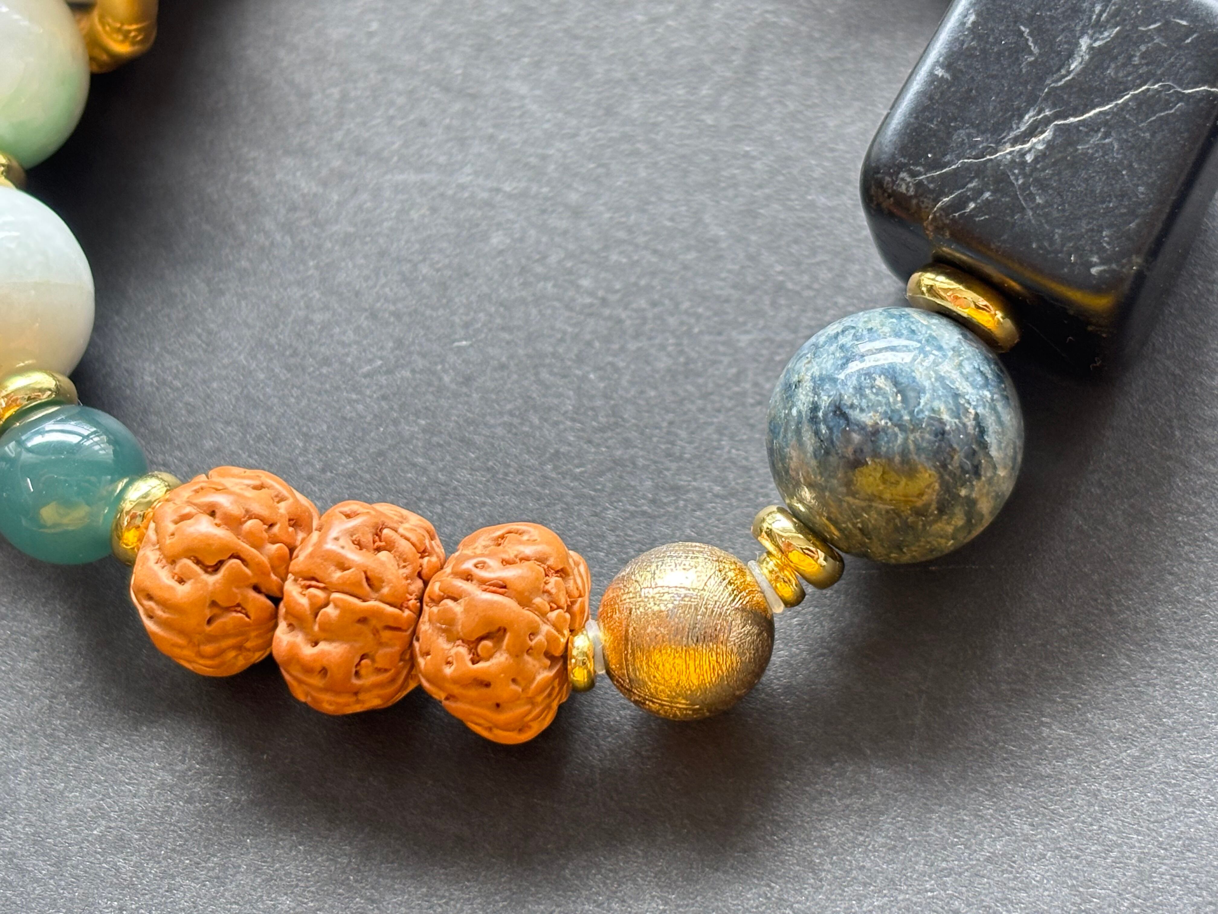 ミャンマー産翡翠を中心に、産地や個性の異なる天然石や聖木を組み合わせたお守りブレスレットです。