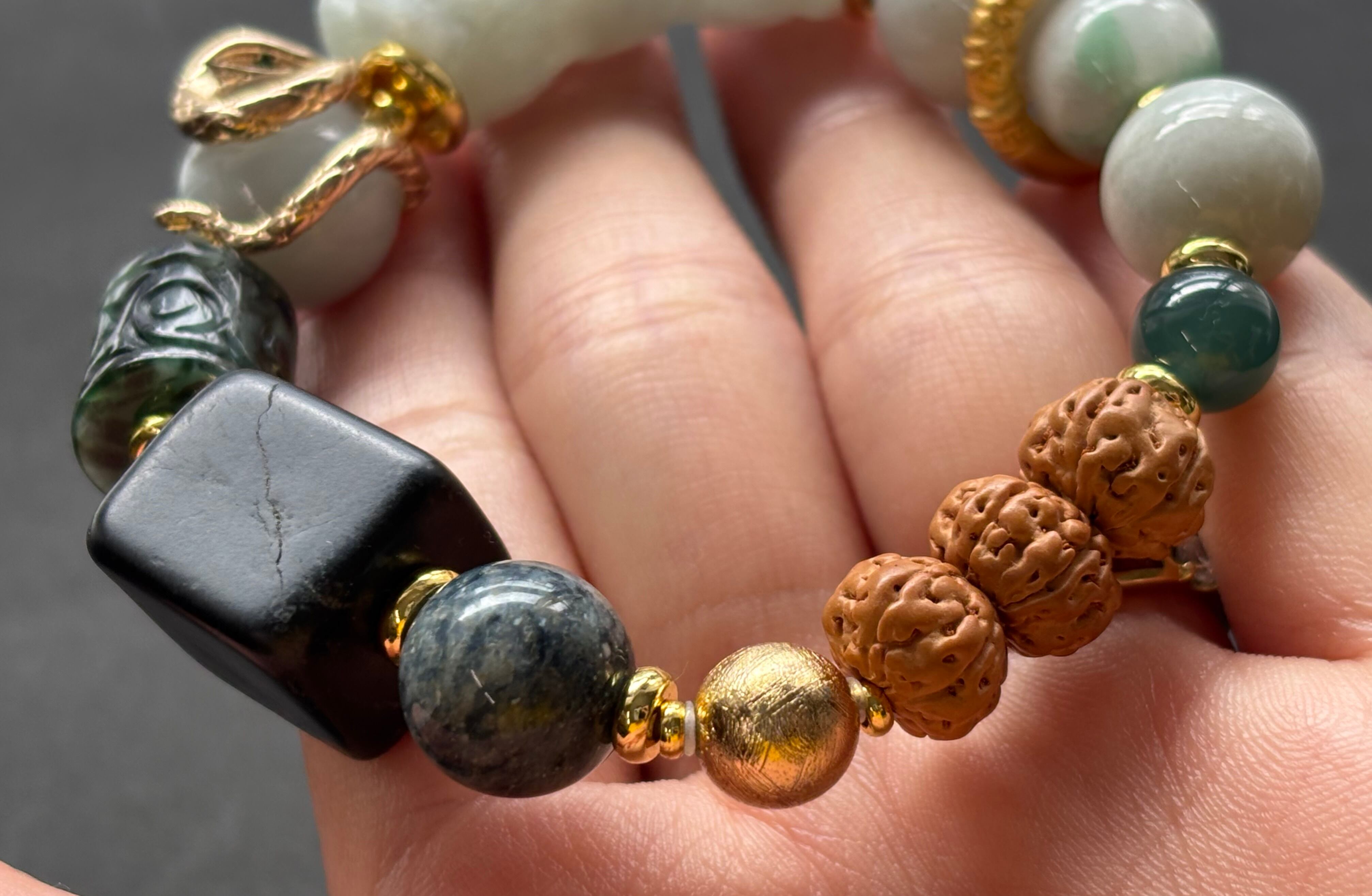 手彫りの翡翠パーツやルドラクシャ(菩提樹の実)、ギベオン隕石など、古来より守護やご加護を象徴すると言われてきた素材を配置しています。