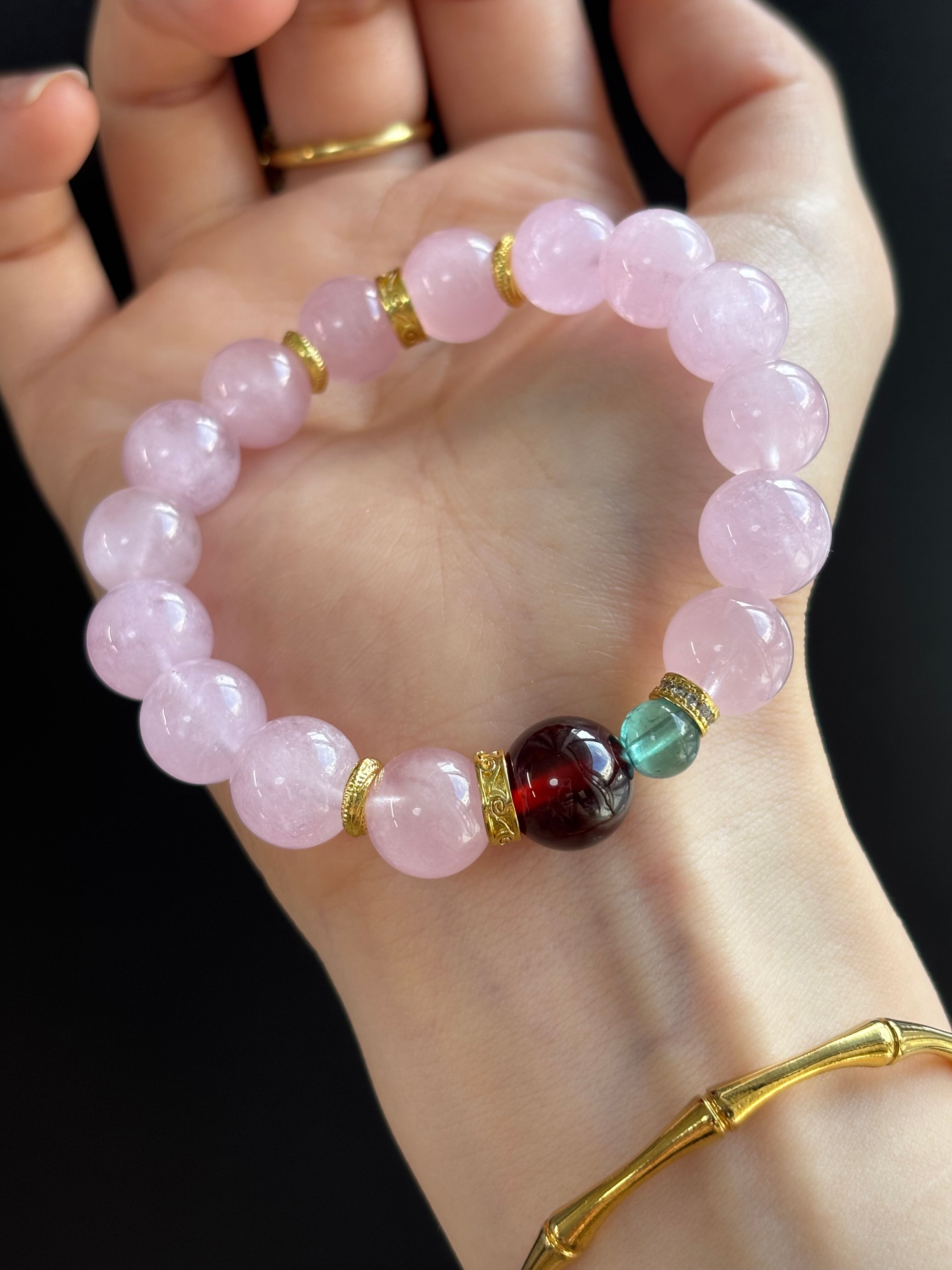 優しい桜色のモルガナイトに、深みあるレッドガーネットとスカイブルーアパタイトを組み合わせた上品なデザインブレスレット。