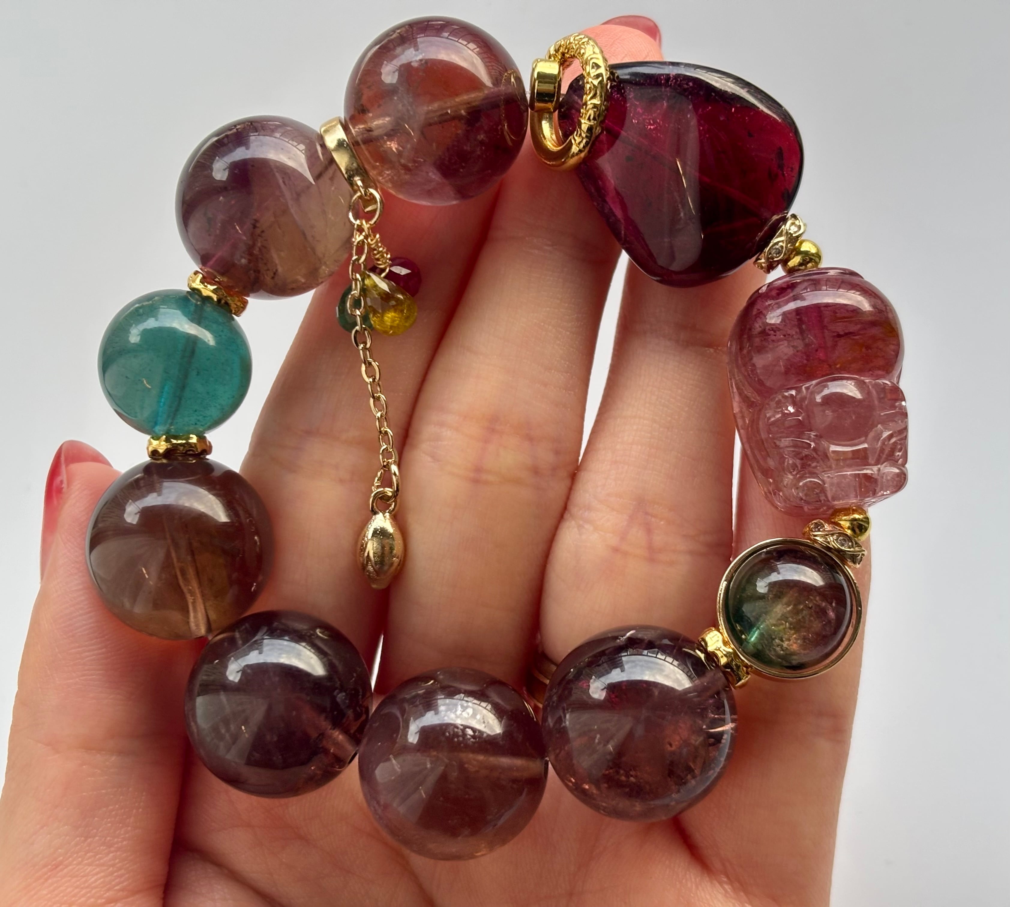 全体をまとめるレッドスモーキーアメジストが艶やかに輝き、
