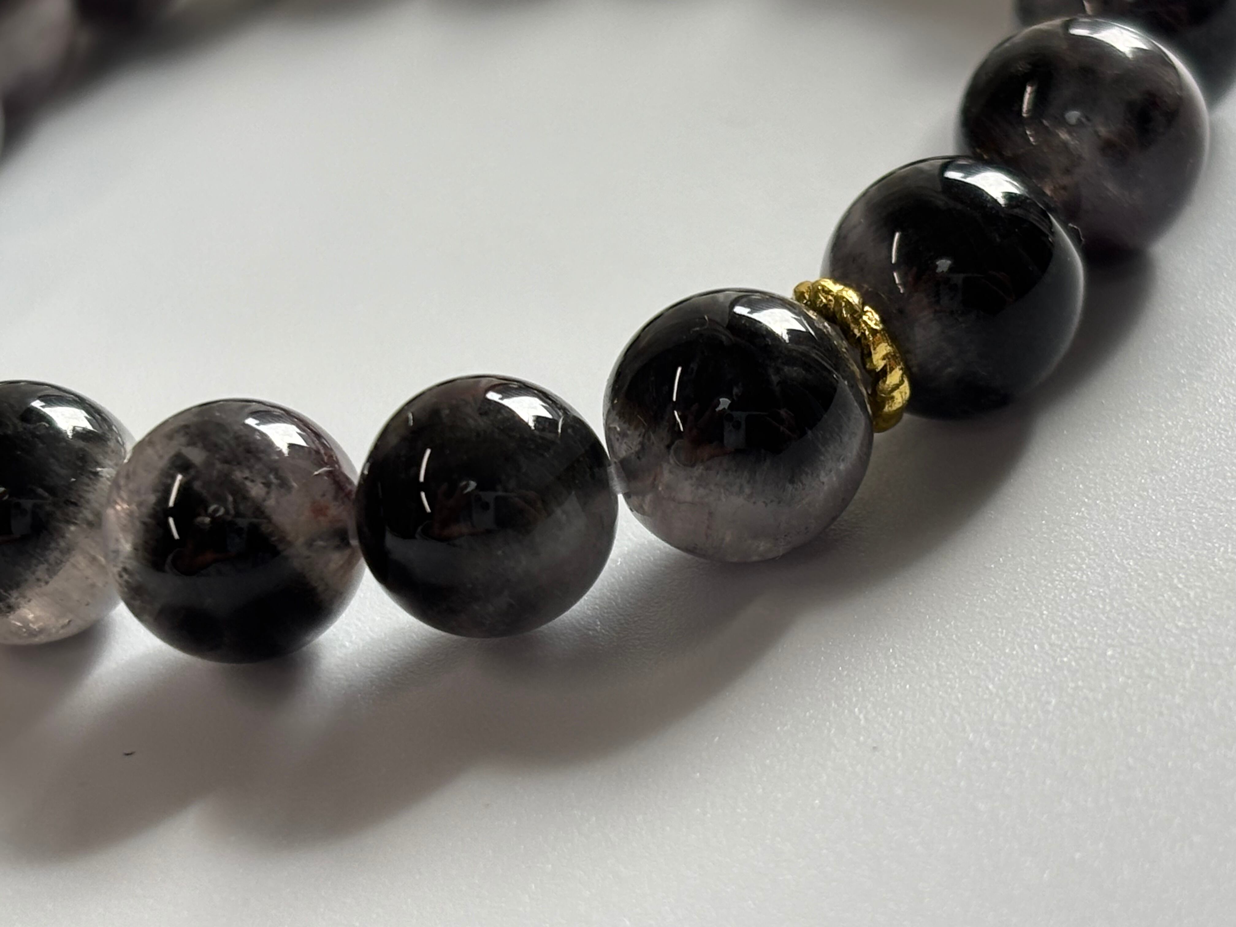 深みある紫とグレーが混ざり合い、光を受けると角度によって目のような模様が浮かぶ美しいオーラライト。
