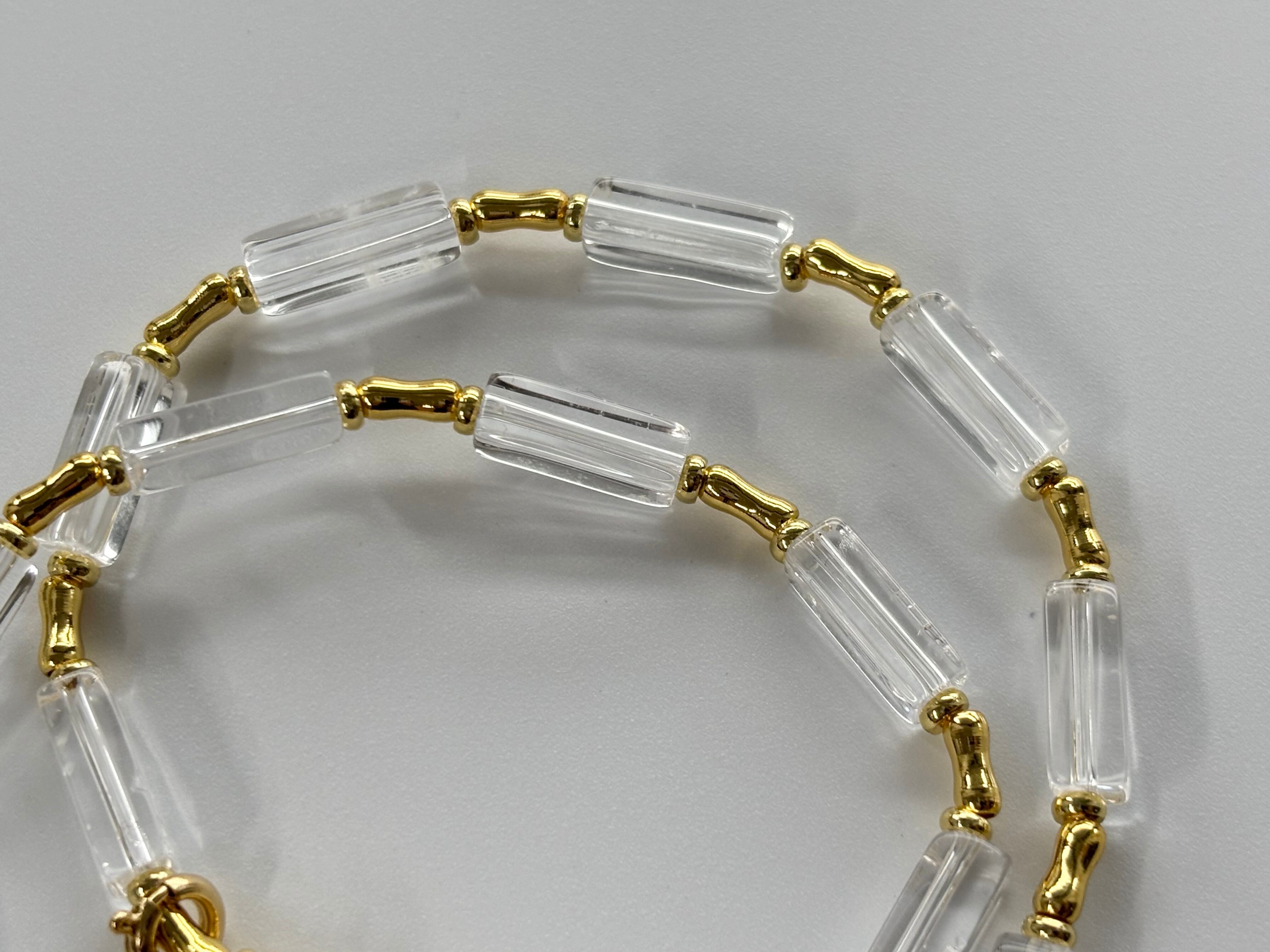 珍しい長方形カットの水晶を並べ、ゴールドパーツで繋ぐことで、シンプルながらも手元を美しく際立たせます。
