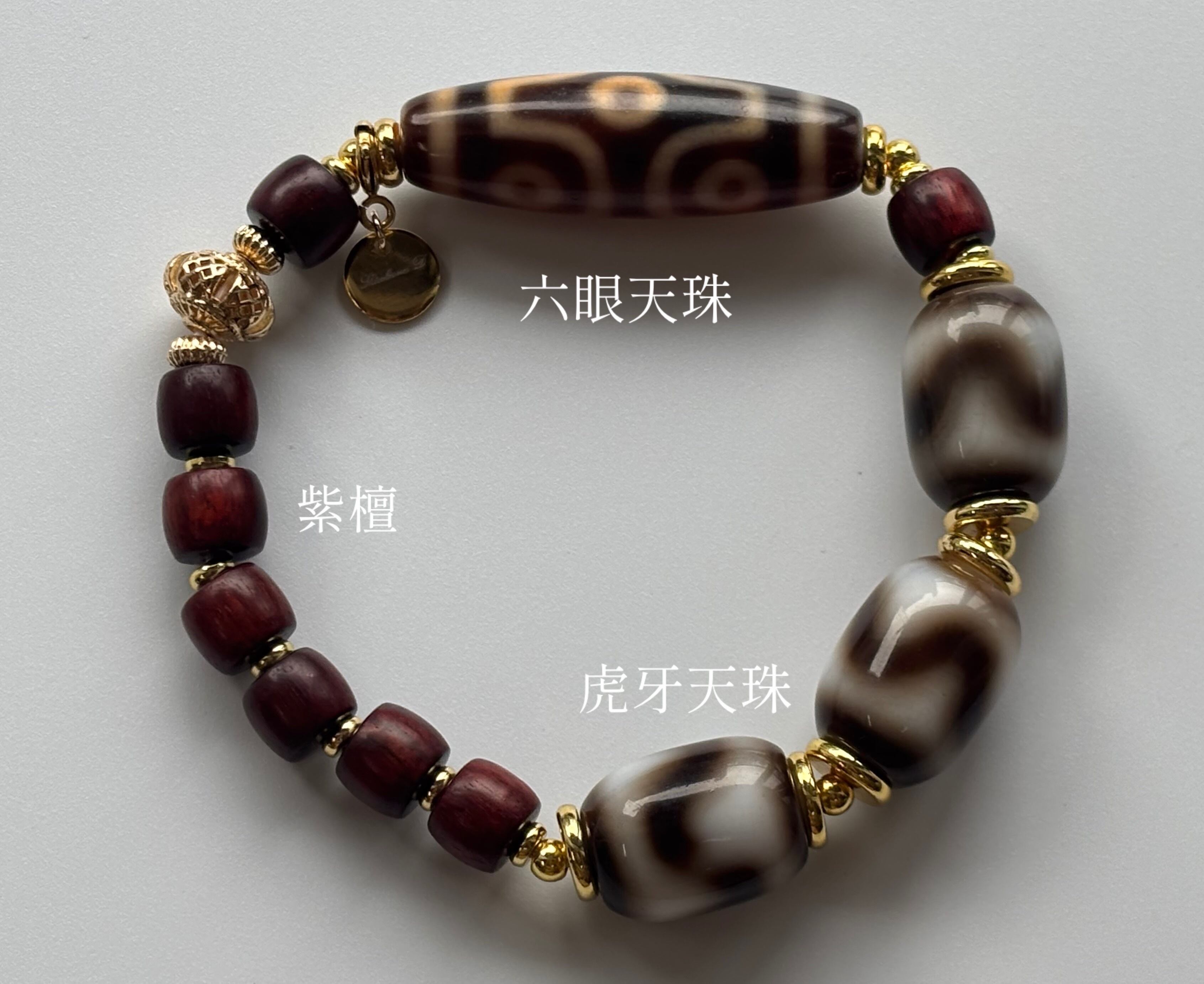 風化六眼天珠 × 虎牙天珠 × 紫檀 お守りデザインブレスレット