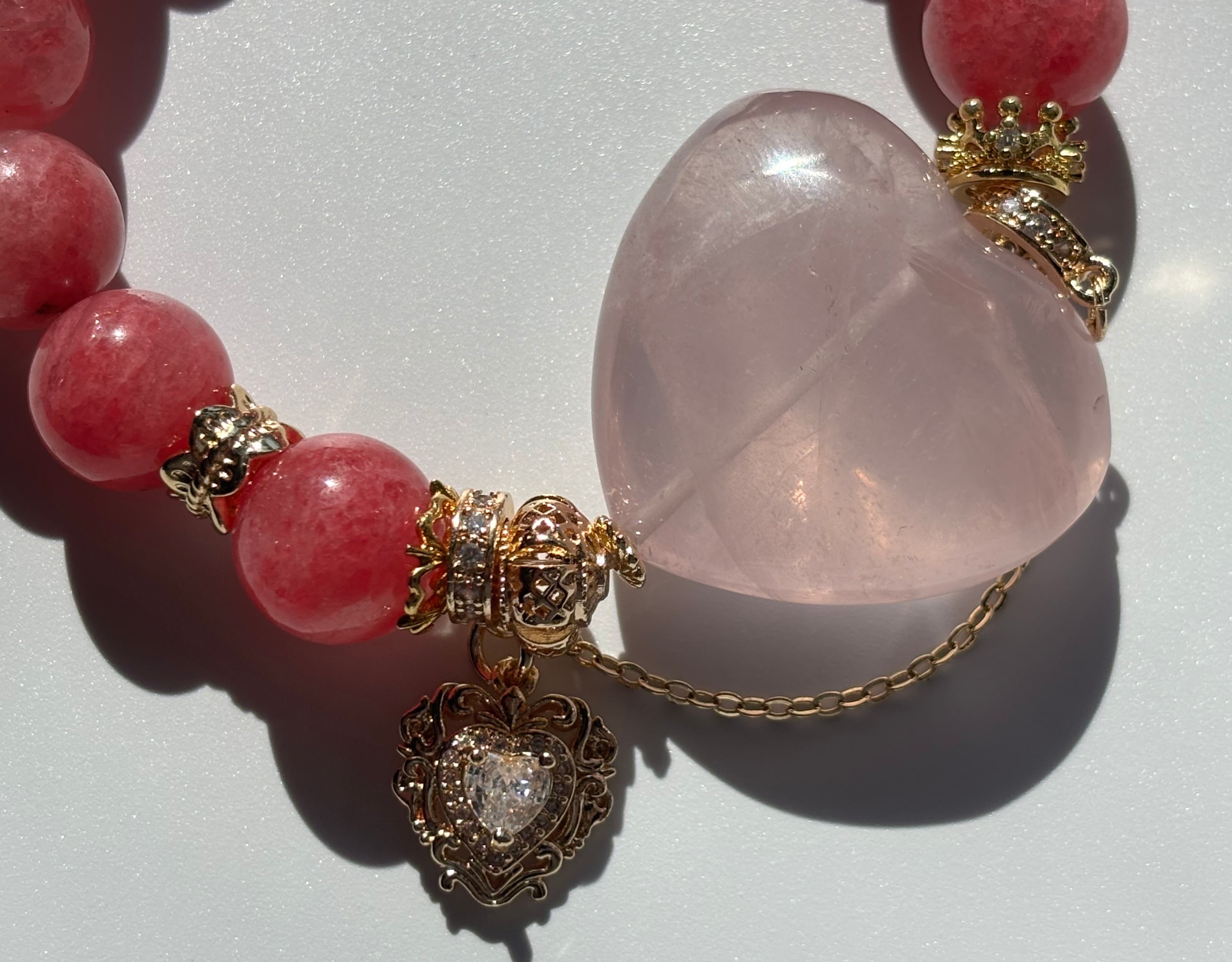 甘ピンク ロードナイト ローズクォーツハート デザインブレスレット
