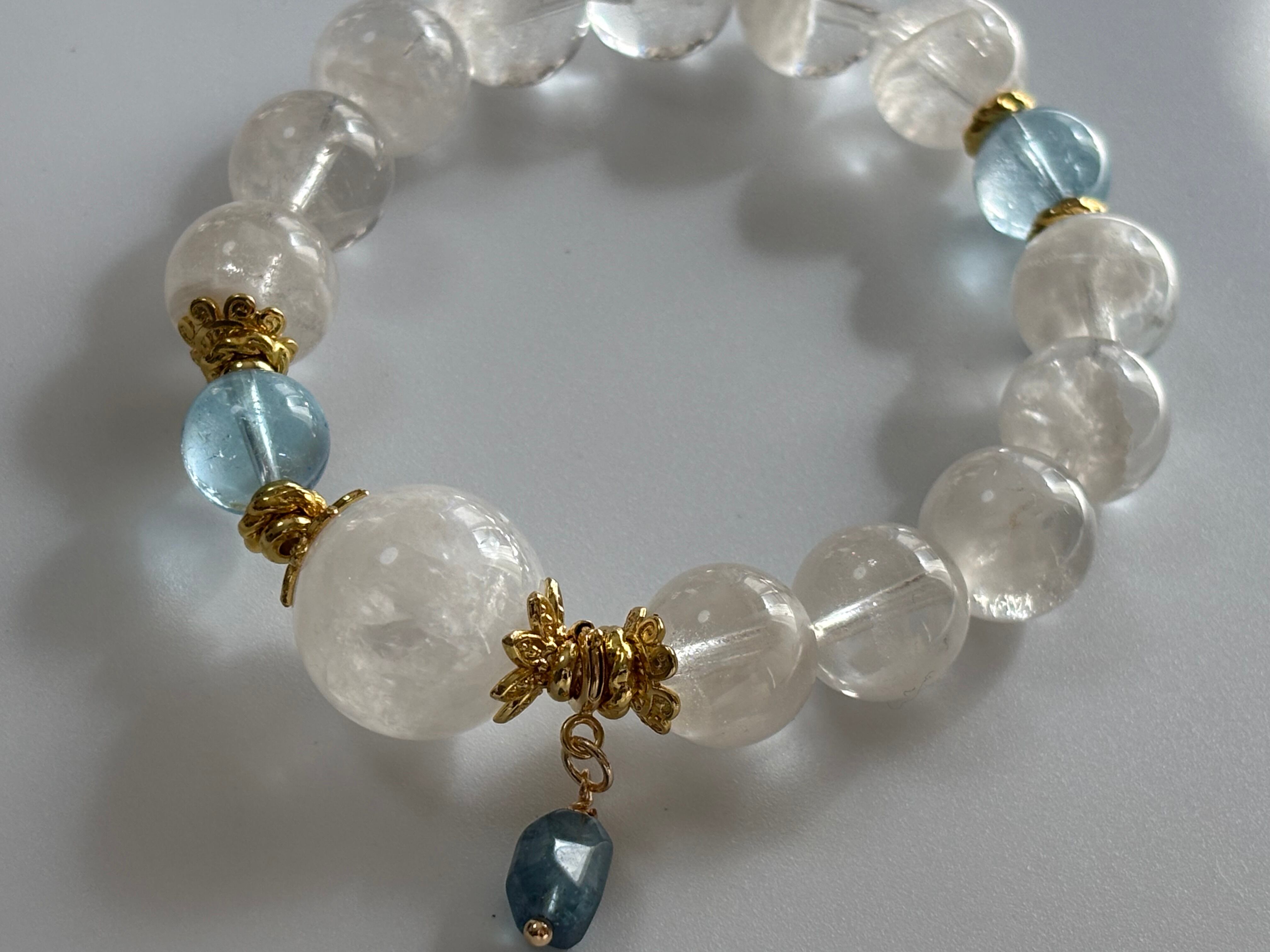 ポイントには爽やかなブルートパーズを、チャームには雫型のアクアマリンを添え、清涼感のある組み合わせに仕上げています。