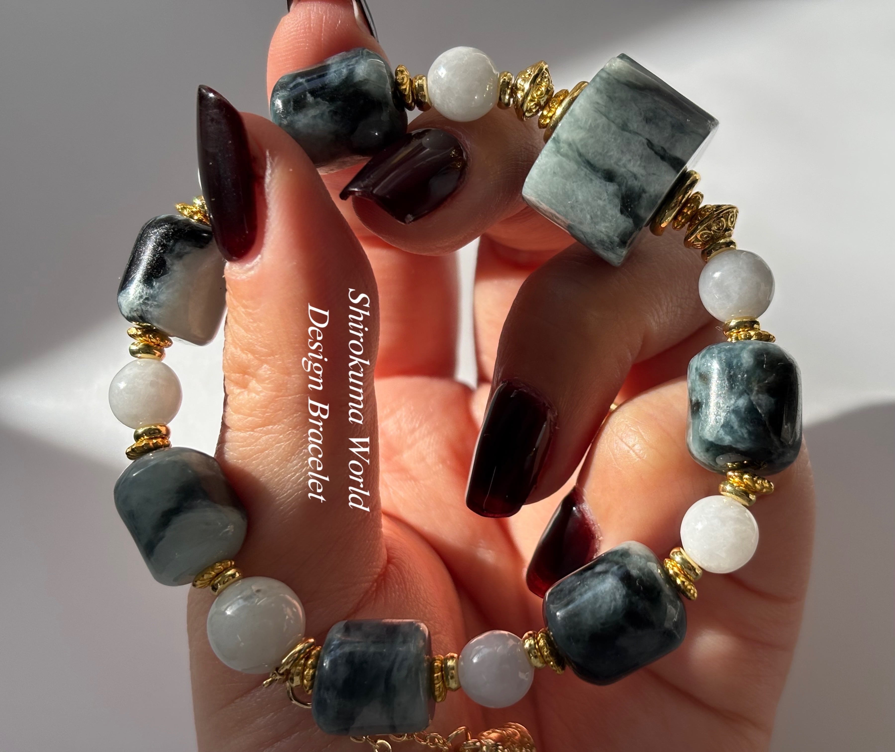 ミャンマー産の墨緑翡翠(すみみどりひすい)と、綺麗な白翡翠を組み合わせた、天然石ブレスレット。