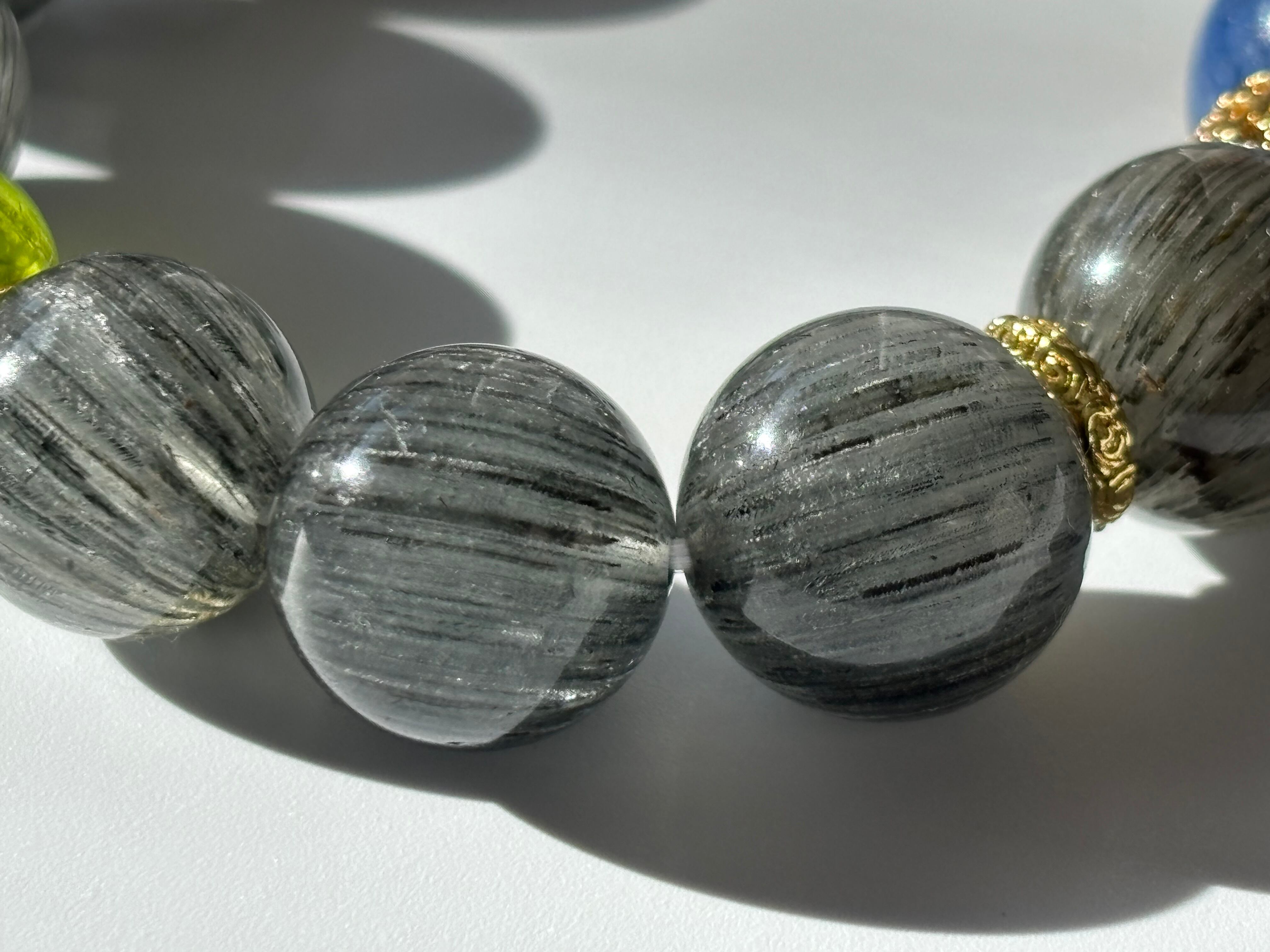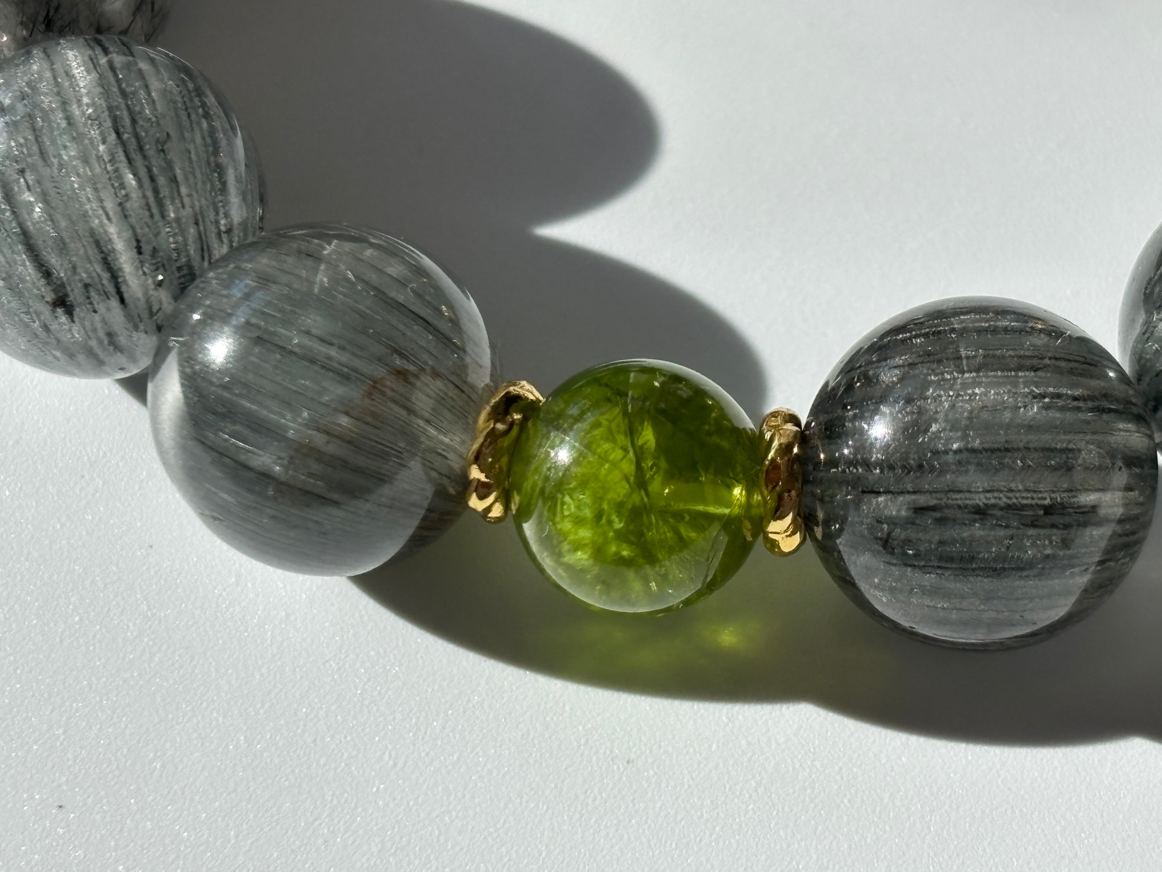 高品質 もふもふデュモルチェライトインクォーツ ペリドット ブラックグレーサゲニティックインクォーツ デザインブレスレット