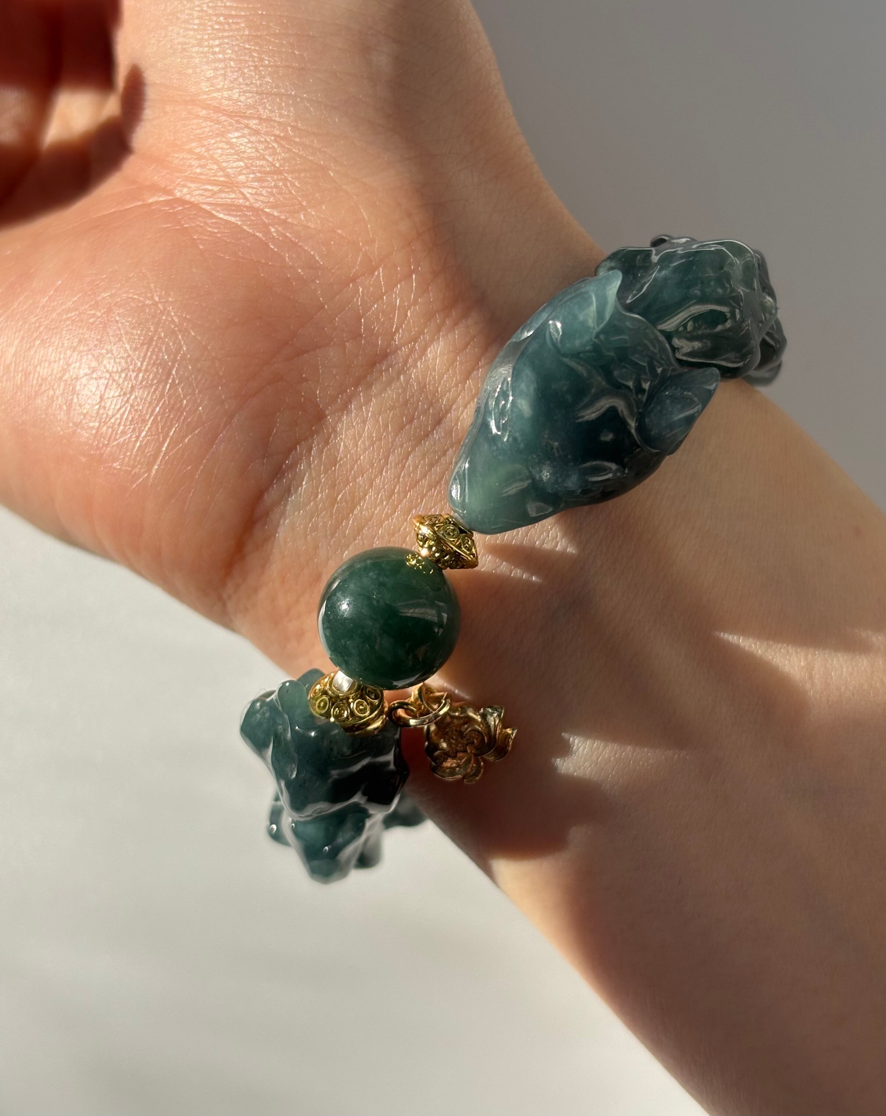 濃い深緑のグアテマラ翡翠を彫刻した龍モチーフのブレスレット。