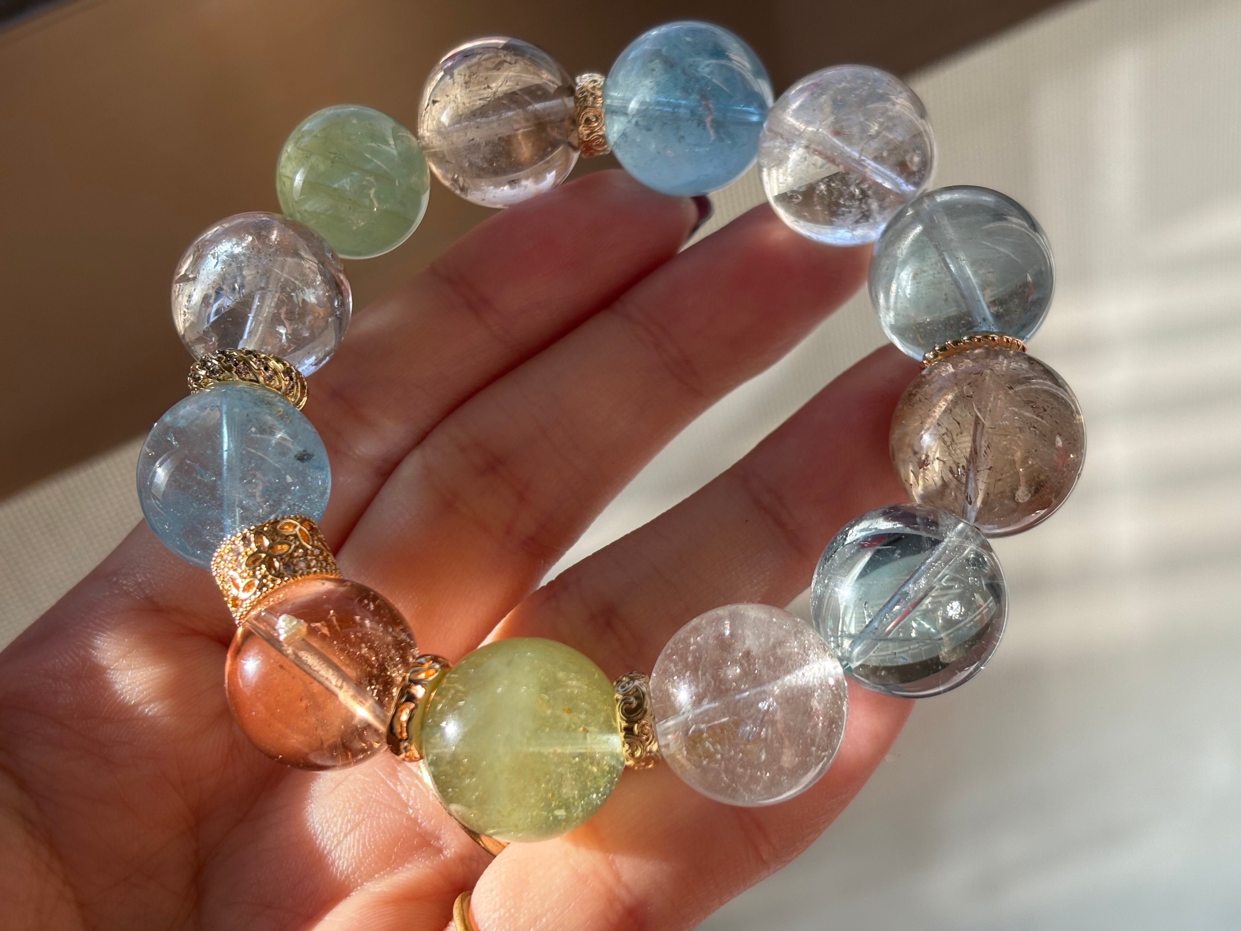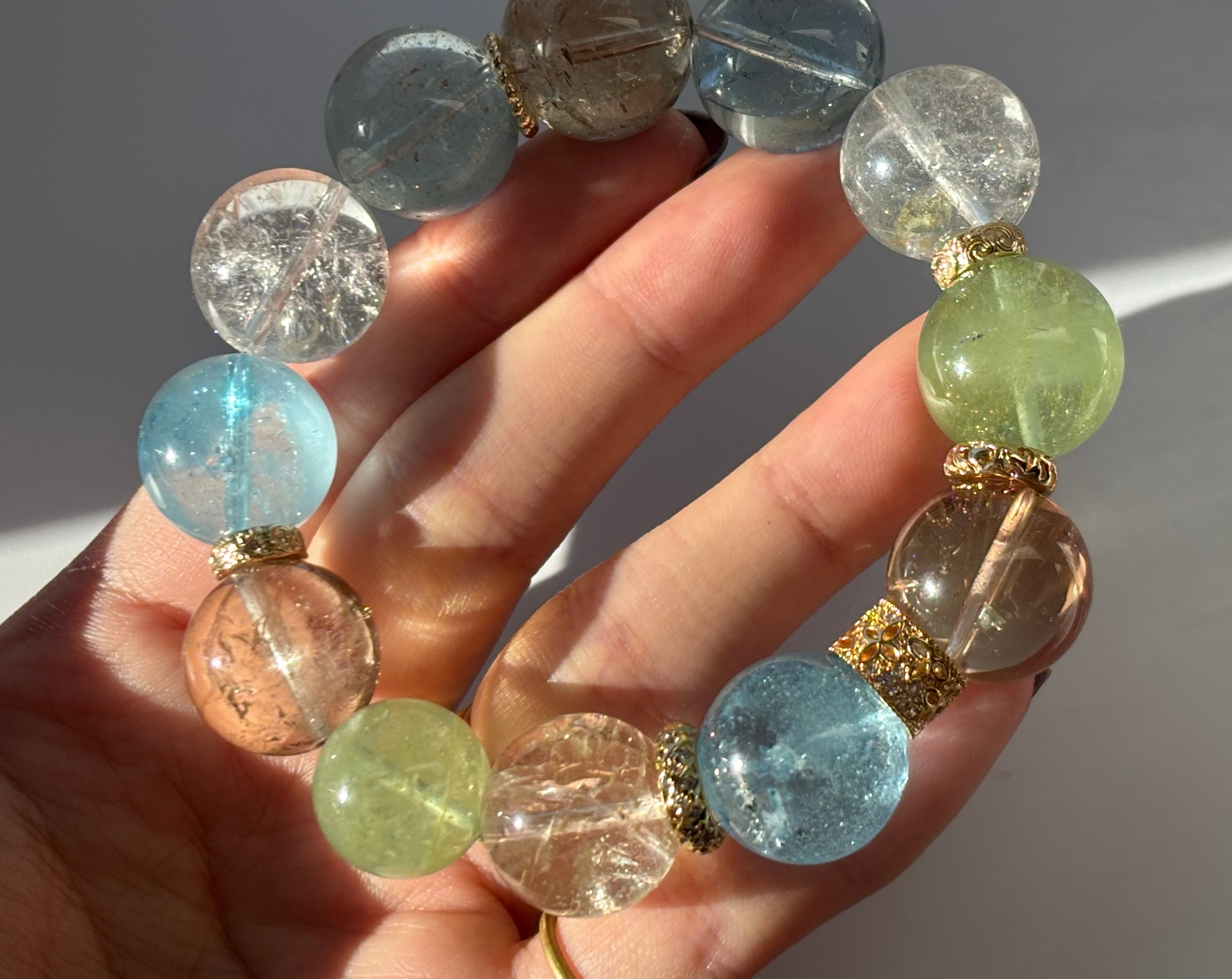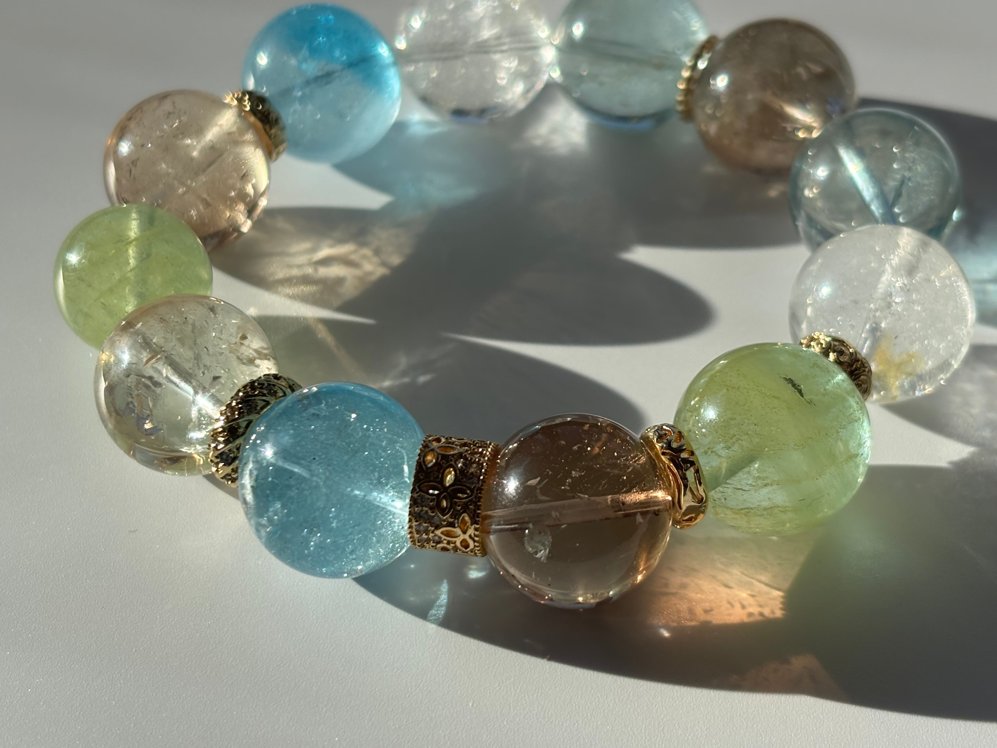 グリーン・ブルー・ブラウン・ナチュラルカラーを組み合わせた、ミックストパーズのデザインブレスレットです。