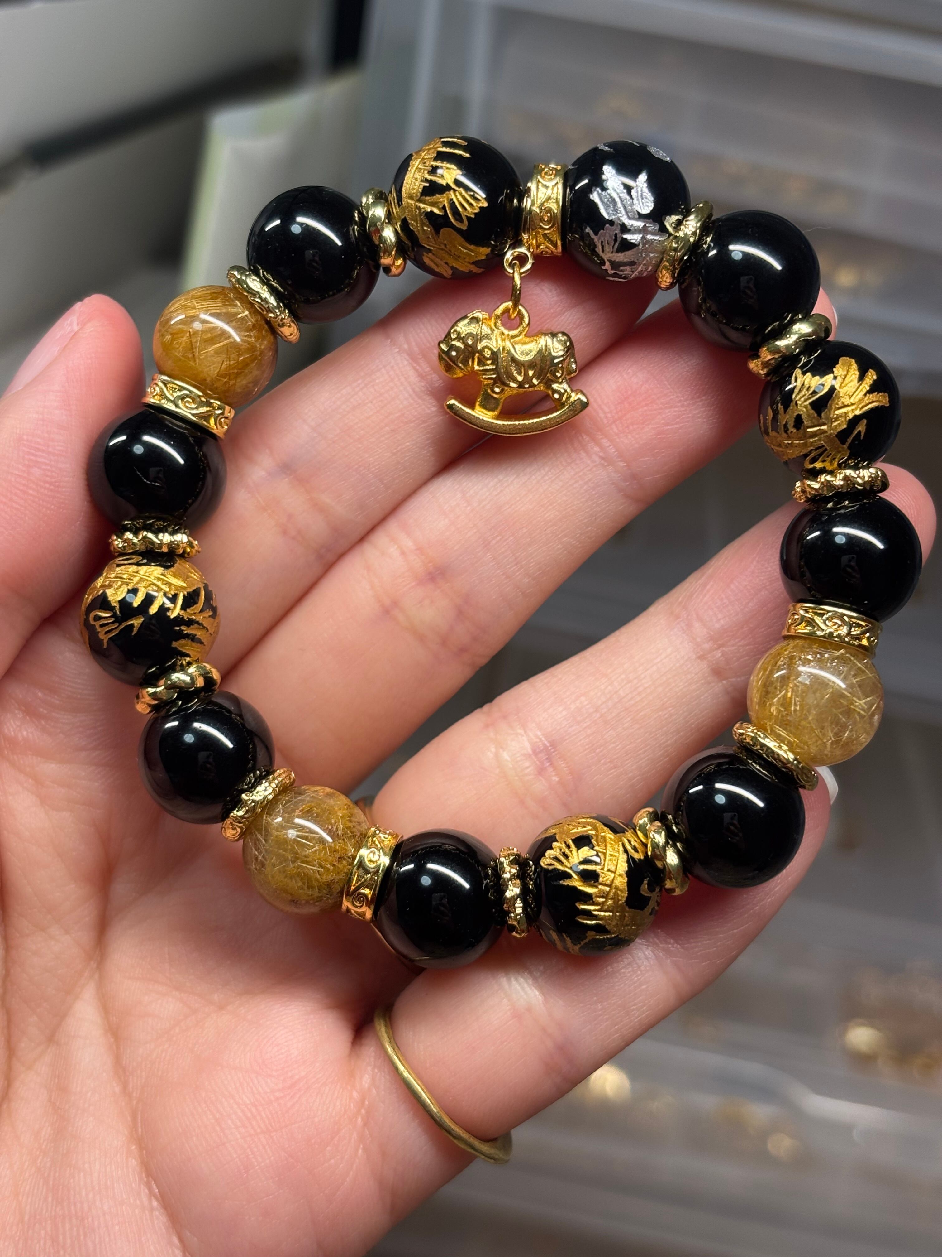 ルチルクォーツ、モリオン、龍彫りオニキス(金・銀)を組み合わせ、前向きな流れをイメージして仕立てたデザインブレスレットです。