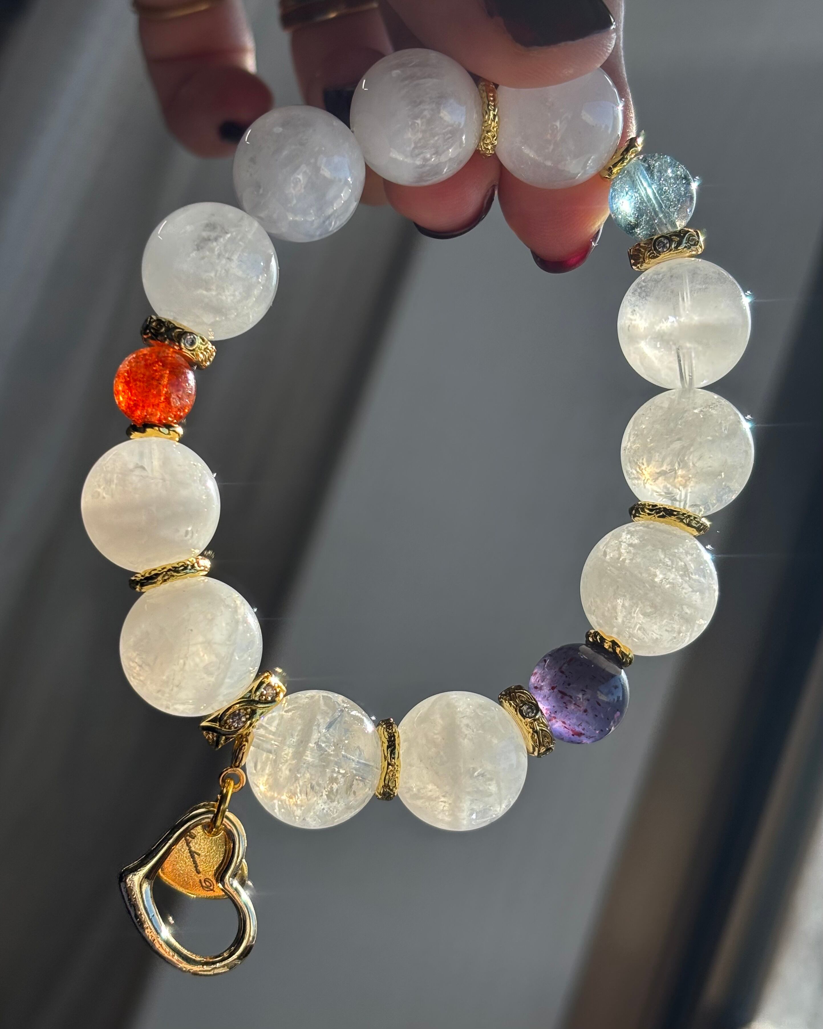 高品質のホワイトガーデンクォーツをベースに仕立てた、透明感のあるデザインブレスレット。