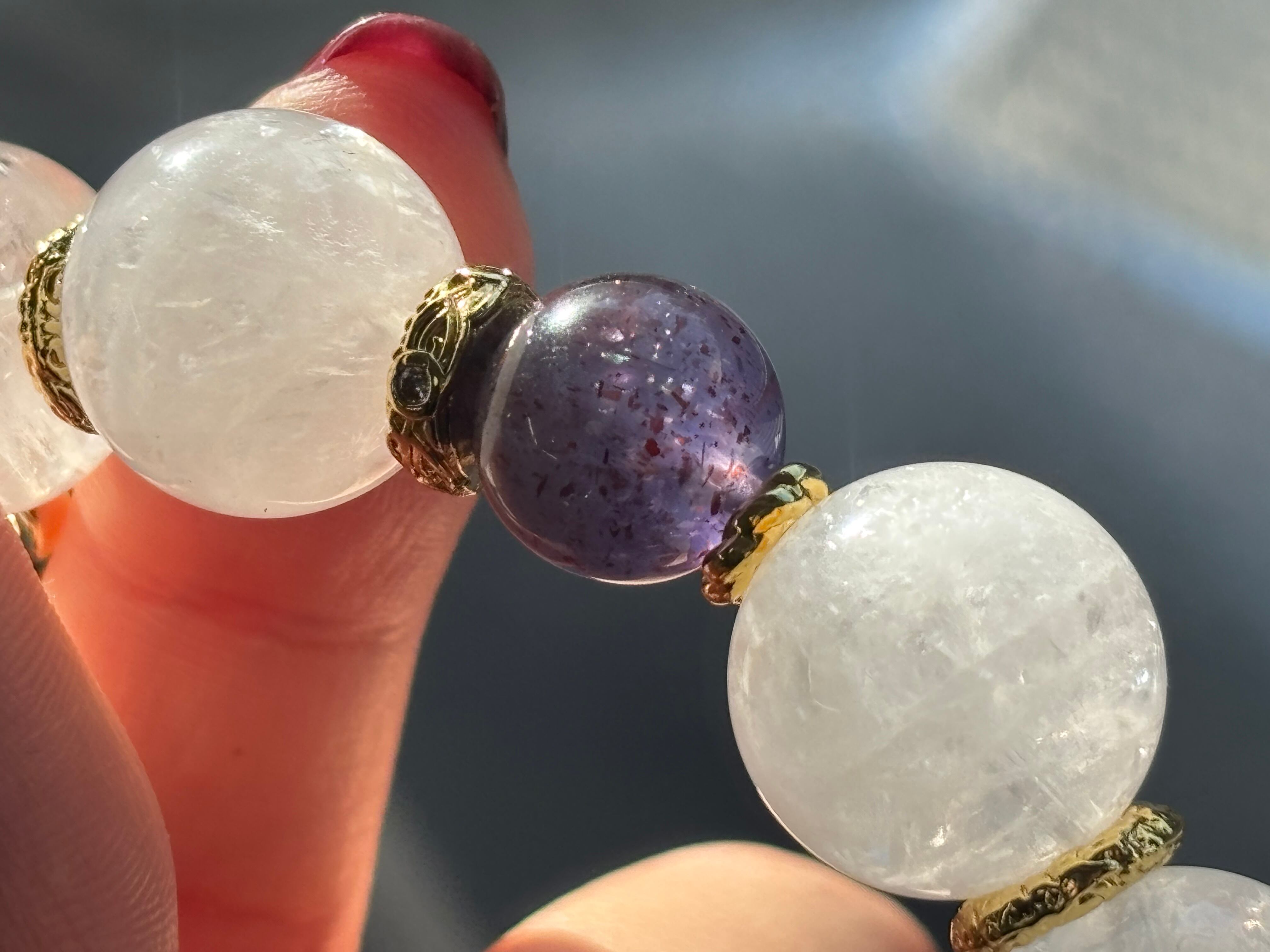 白くやわらかな内包物は、雪景色や霧がかった風景のようで、光に当たると細かな虹がきらきらと現れます。