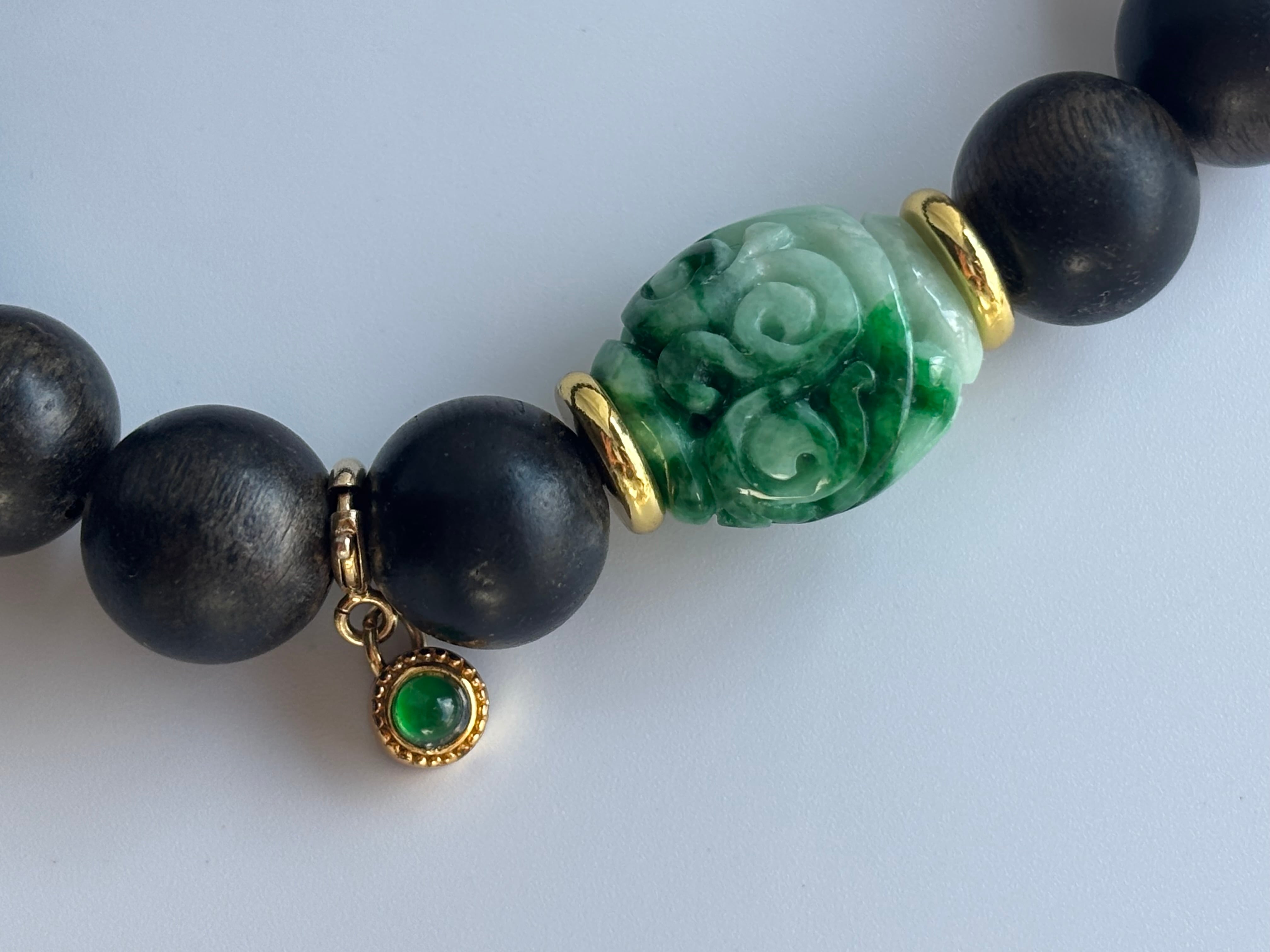 高品質 ミャンマー産 満緑 回文殊 翡翠 カリマンタン産 沈香木 ロウカン翡翠チャーム デザインブレスレット