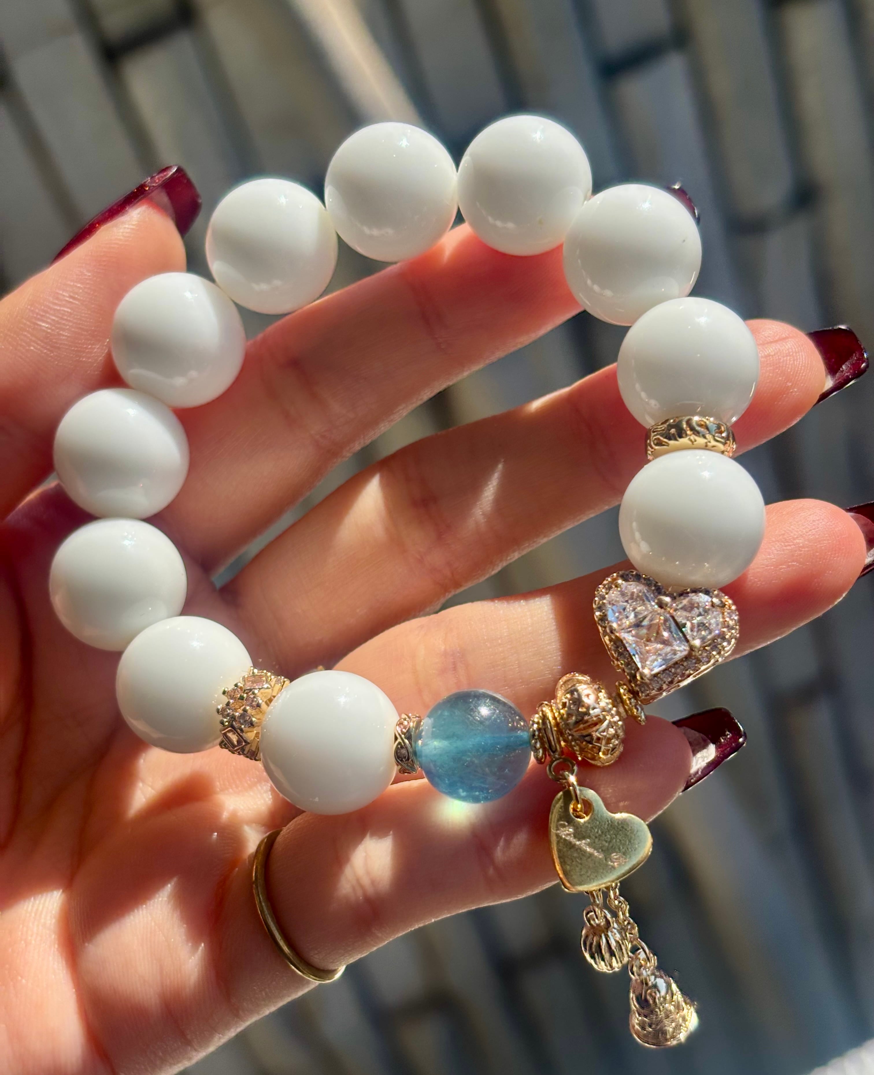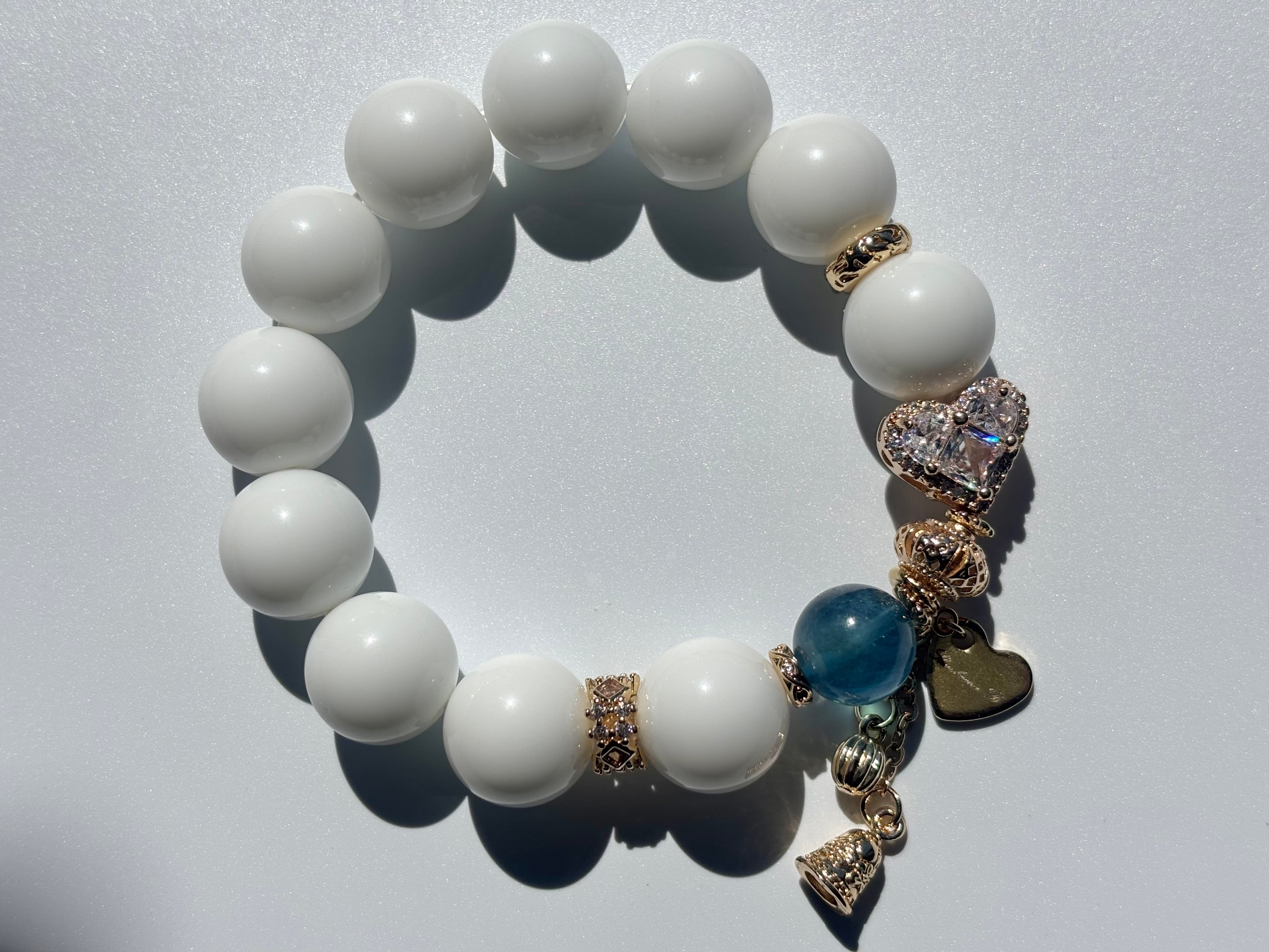 艶やかな質感が美しいホワイトオニキスをベースに、ポイントとしてディープブルーのアクアマリンを合わせたデザインブレスレットです。