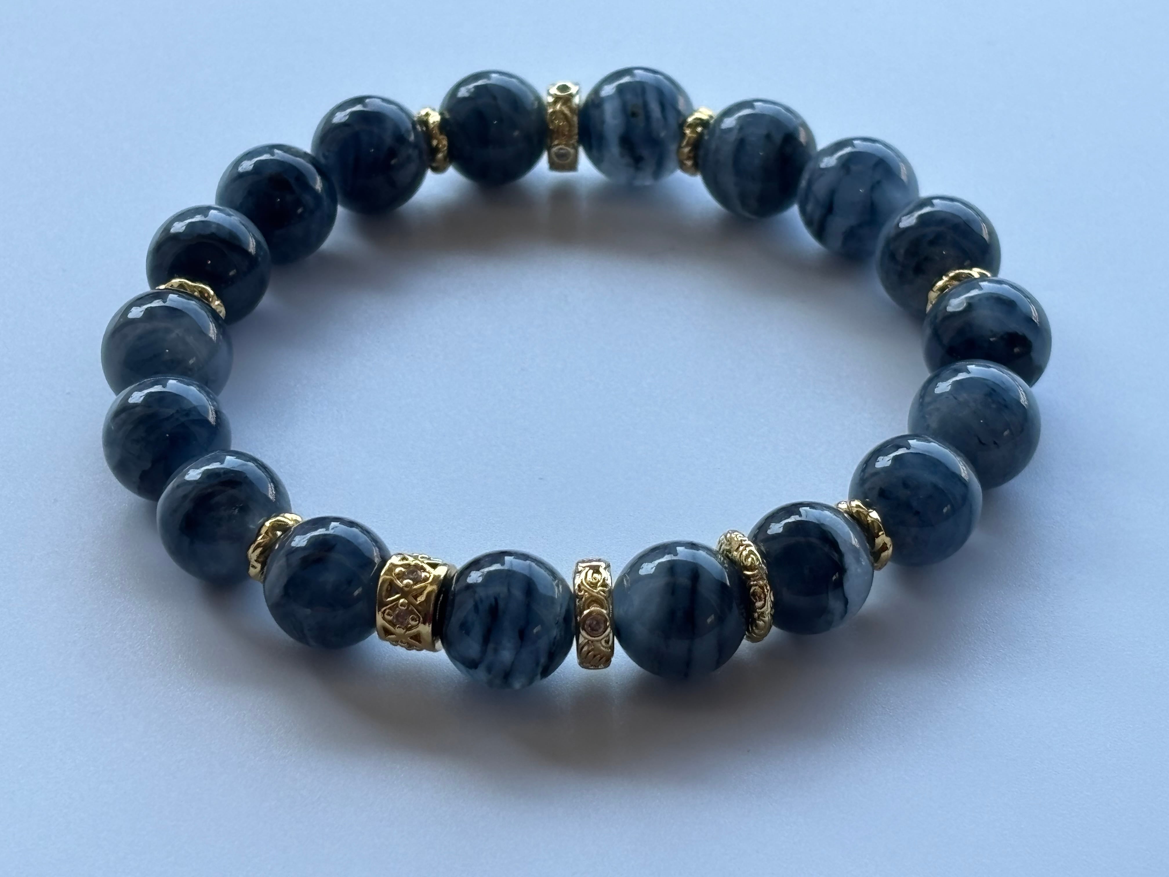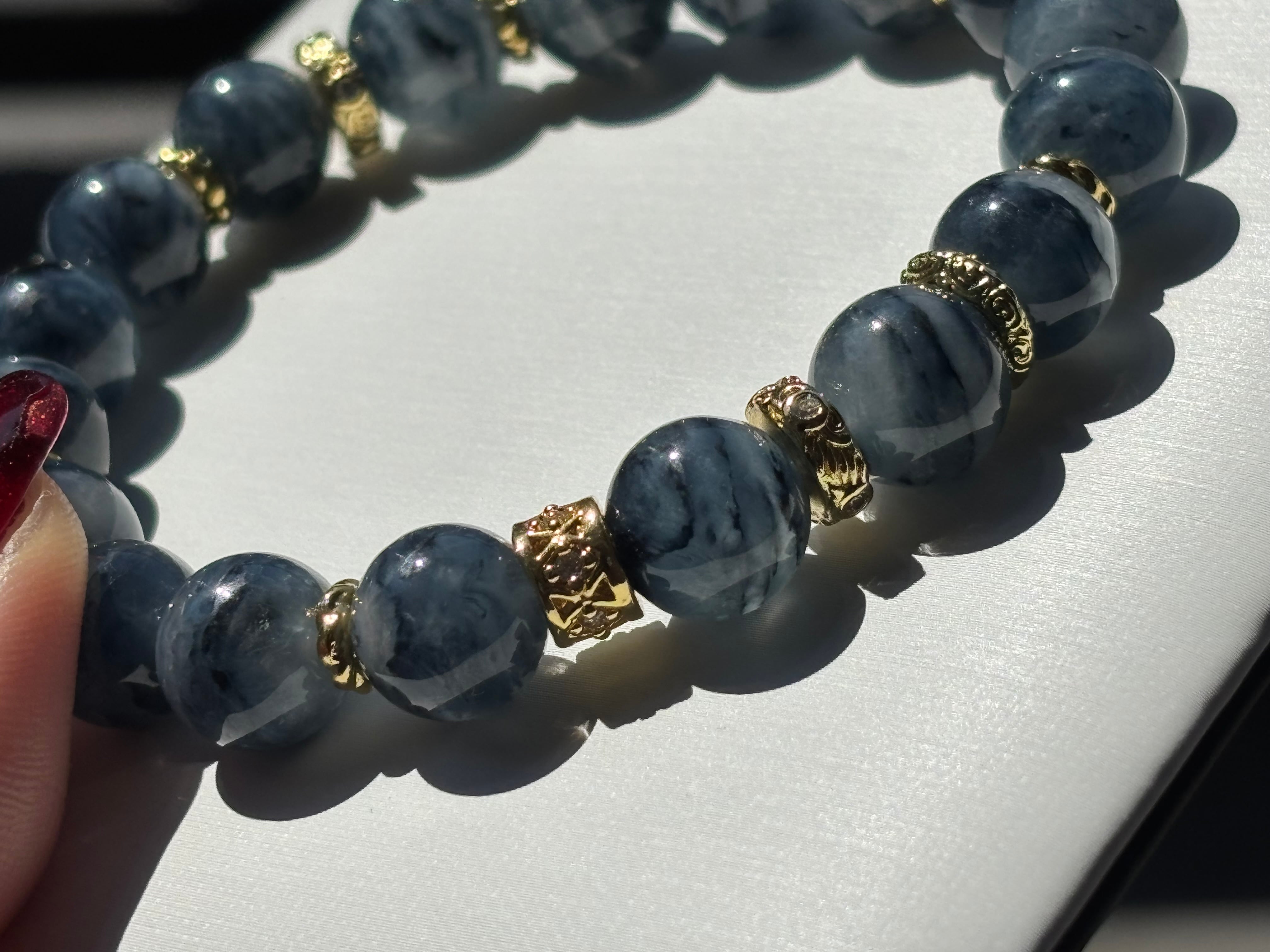 青や黒青、淡いブルーなどの波状に見える内包物が特徴の石と言われています。