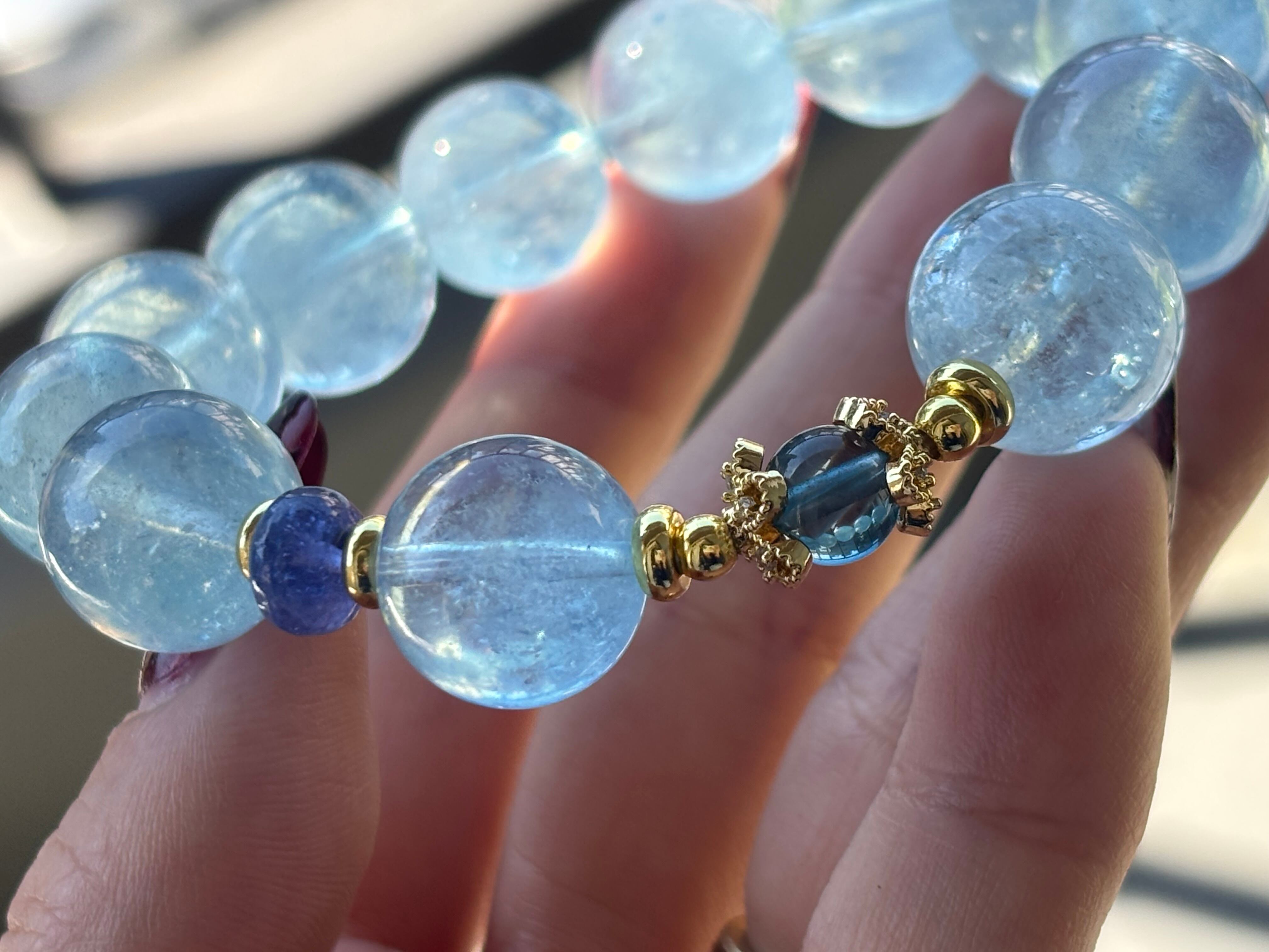 アクアマリンの柔らかなブルーに、ロンドンブルートパーズとタンザナイトの深いブルー系の石を合わせることで、ブルーグラデーションのような落ち着いた雰囲気を楽しめる組み合わせです。水色〜青紫の石同士は相性が良い組み合わせと言われており、爽やかさと上品さをあわせ持つブレスレットになっています。