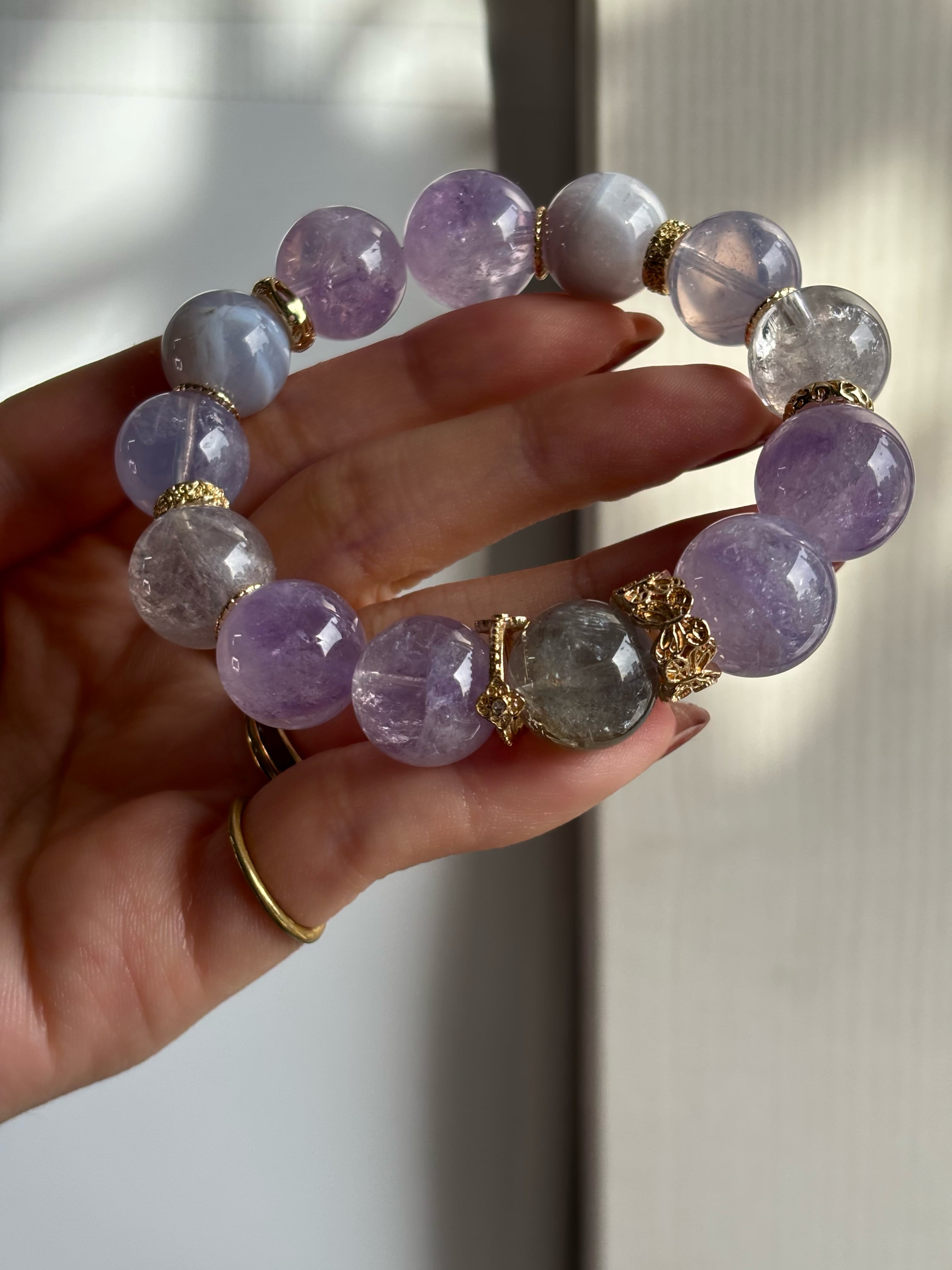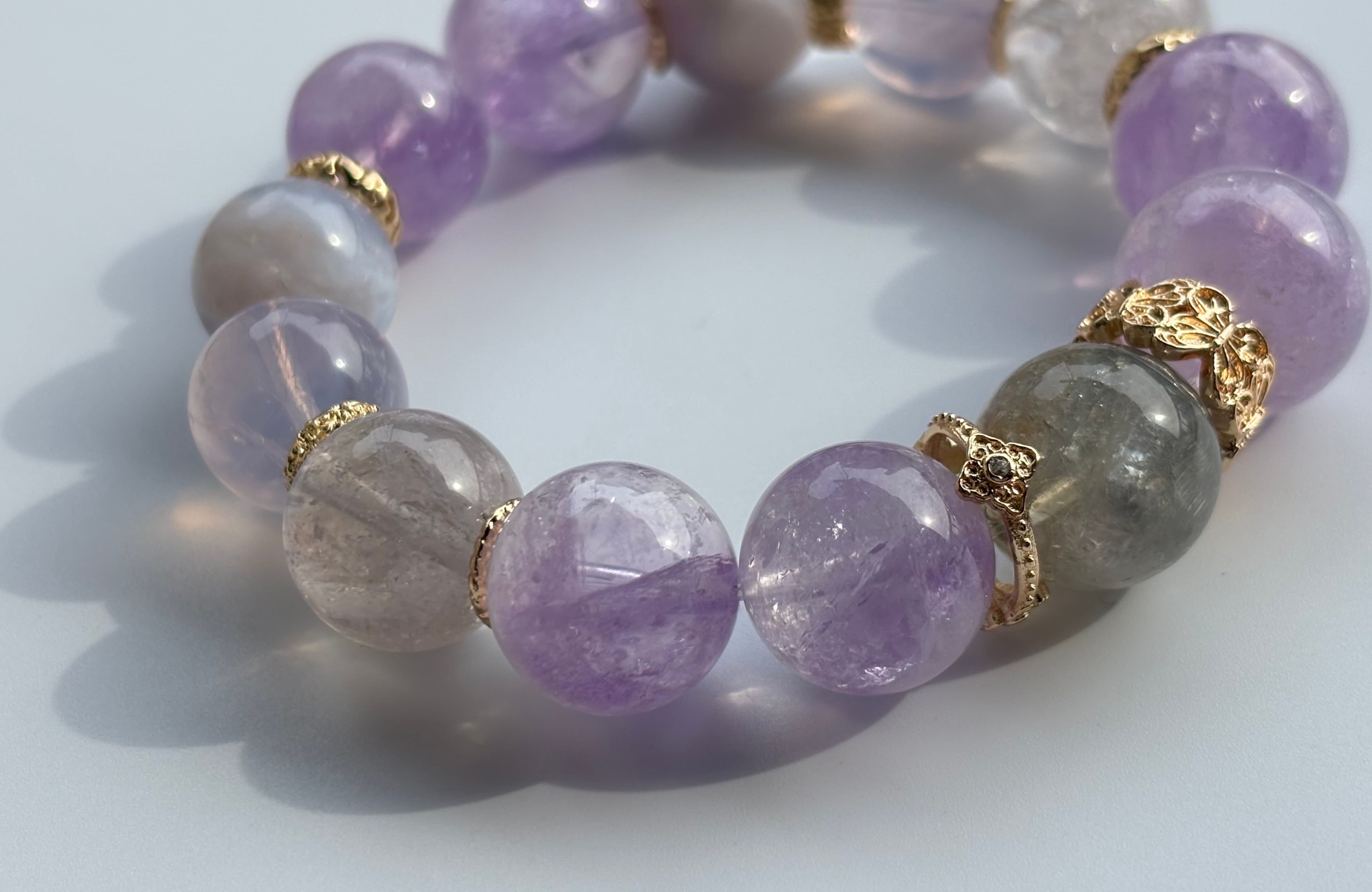 今回のブレスレットは、アイリス(虹)や「天使の指紋」と呼ばれる内包物が見られる粒が多く、光に当てると細やかな煌めきが楽しめます。