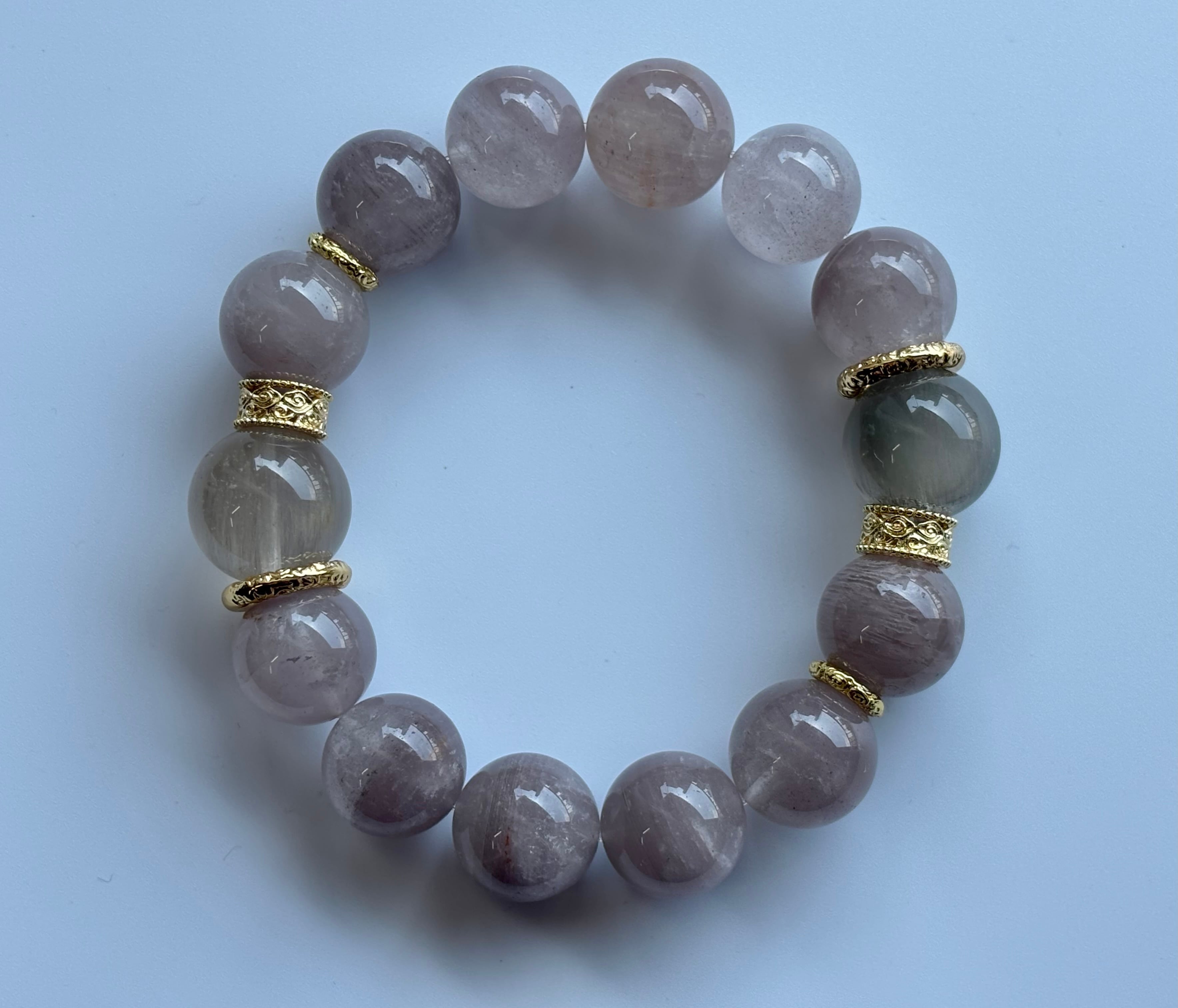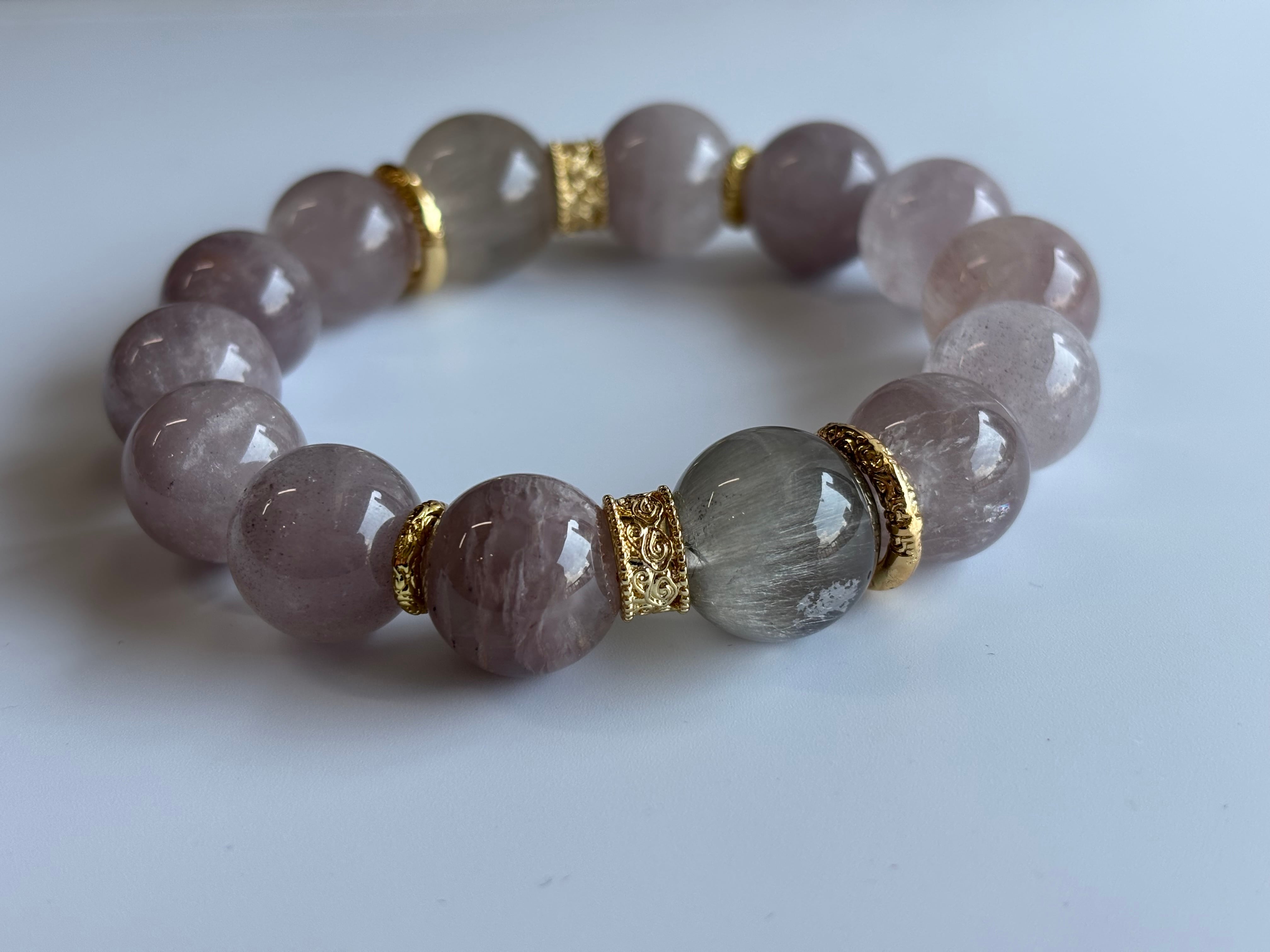 淡いくすみピンクがやわらかく広がるリチウムクォーツに、グレー〜シルバーカラーのサゲニティックを合わせた、落ち着いた色気を感じるニュアンスカラーの大人デザインブレスレットです。