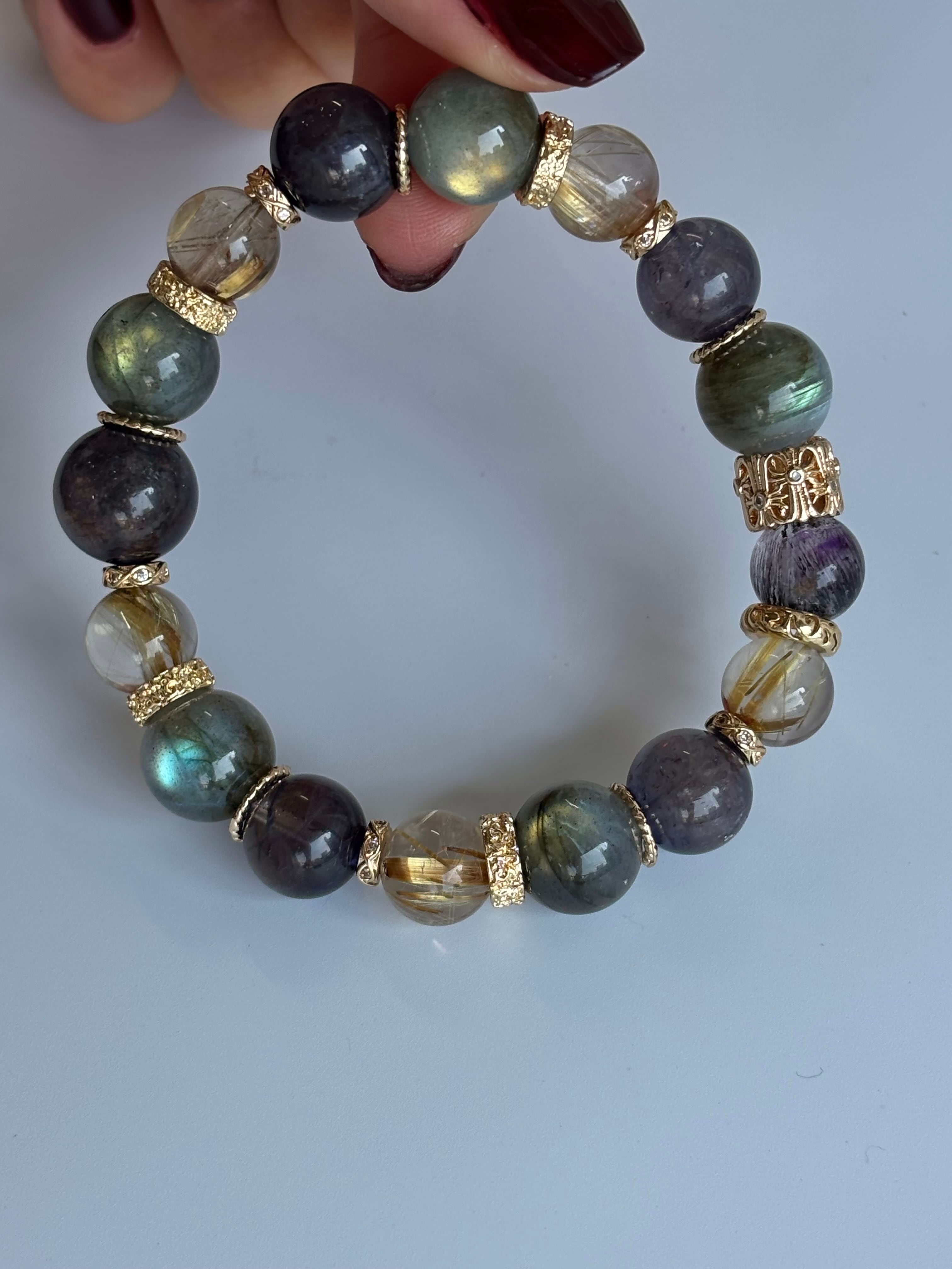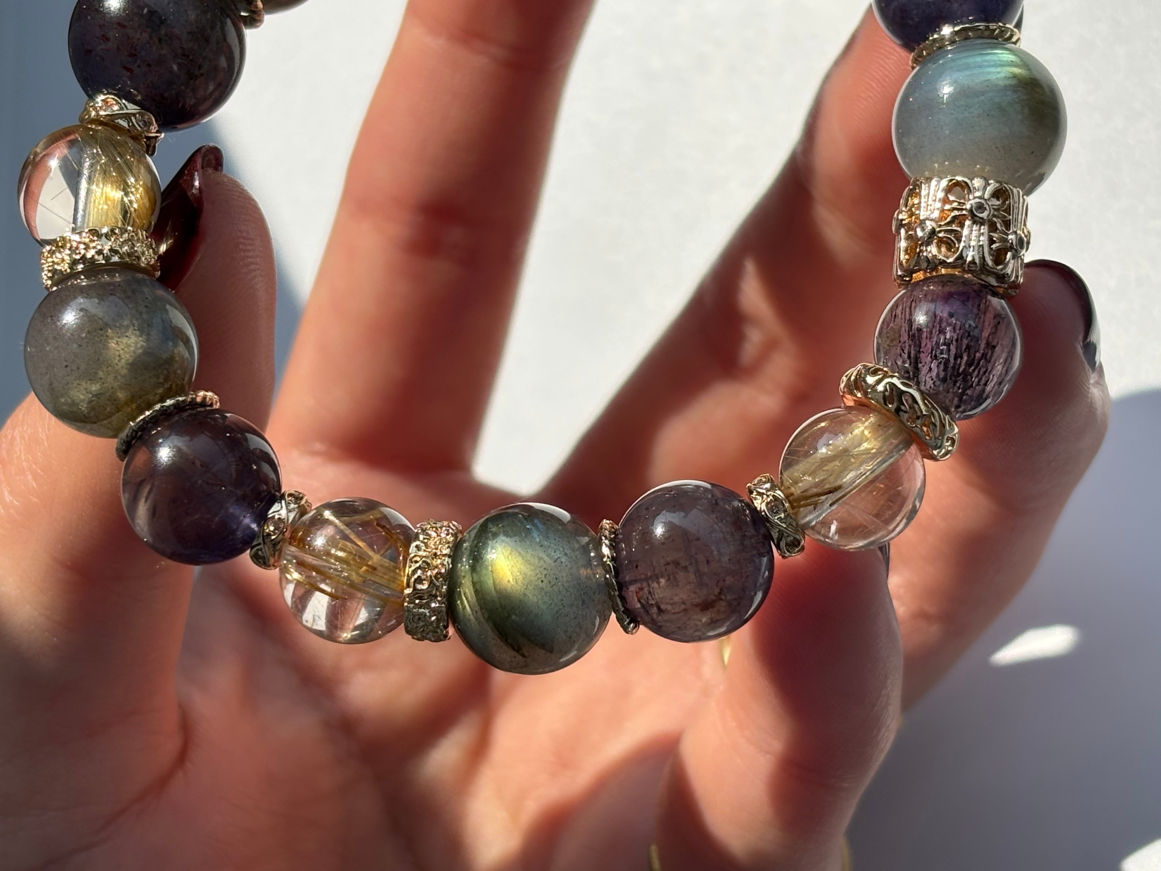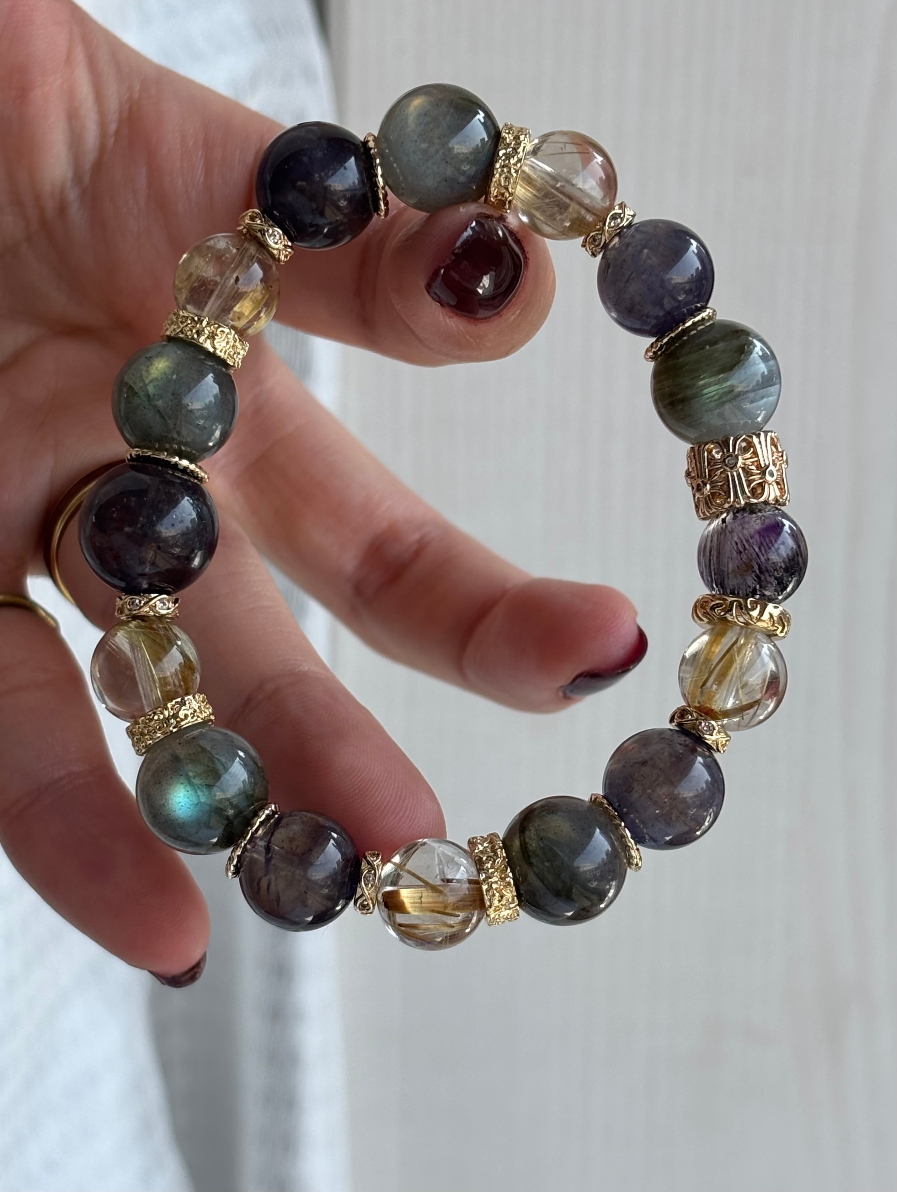 スーパーセブンゲーサイト、ルチル、ラブラドライト、アイオライトサンストーンを組み合わせた、光の重なりを楽しめるデザインブレスレットです。